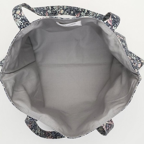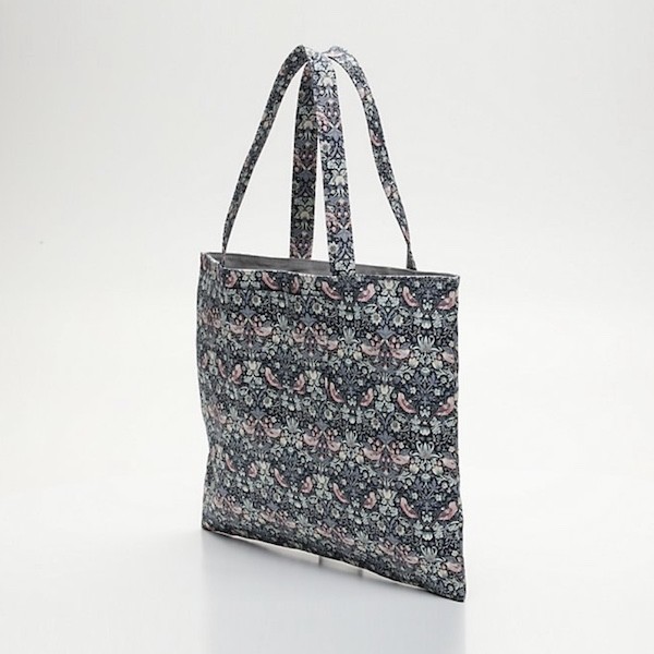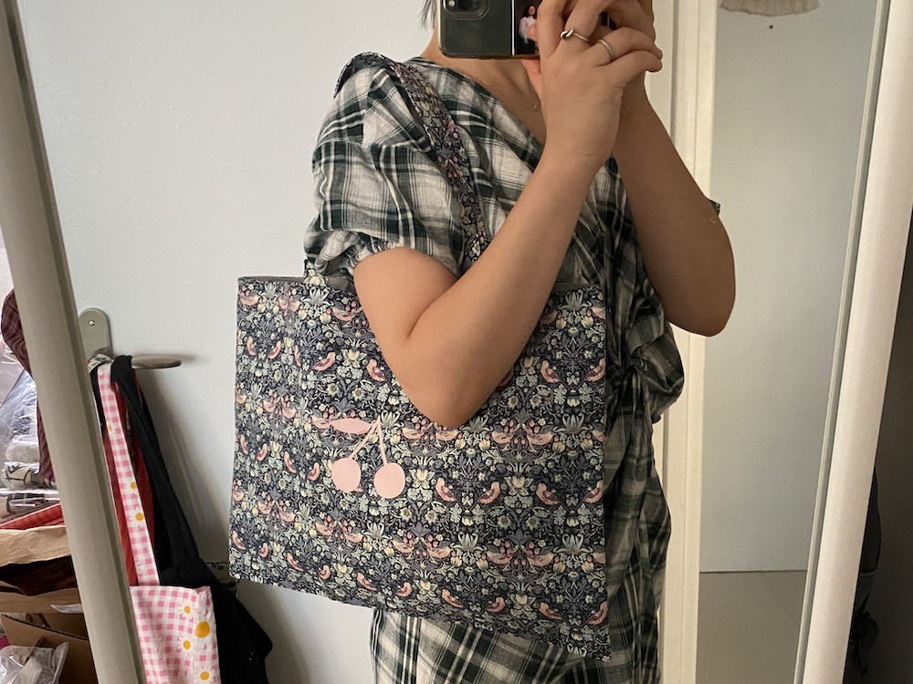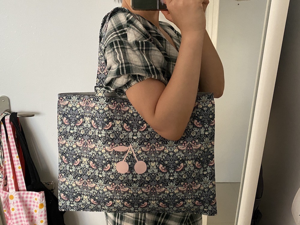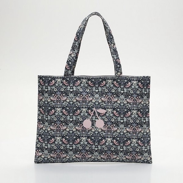 분홍색 새가 쪼로록 그려진 탄탄한 원단에 분홍색 체리가 프린트된 제품으로, 안감은 회색의 탄탄한 원단으로 한겹 더 박음질되어 있어 정말 튼튼하게 사용하실 수 있어요. 가방의 뒤쪽에는 작은 주머니도 달려 있어서 작은 물건들은 따로 담을 수 있어요.