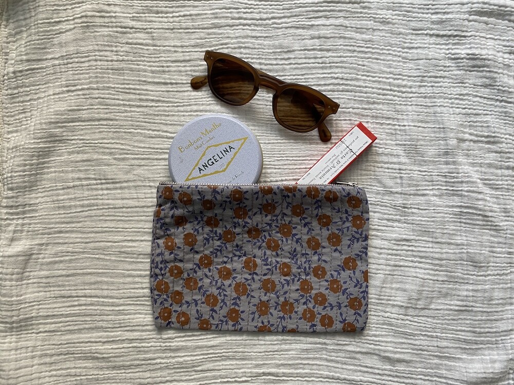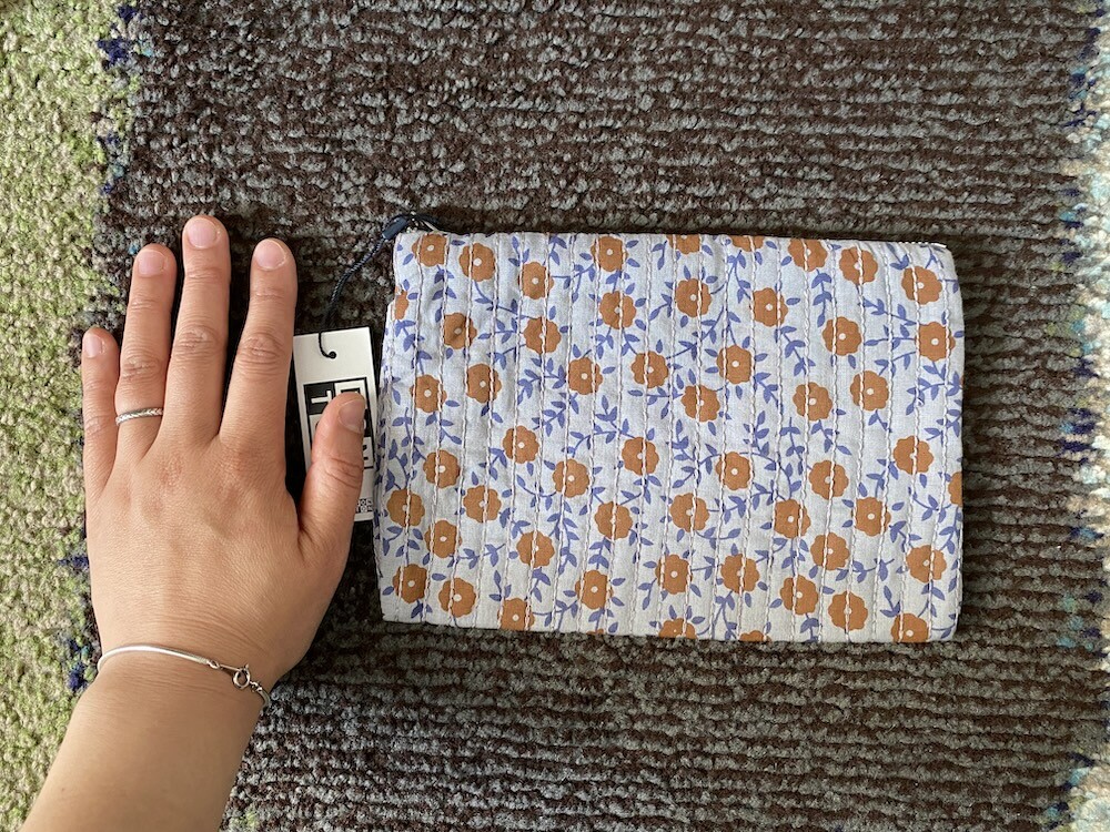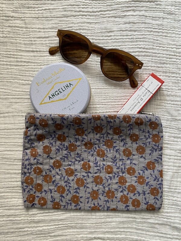 꽃 무늬의 면 원단에 실로 퀼트를 하여 빈티지한 느낌이 나는 파우치로, 선글라스까지 들어가는 사이즈라 이것저것 넣어 다니시기 편할 거예요.