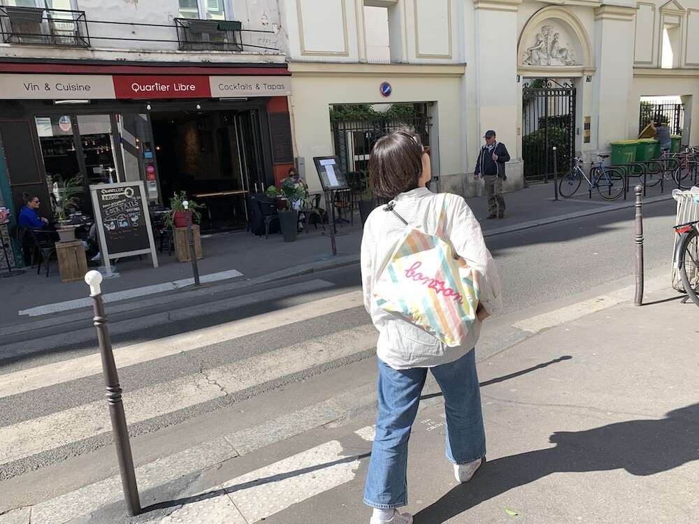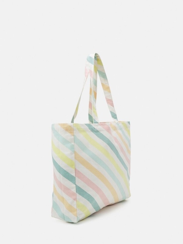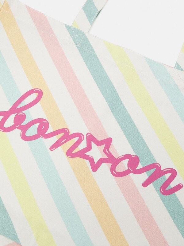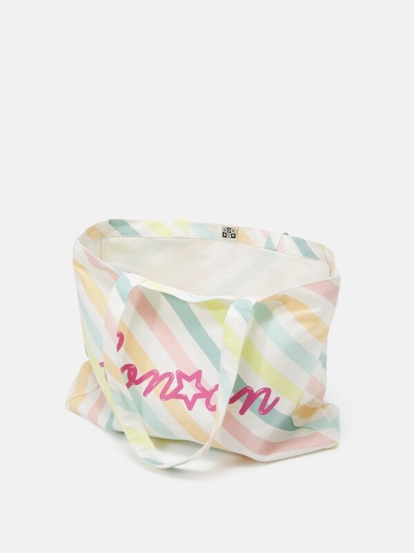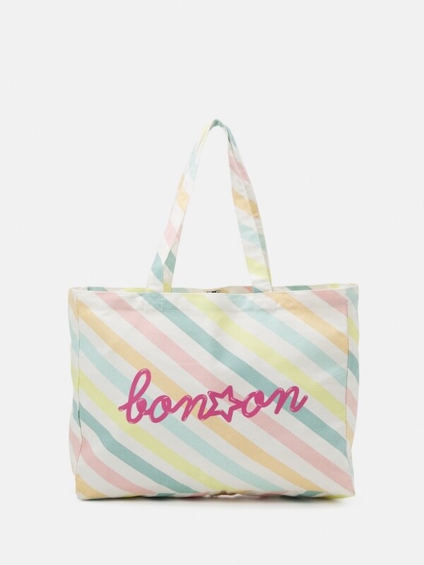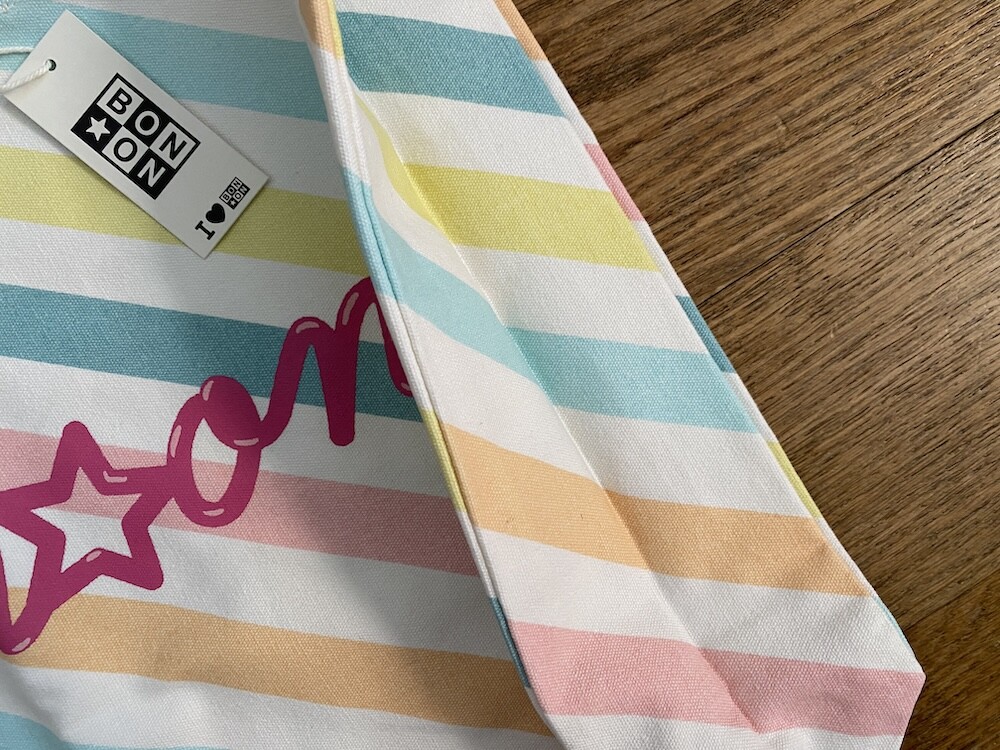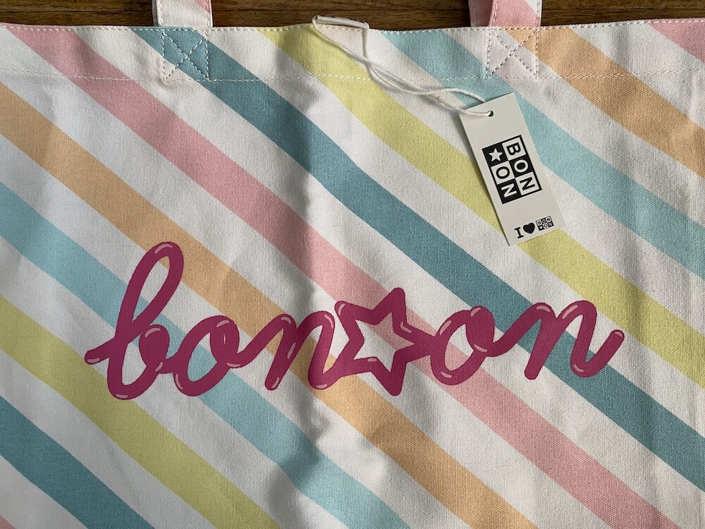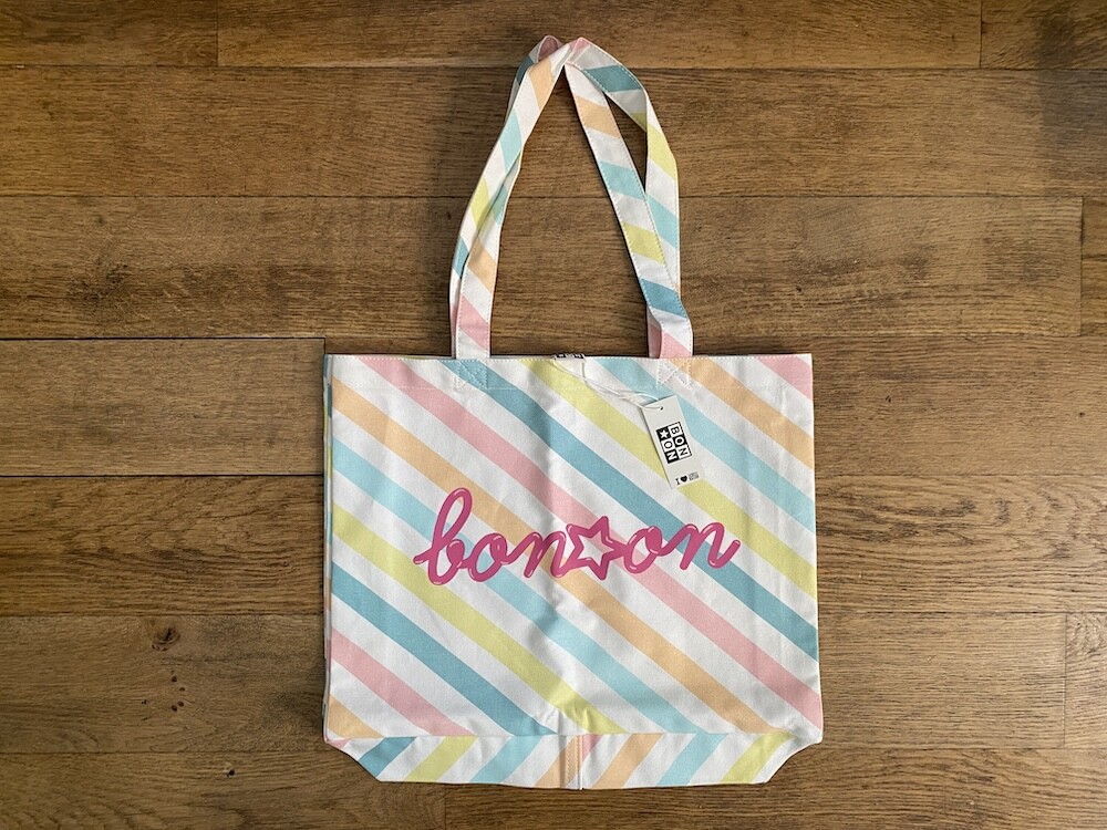 탄탄한 면 원단에 사탕을 떠올리는 색깔들로 줄무늬가 있는 가방이에요. 중간에 필기체와 별 모양으로 봉통 bonton이라는 글자가 써져 있는데, 입체감이 느껴지는 프린트라 더 귀여운 느낌이 들어요. 봉통에서 나오는 가방들 중 작은 사이즈라 이름은 '미니 카바스'이지만 실제로는 크기가 넉넉해서 이것저것 넣어 다니시기 좋을 거예요.