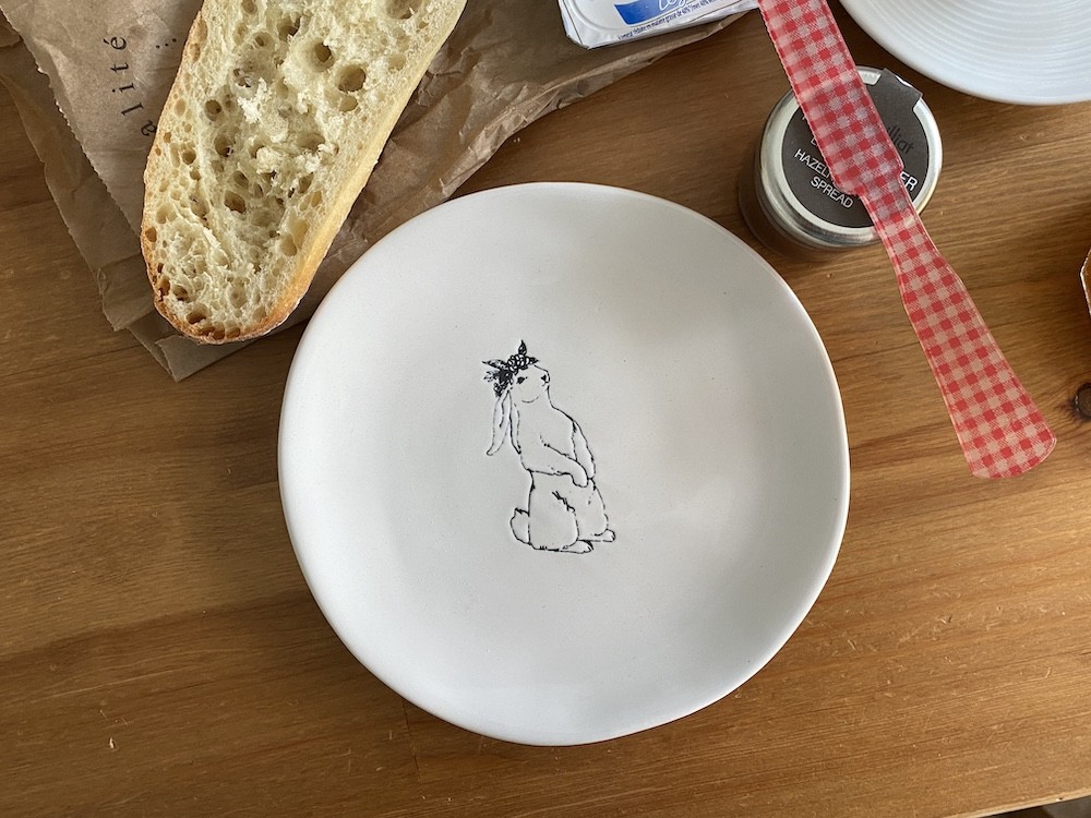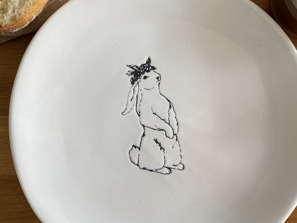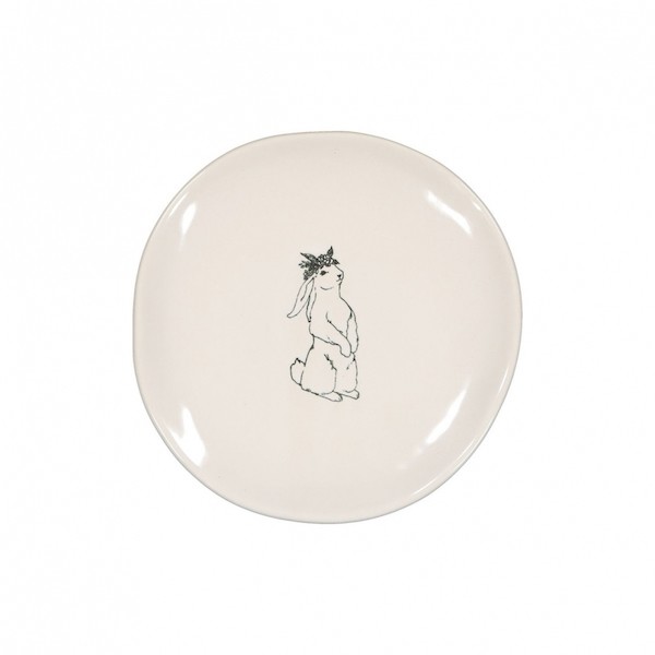 손으로 눌러 만든 것 같은 자연스러운 모양에 화관을 쓴 토끼 모양이 음각으로 새겨져 있는 귀여운 접시로, 간식이나 작은 음식들을 담아놓으면 너무 예뻐요. 여기저기 사용하시기 좋을 거예요.