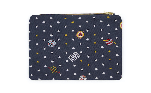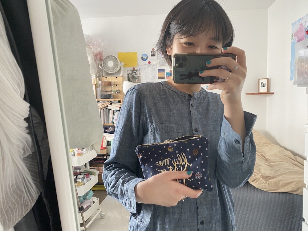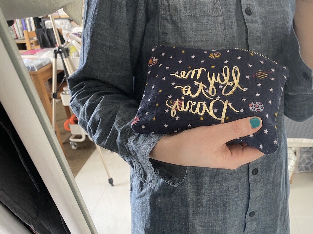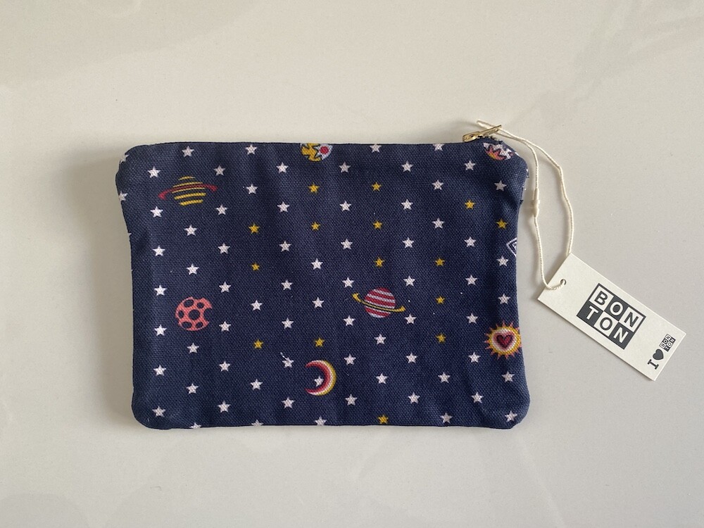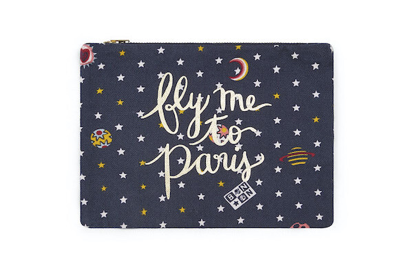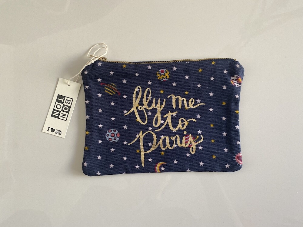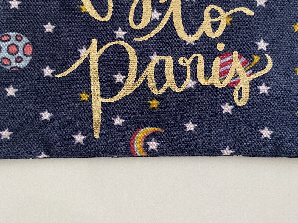 면 원단에 별과 우주를 프린트한 후 금색으로 글씨를 얹은 파우치예요. "fly me to Paris 나를 파리로 데려다 줘요" 라는 말이 너무 우리의 마음을 잘 표현한 것 같아요. 글씨는 예쁘고 그림은 귀여워서 기분까지 좋아지는 파우치입니다.