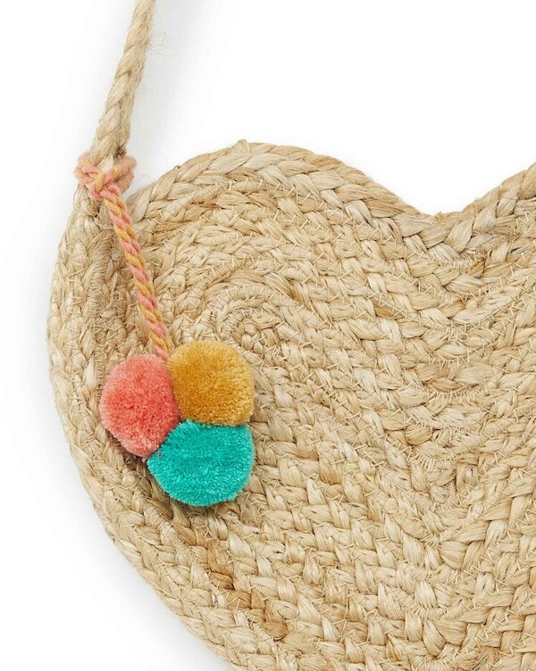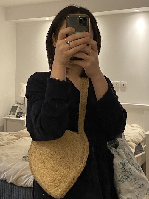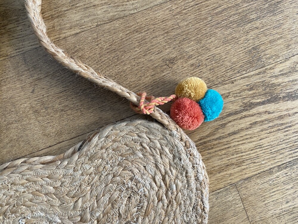 천연 짚을 튼튼하게 엮어 만든 가방이에요. 어린이용으로 나온 제품이지만 성인분들께서 사용하셔도 좋은 크기예요. 특히 한국분들 체형에 잘 어울리는 크기라 봄에서 가을까지 잘 드실 수 있으실 거예요. 저는 크로스로 메는 걸 좋아해서 크로스로 메고 다니지만 어깨 한 쪽에 거는 게 더 편하실 거예요. 가방에 폼폼이 달려 있는데 그건 뺐다 꼈다 할 수 있으니 취향대로 사용해 주세요.