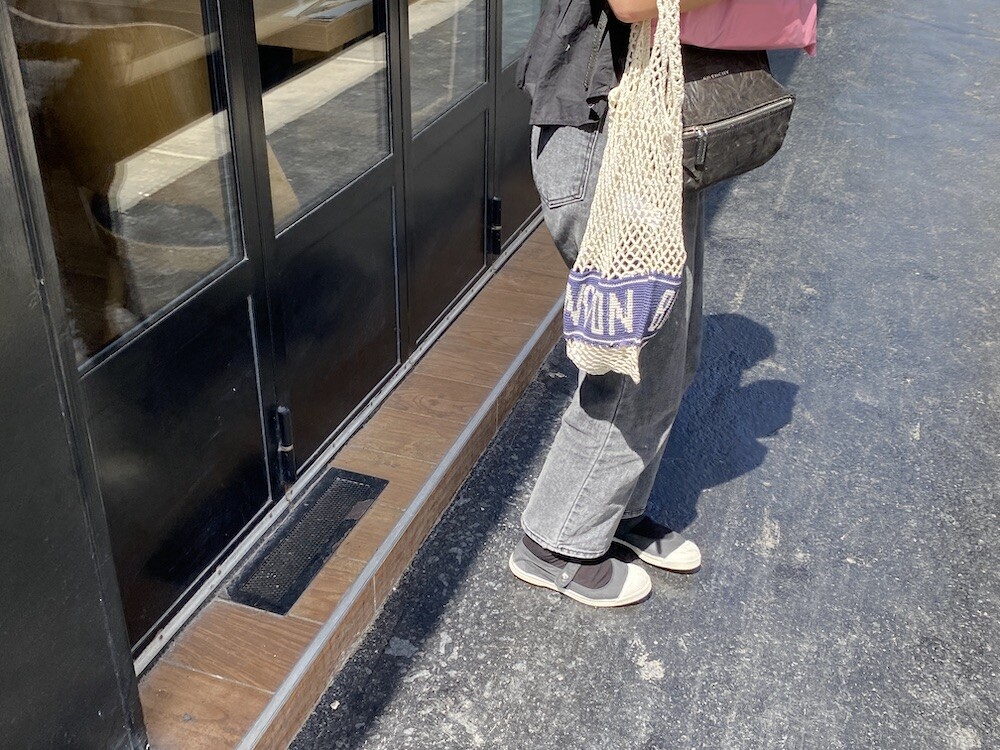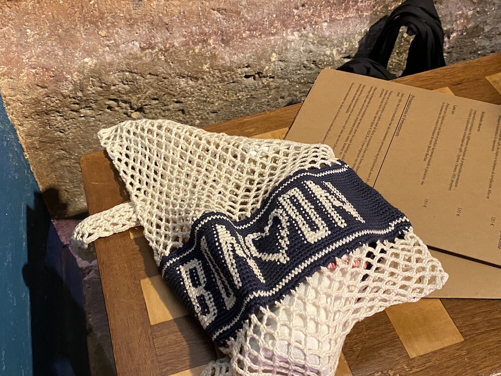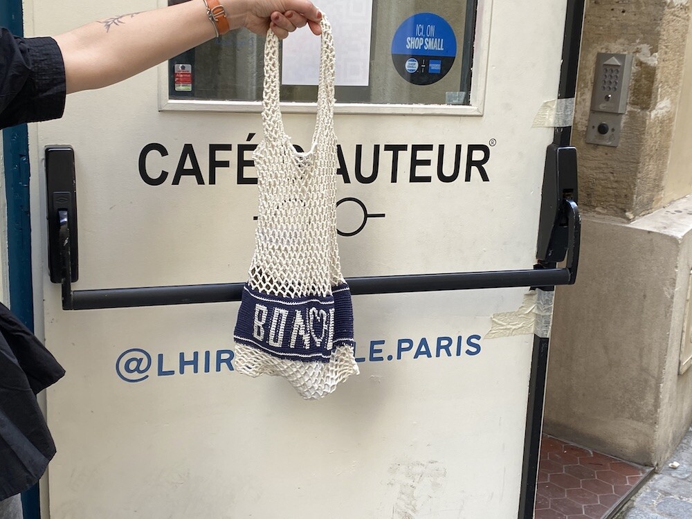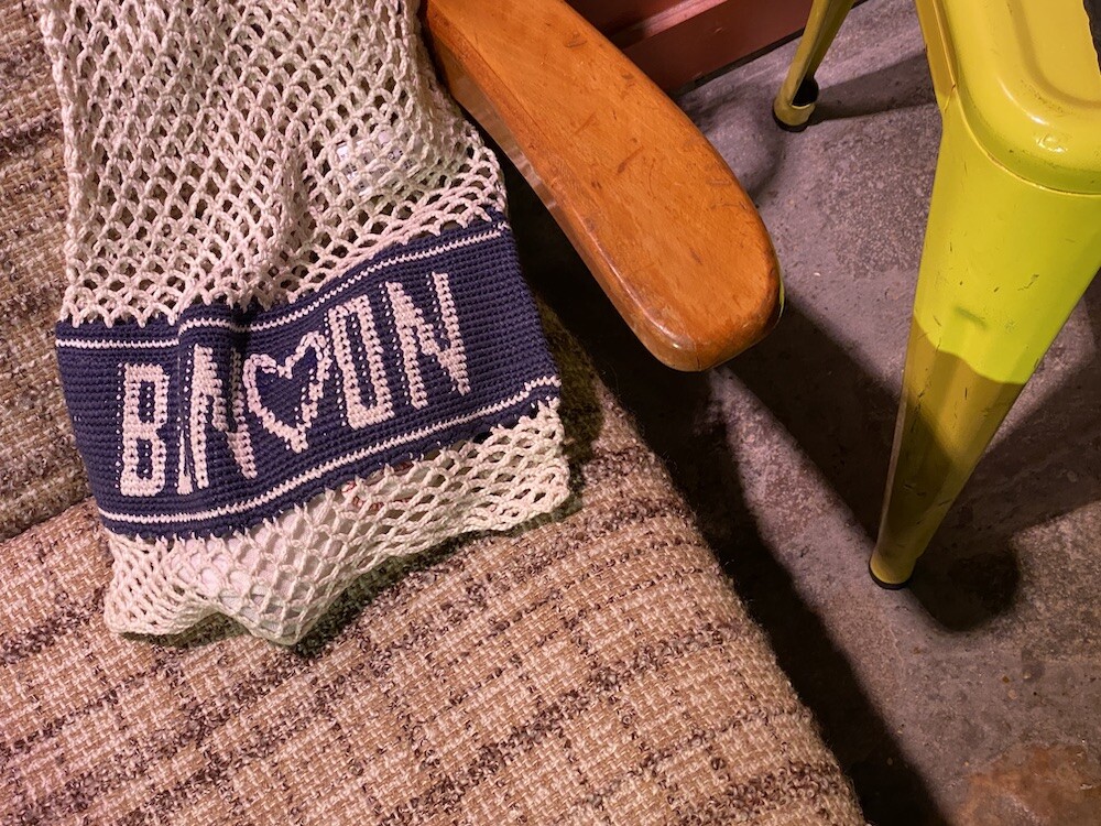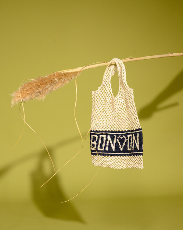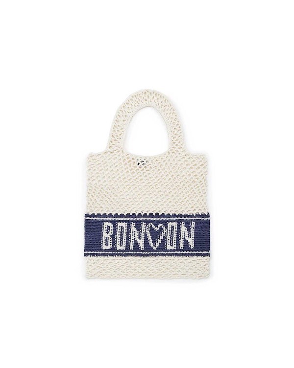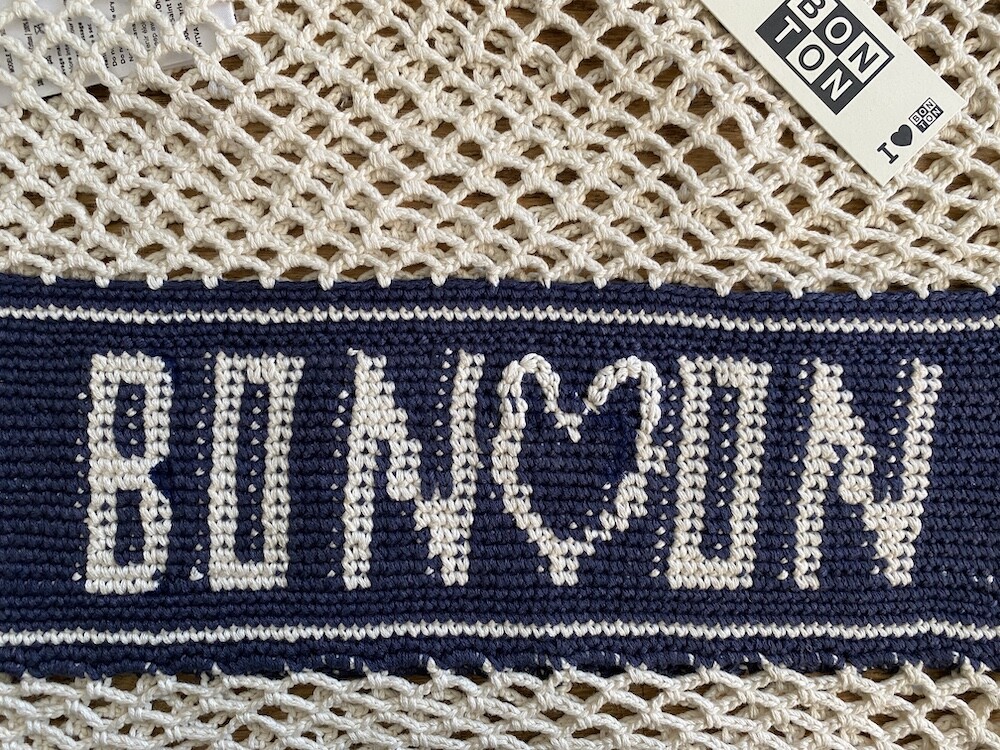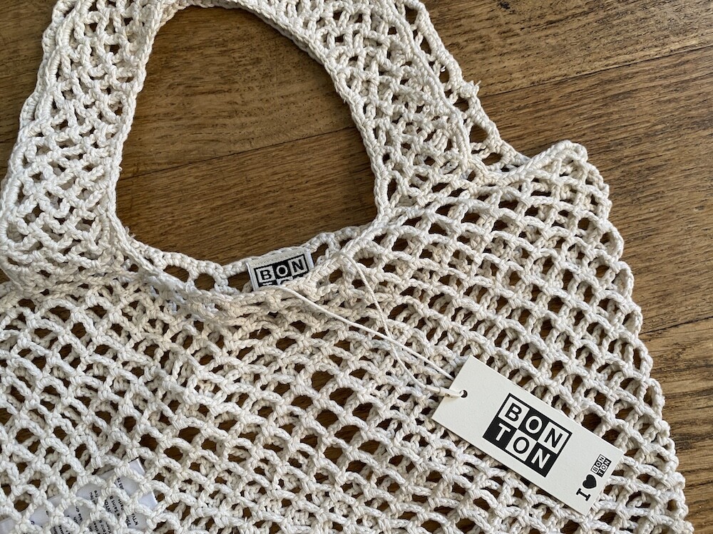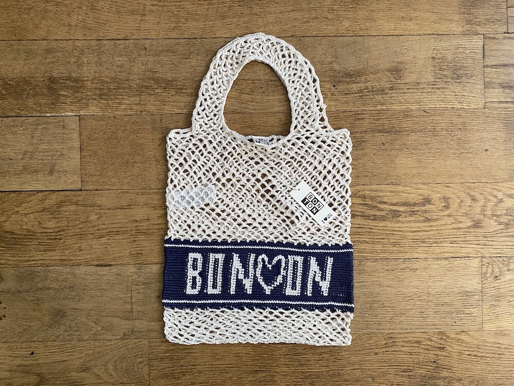 면사를 크로쉐로 뜨개질한 네트백이에요. 가방에 쏙 넣고 다니다가 장바구니로 사용하시면 좋을 거예요. 앞면과 뒷면에는 봉통이라고 뜨개질이 되어 있는데 BONTON에서 T를 빼고 하트를 넣은 게 정말 귀여워요.