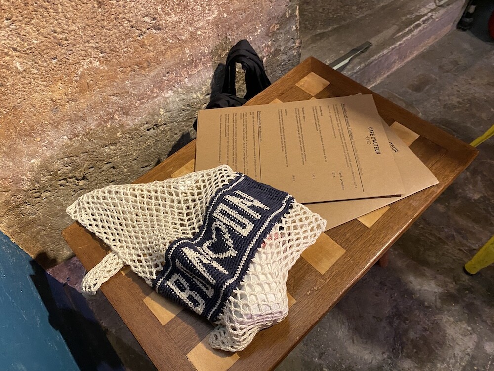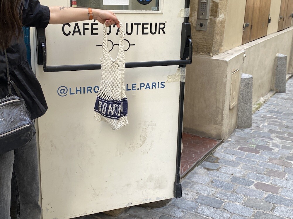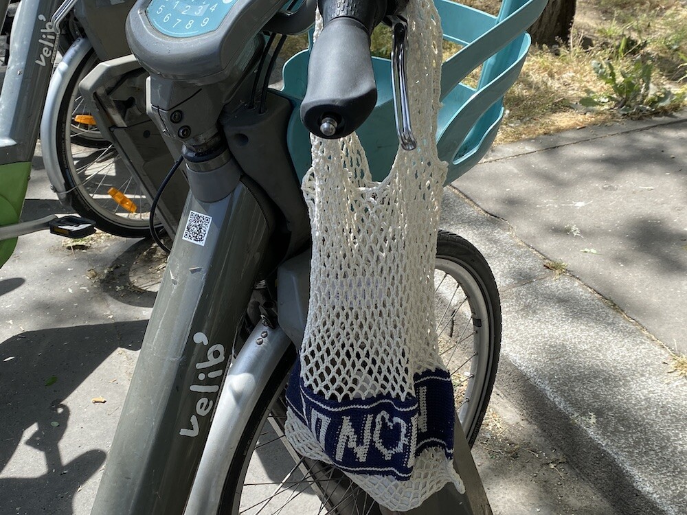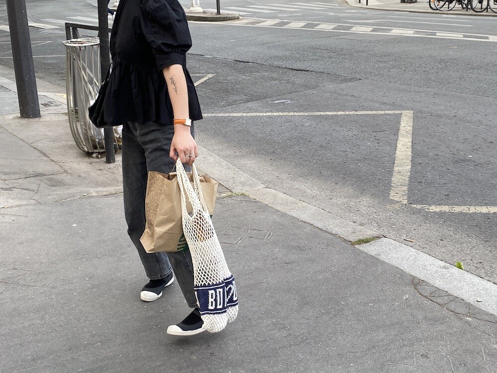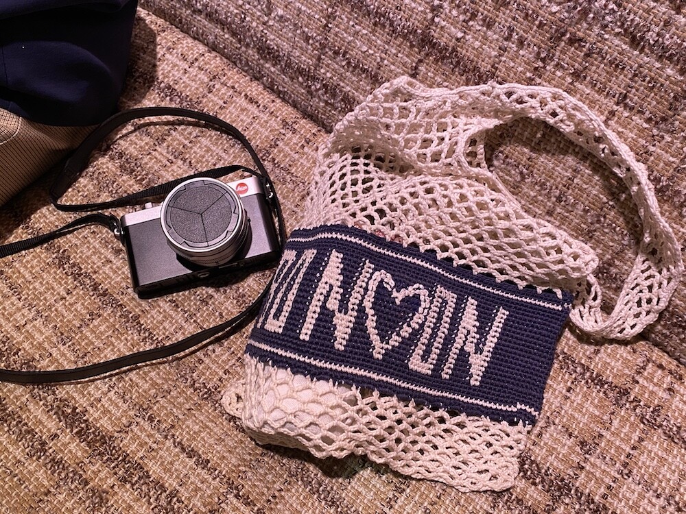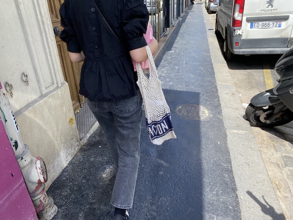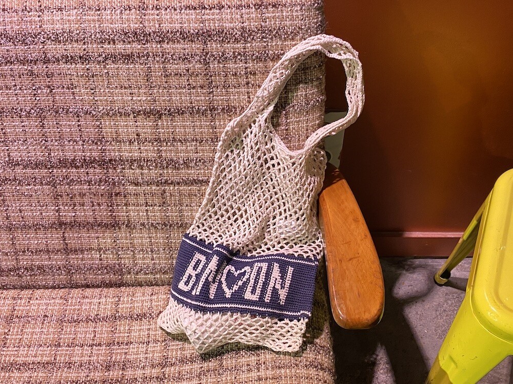 면사를 크로쉐로 뜨개질한 네트백이에요. 가방에 쏙 넣고 다니다가 장바구니로 사용하시면 좋을 거예요. 앞면과 뒷면에는 봉통이라고 뜨개질이 되어 있는데 BONTON에서 T를 빼고 하트를 넣은 게 정말 귀여워요.