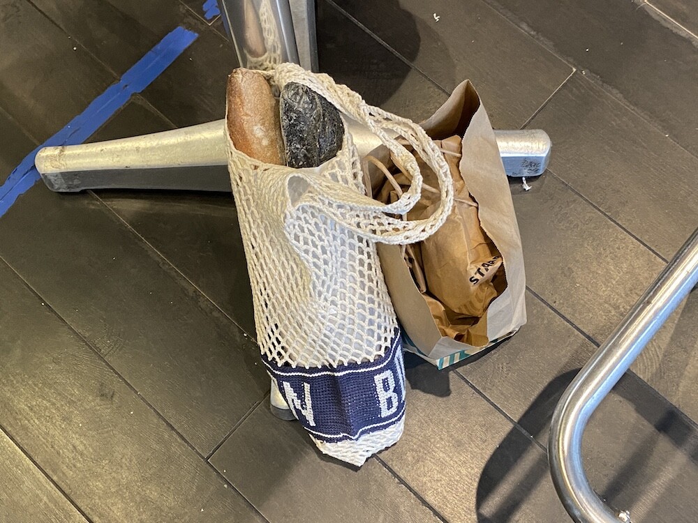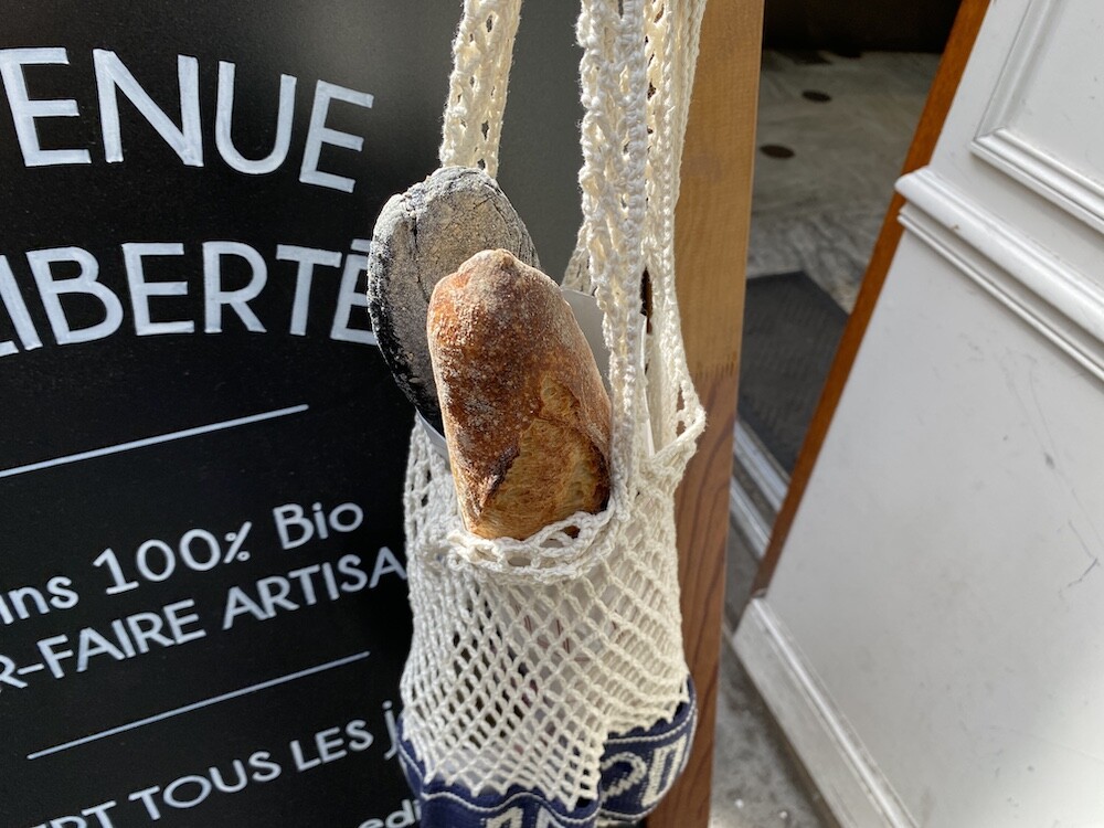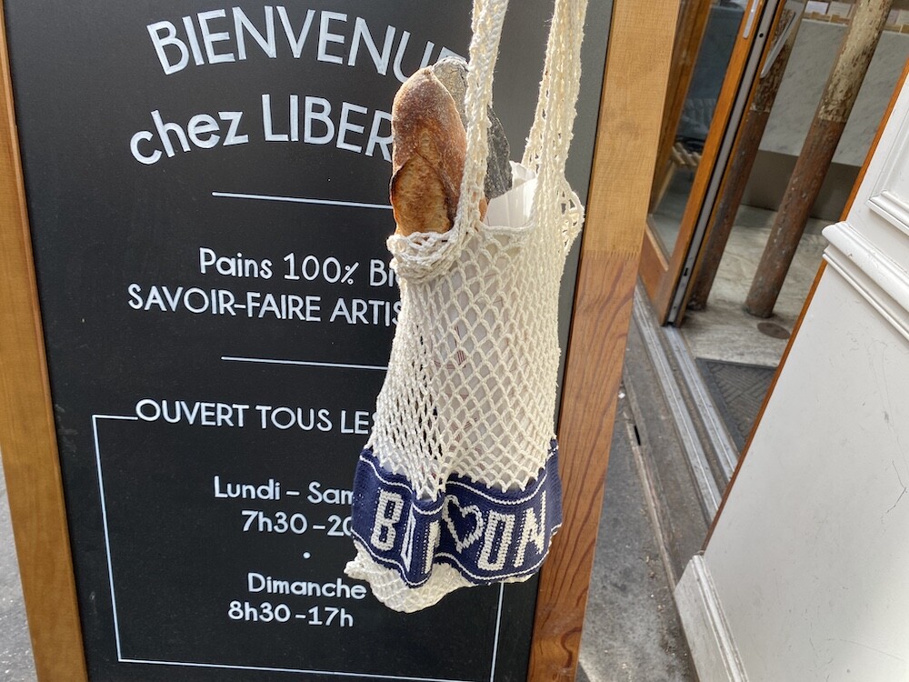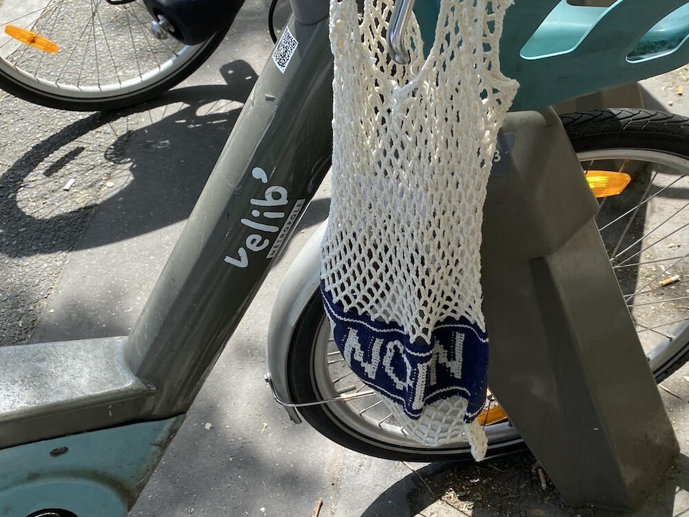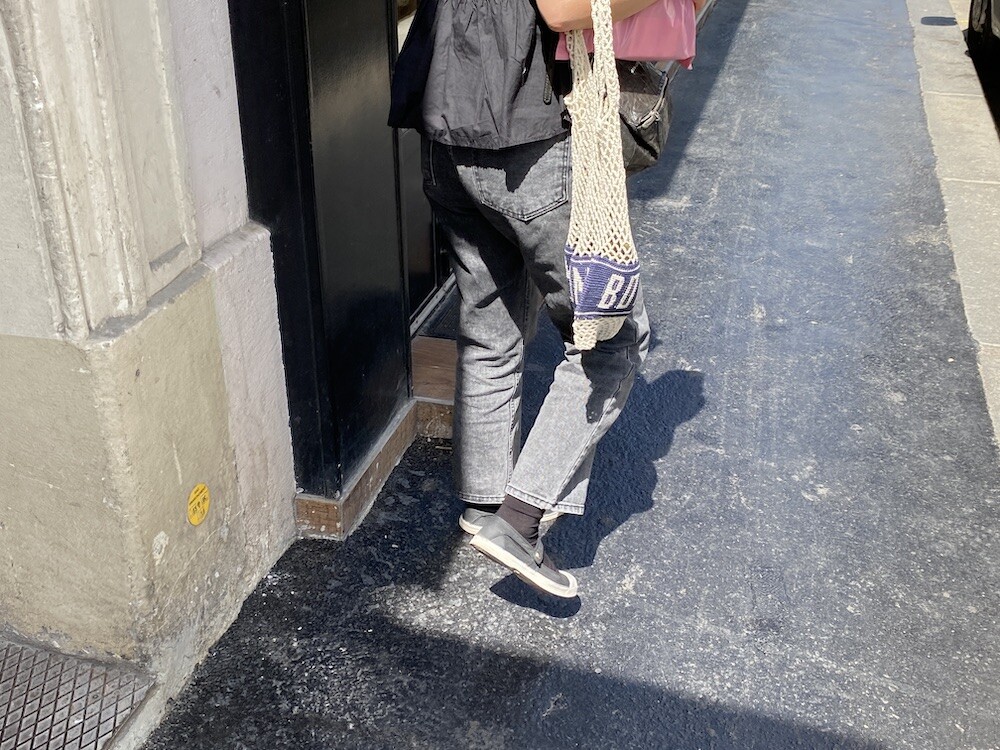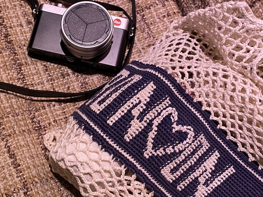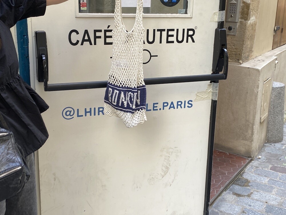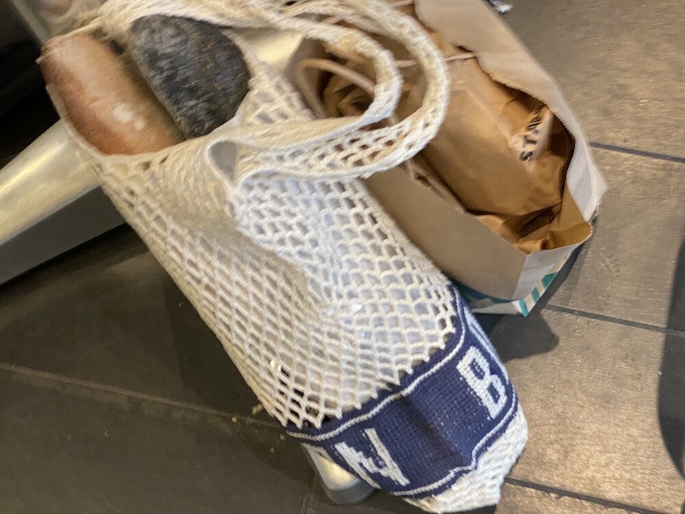 면사를 크로쉐로 뜨개질한 네트백이에요. 가방에 쏙 넣고 다니다가 장바구니로 사용하시면 좋을 거예요. 앞면과 뒷면에는 봉통이라고 뜨개질이 되어 있는데 BONTON에서 T를 빼고 하트를 넣은 게 정말 귀여워요.