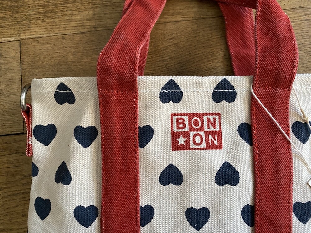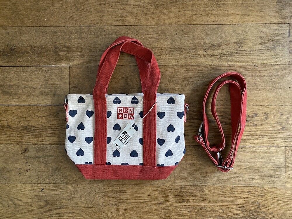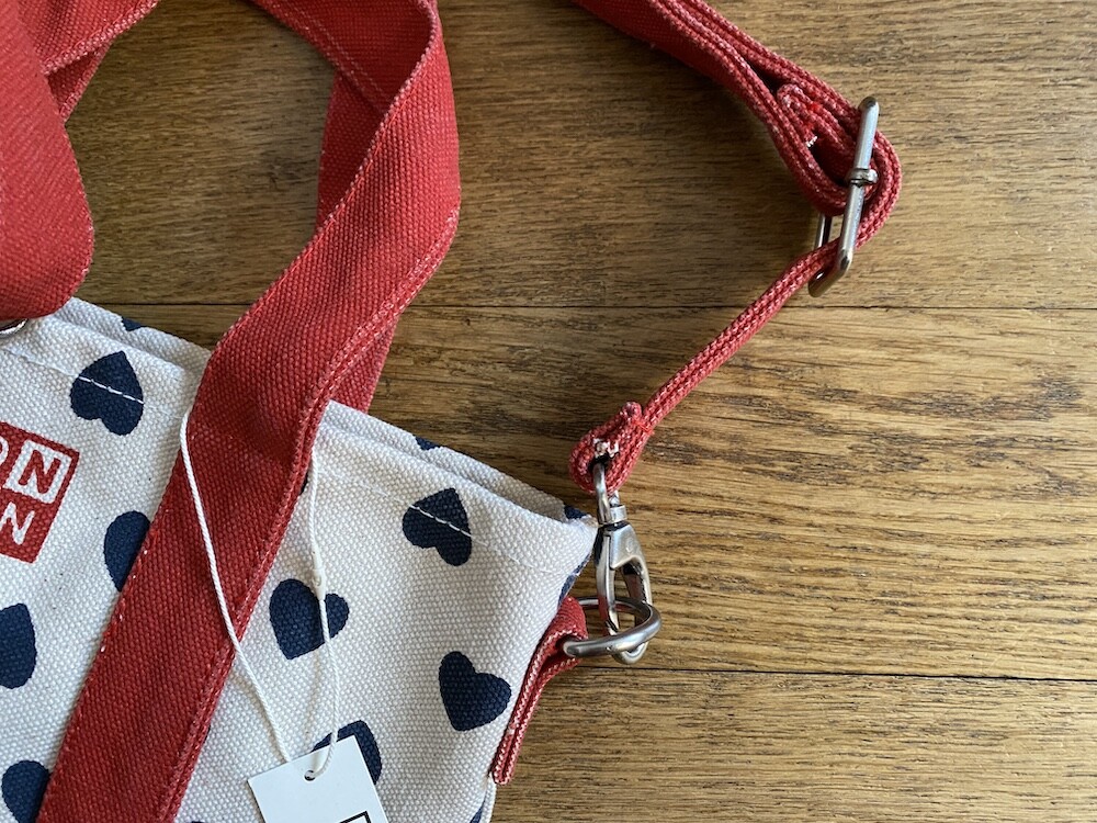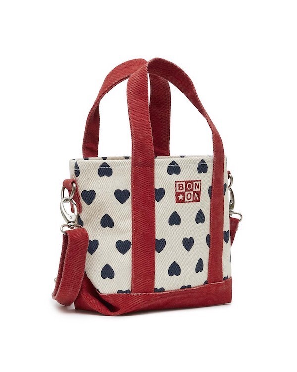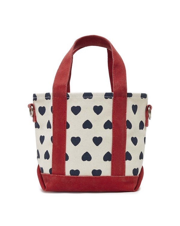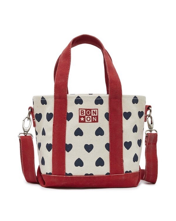 튼튼한 캔버스 소재에 귀여운 하트가 프린트된 가방이에요. 천이 얼마나 두꺼운지, 이걸 어떻게 박음질했나 궁금할 정도예요. 그 정도로 튼튼하고 각이 잘 잡혀 있어서 내구성있게 드시기 좋을 거예요.