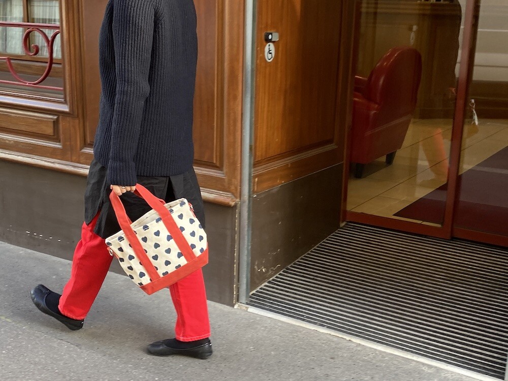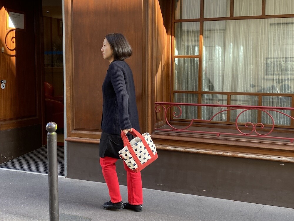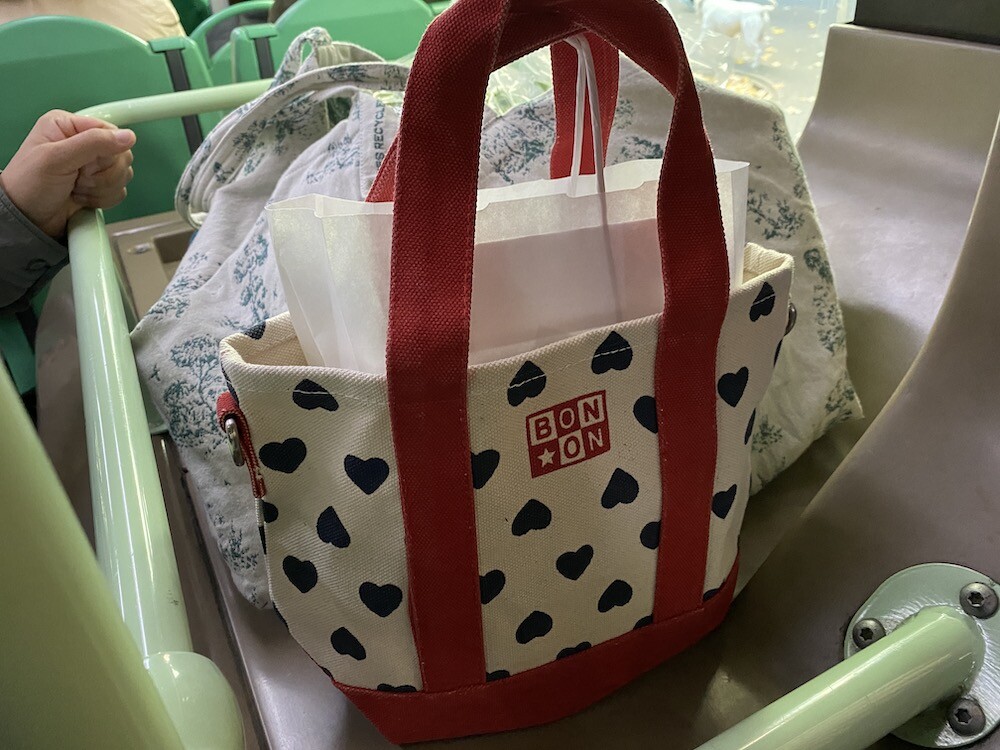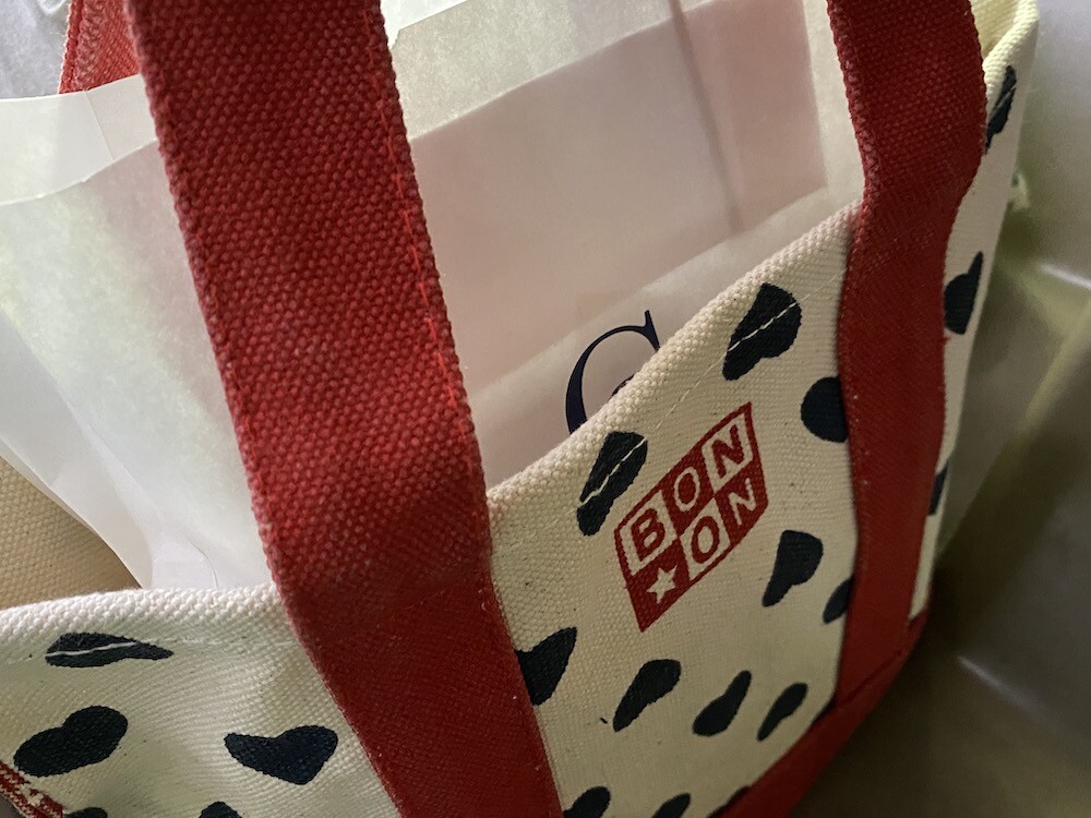튼튼한 캔버스 소재에 귀여운 하트가 프린트된 가방이에요. 천이 얼마나 두꺼운지, 이걸 어떻게 박음질했나 궁금할 정도예요. 그 정도로 튼튼하고 각이 잘 잡혀 있어서 내구성있게 드시기 좋을 거예요.