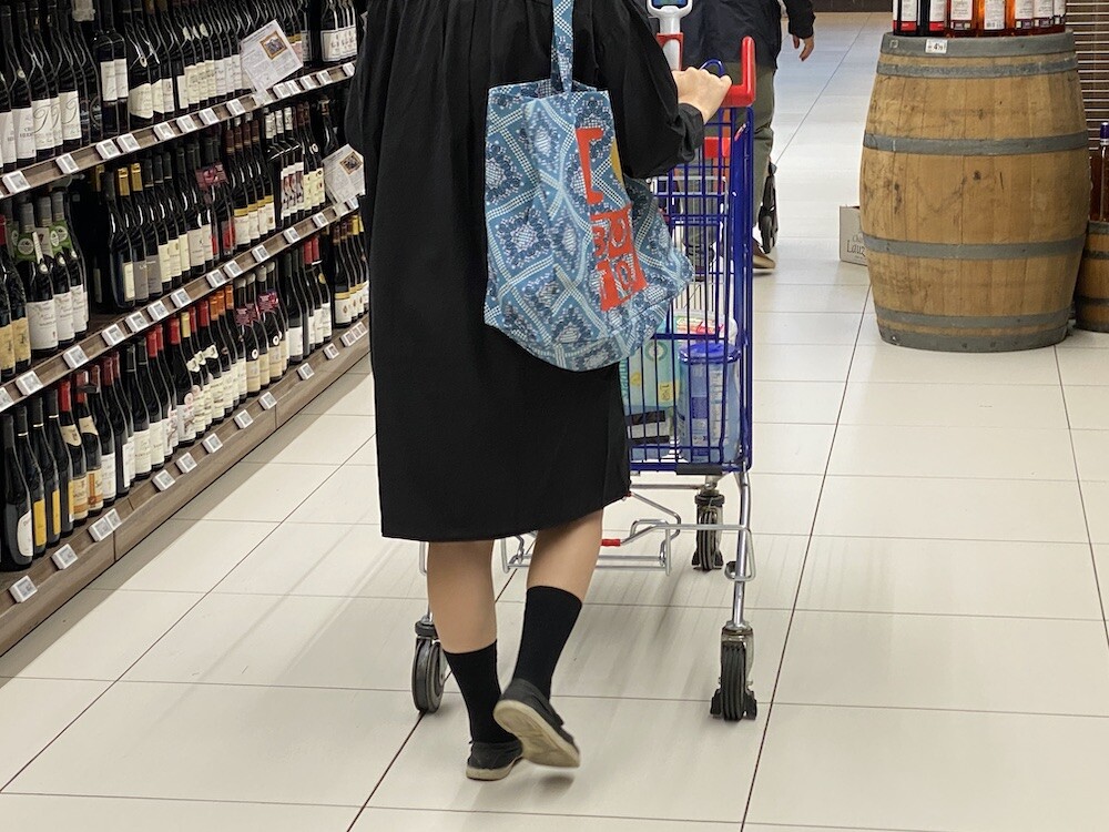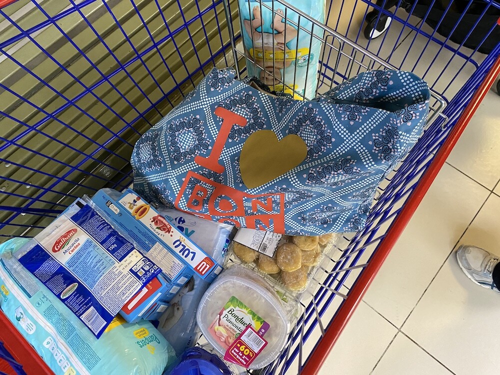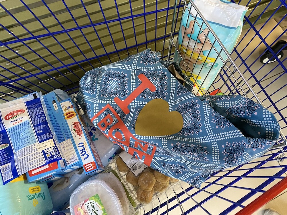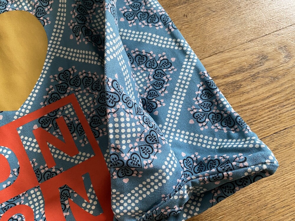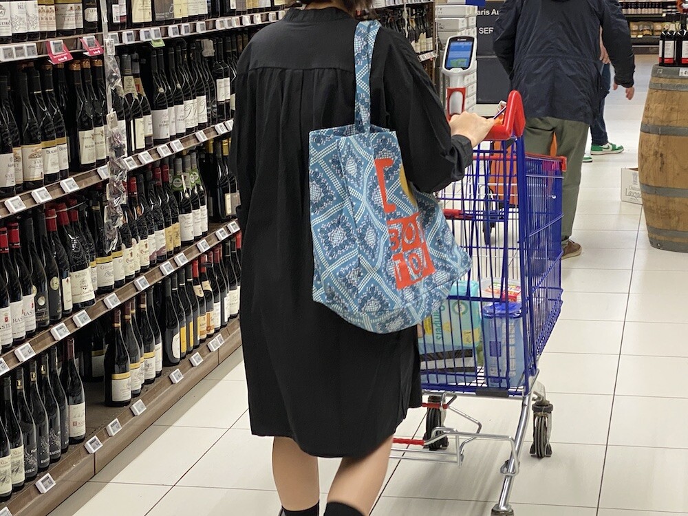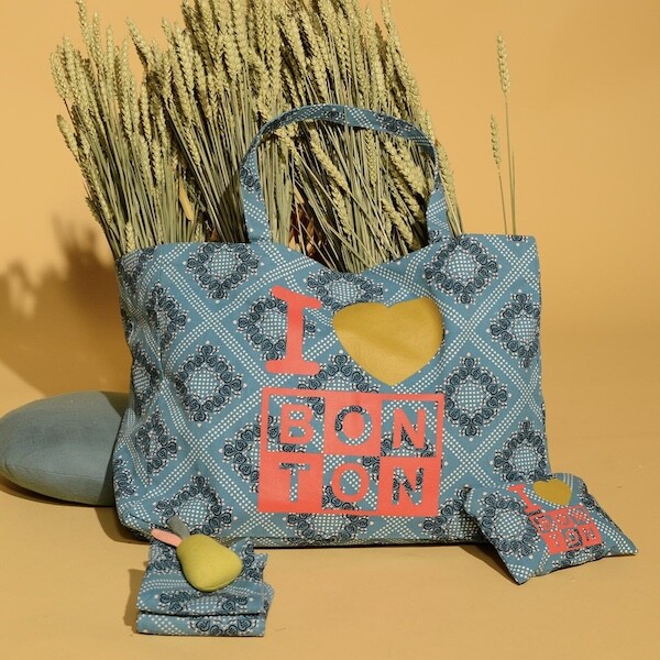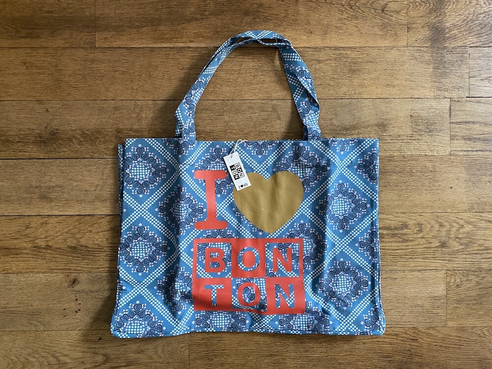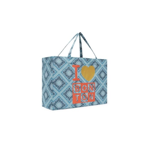 튼튼한 캔버스 소재에 반다나 패턴이 프린트된 가방이에요. 채도 낮은 파란색과 반다나 패턴도 예쁘고 몸통에 프린트된 '아이 러브 봉통 I love BONTON'이라는 글씨도 귀여워요. 박음질도 튼튼하고 소재도 탄탄해서 짐 많은 날에 드시기 좋을 거예요.