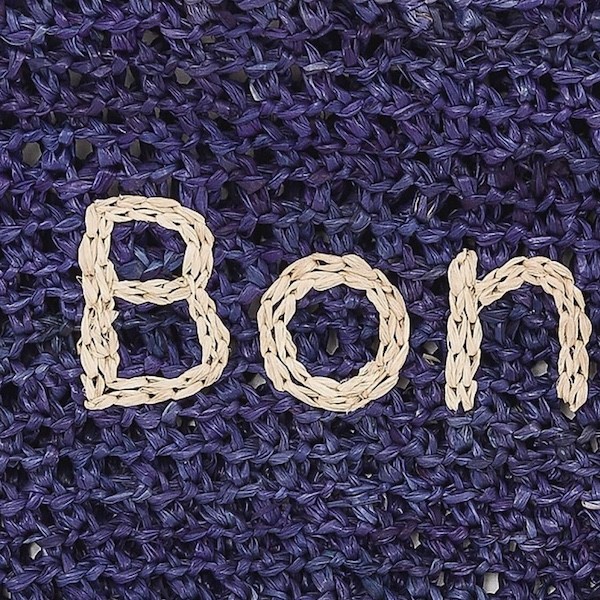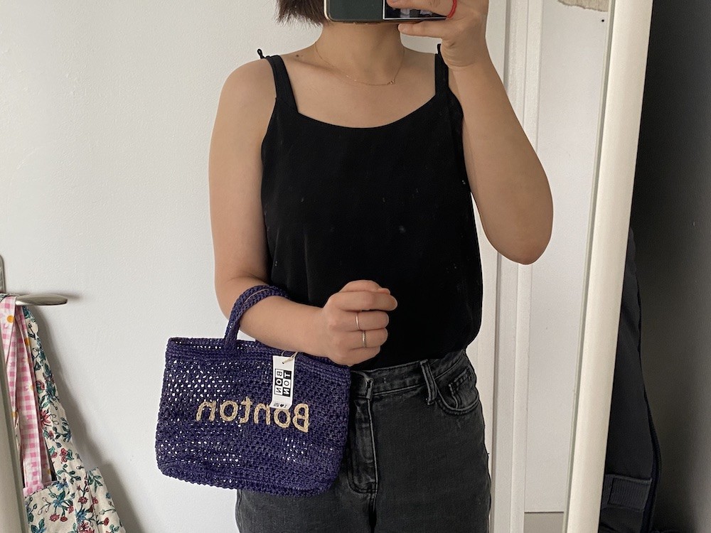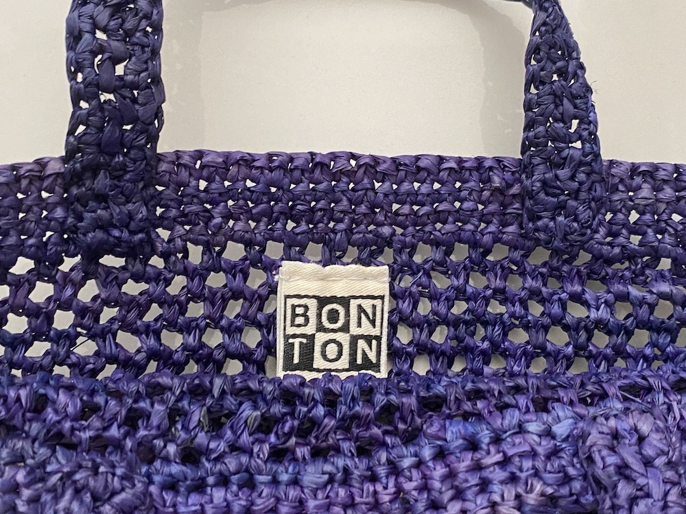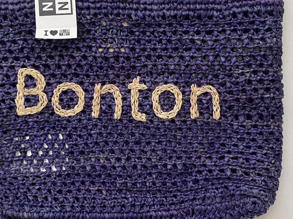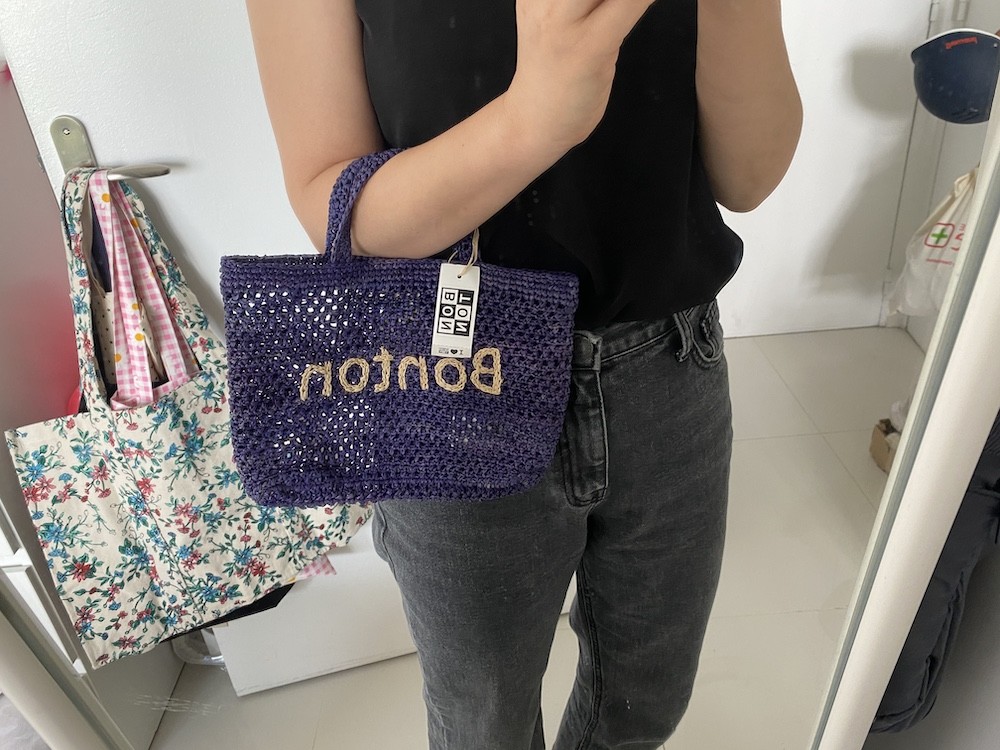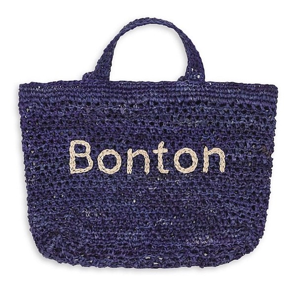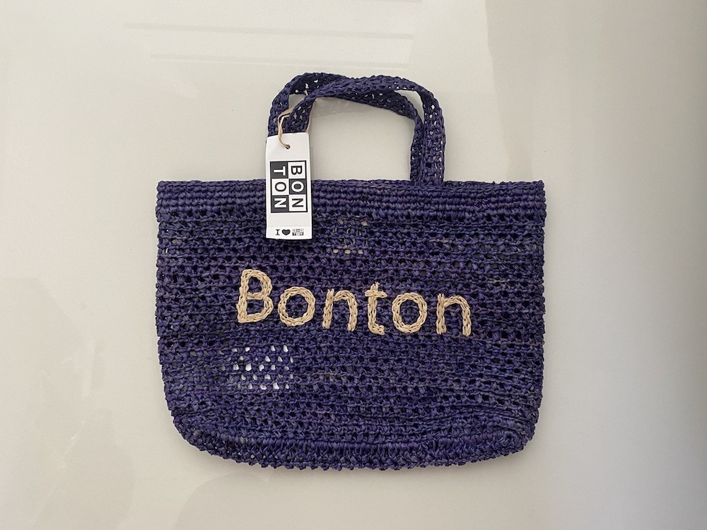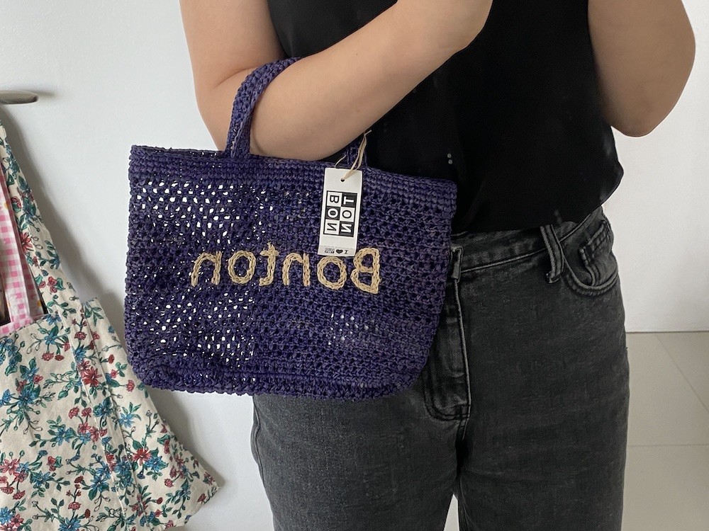 파란색으로 염색한 라피아를 크로셰로 엮은 제품으로, 어린이용으로 나온 제품이지만 한국 성인 여성 체형에도 잘 맞는 크기예요. 오히려 작은 사이즈라 팔에 끼고 다니기 딱 좋은 것 같아요. 앞면에 수 놓은 것처럼 새긴 BONTON이라는 글씨도 귀여워요.
