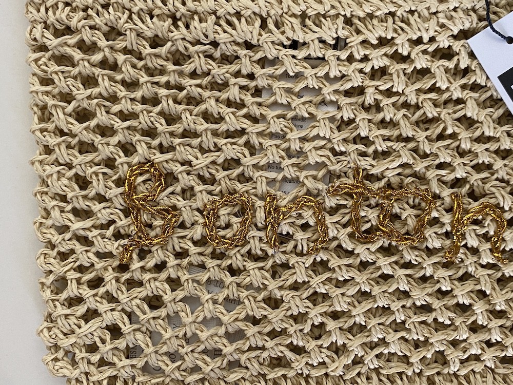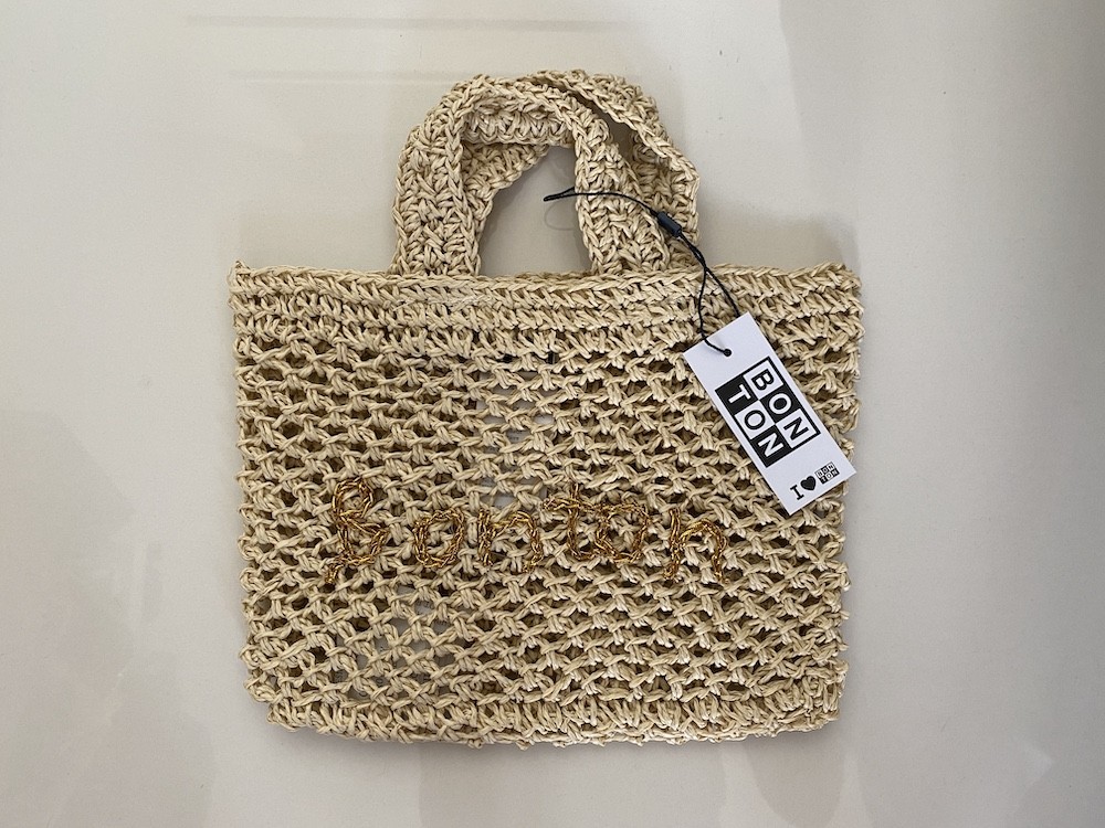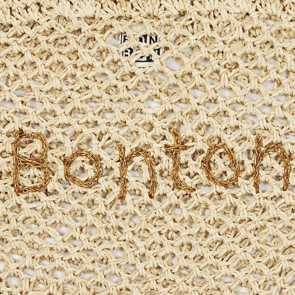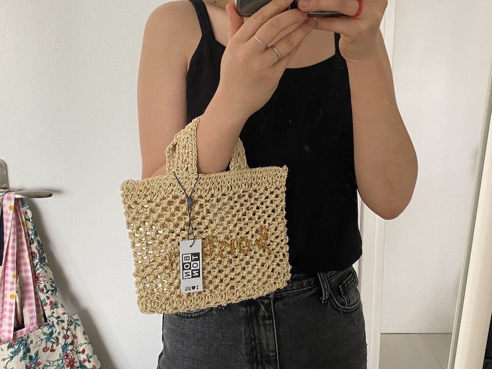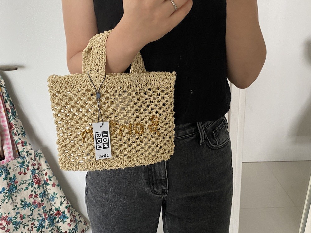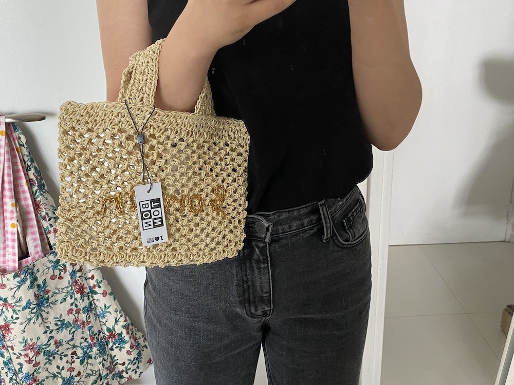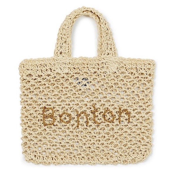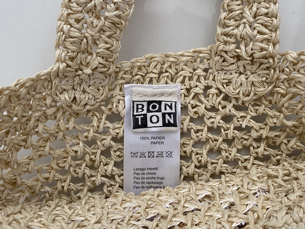 염색을 하지 않은 내추럴한 소재를 크로셰로 엮은 제품으로, 어린이용으로 나온 제품이지만 한국 성인 여성 체형에도 잘 맞는 크기예요. 오히려 작은 사이즈라 팔에 끼고 다니기 딱 좋은 것 같아요. 앞면에 수 놓은 것처럼 새긴 BONTON이라는 글씨도 귀여워요.