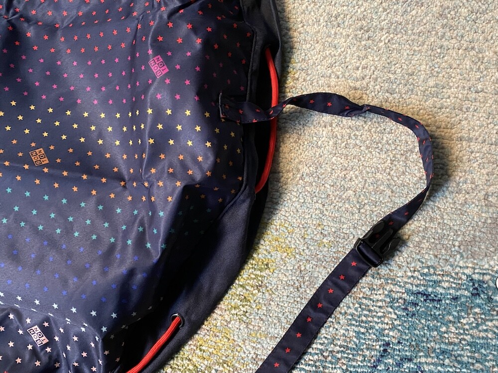 봉통의 아이코닉 별 패턴이 무지개 색깔로 프린트되어 있어서 예쁘고 바탕색이 남색이라 때 탈 걱정 없이 사용하실 수 있어요. 물빨래가 가능해서 더 실용적이기도 하고요. 아이 방 아무데나 걸어놓아도 인테리어의 한 부분이 될 것 같아요.