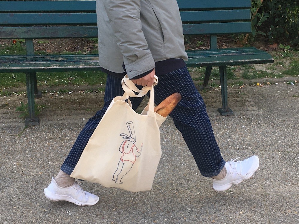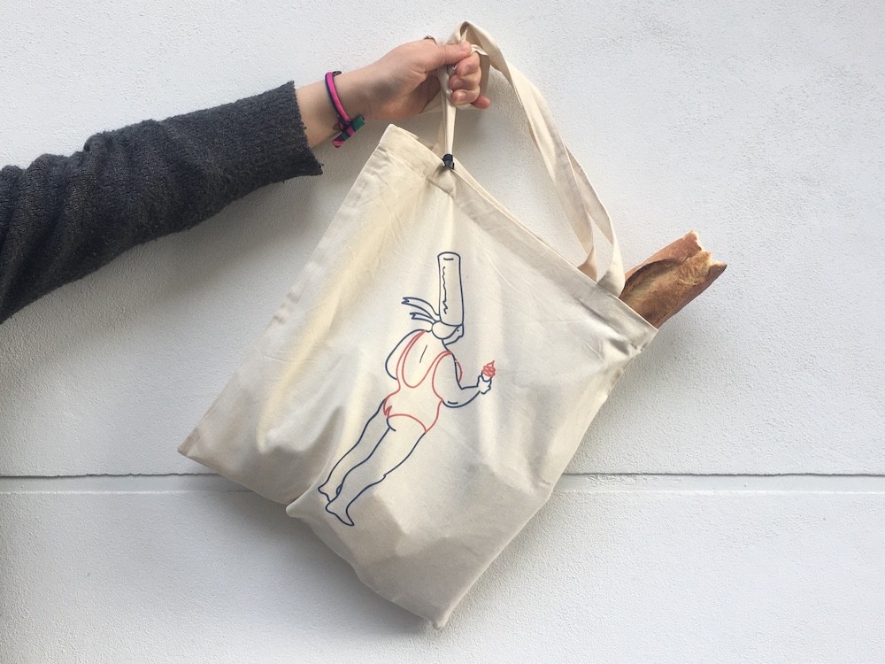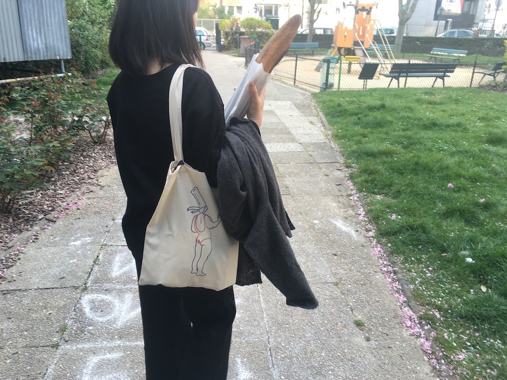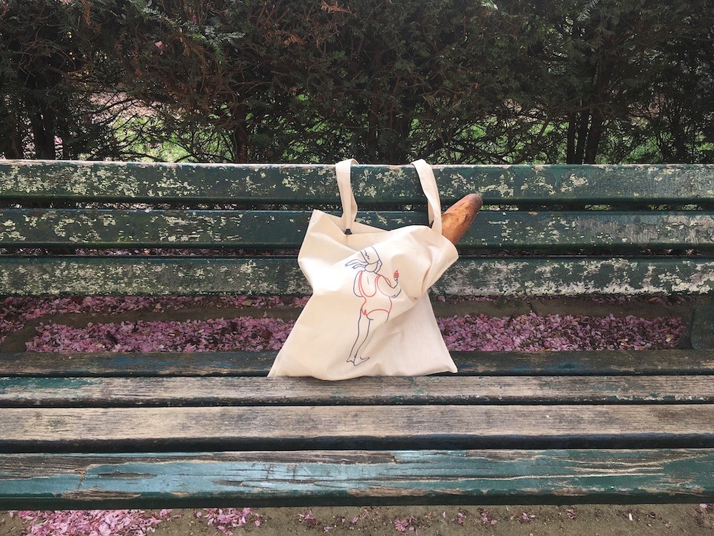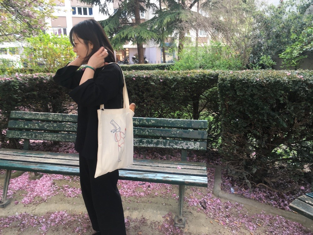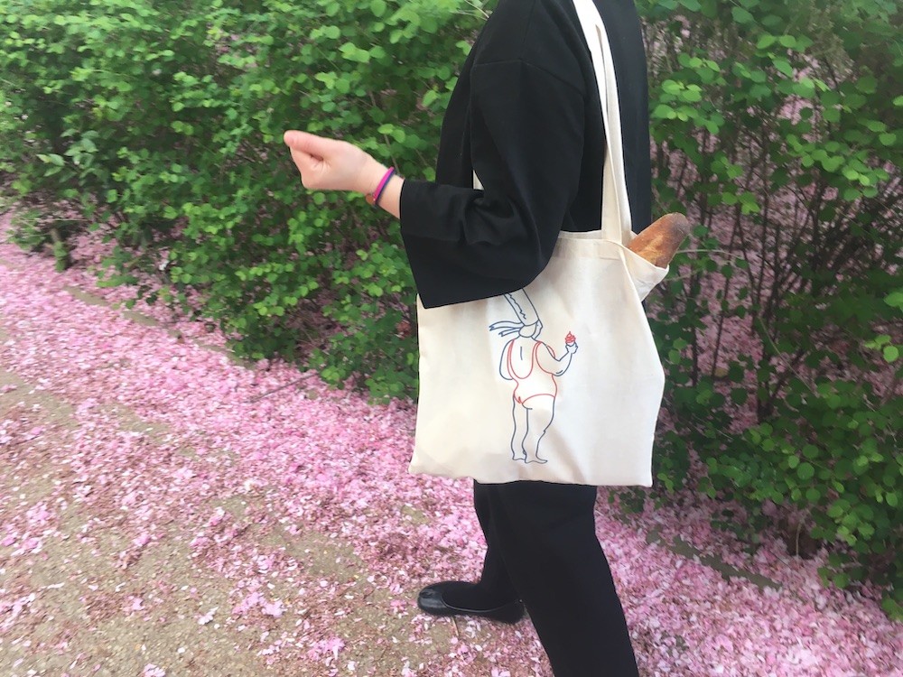 브르타뉴는 프랑스의 서쪽 윗부분에 있는 바닷가와 접한 지역이에요. 이 에코백은 수영을 하기 위해 빨간 수영복을 입은 여자를 귀엽게 그려놓았는데요, 몸매가 왠지 저를 보는 것 같아 애착이 많이 가는 가방이에요!