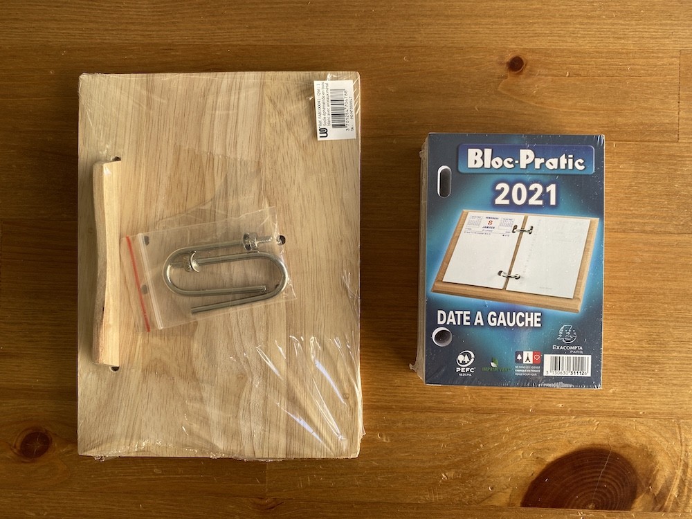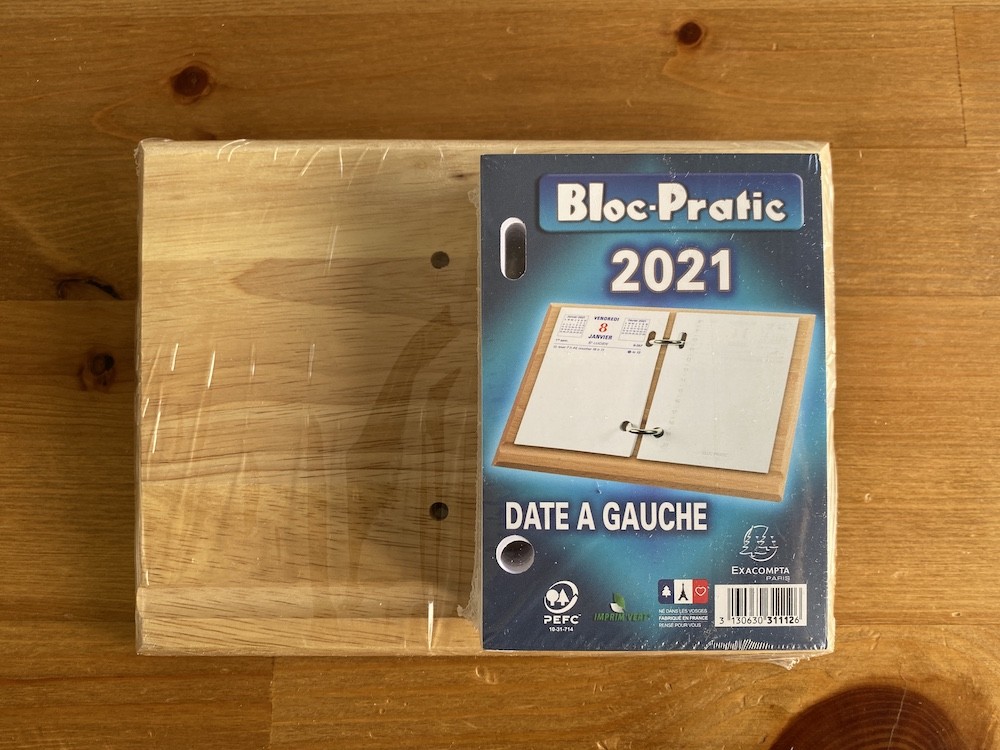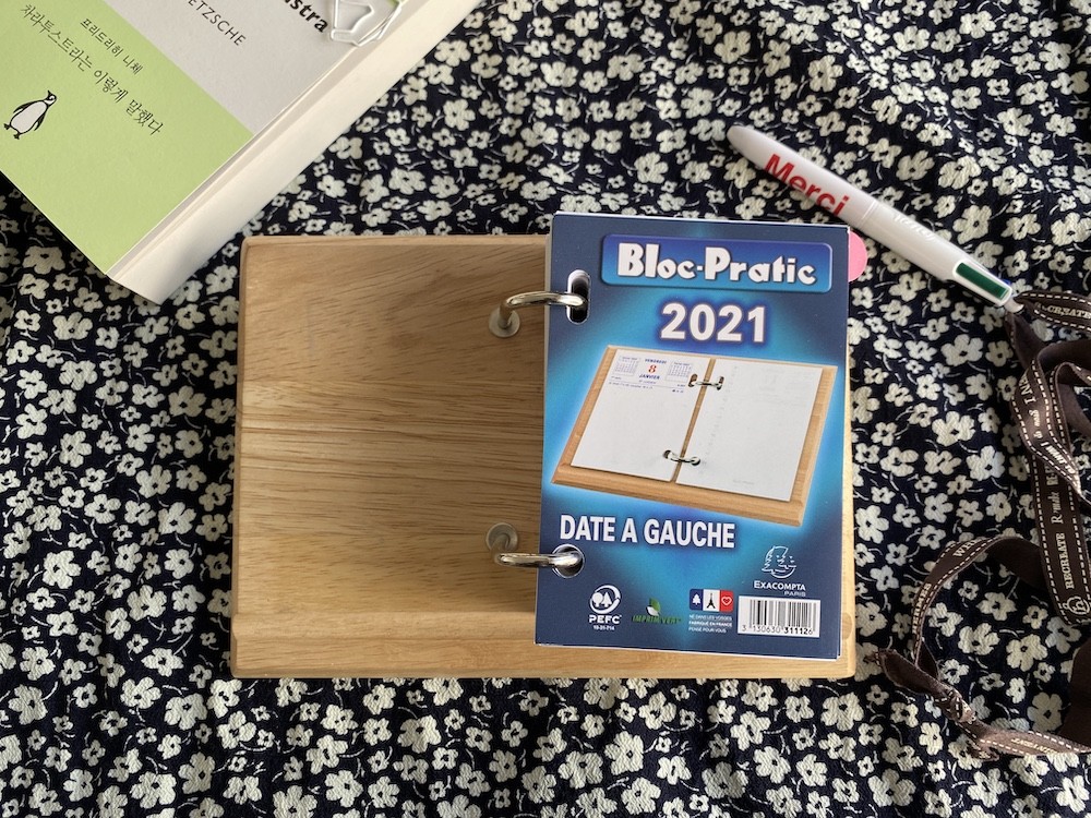 나무로 된 받침대 위에 2021년 일력을 끼우는 형식이에요. 왼쪽에는 날짜와 요일이, 오른쪽에는 시간이 써져 있는데, 사실 전 이 시간 신경 안쓰고 그냥 그날 할 일을 쭉 적어놓아요. 그리고는 할 일을 끝내고 나서 앞의 숫자에 동그라미를 치며 사용한답니다.