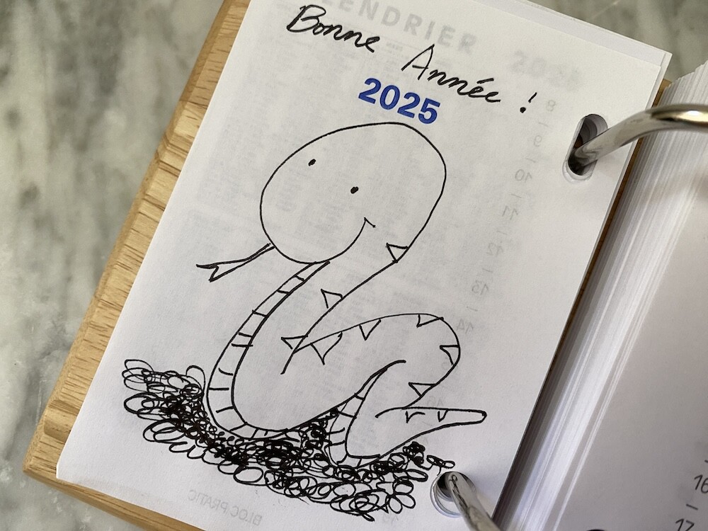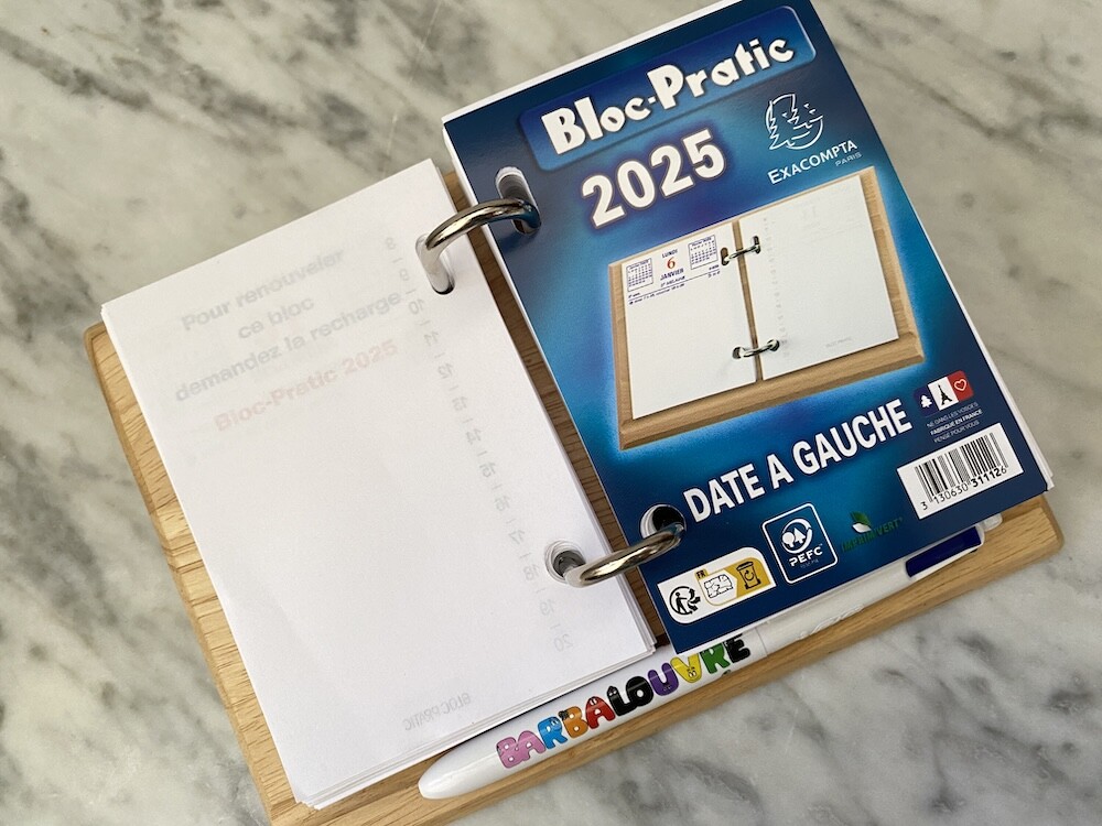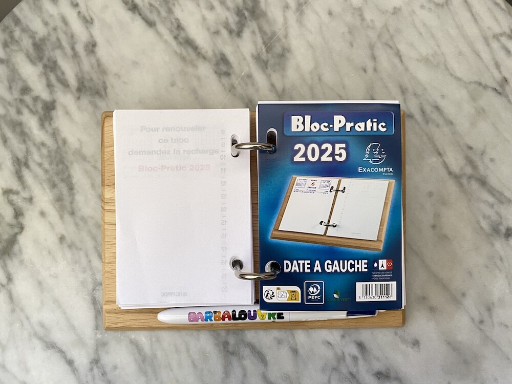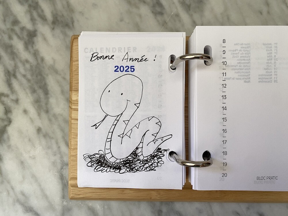 나무로 된 받침대 위에 2025년 일력을 끼우는 형식이에요. 왼쪽에는 날짜와 요일이, 오른쪽에는 시간이 써져 있는데, 사실 전 이 시간 신경 안쓰고 그냥 그날 할 일을 쭉 적어놓아요. 그리고는 할 일을 끝내고 나서 앞의 숫자에 동그라미를 치며 사용한답니다.