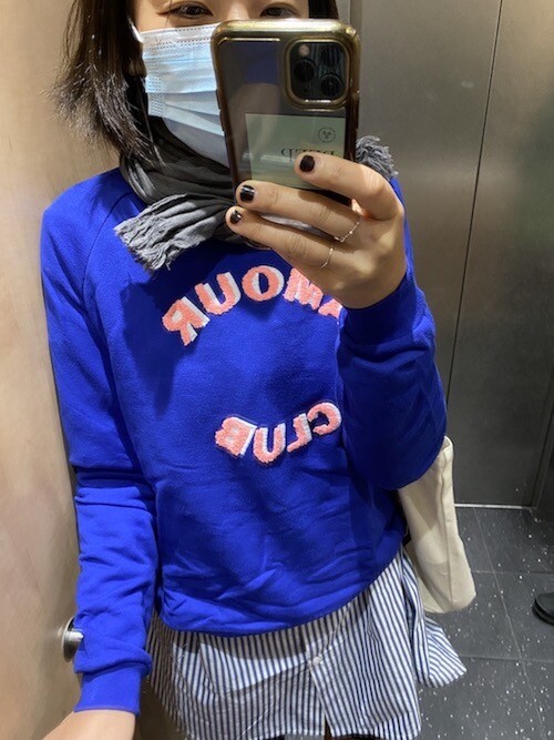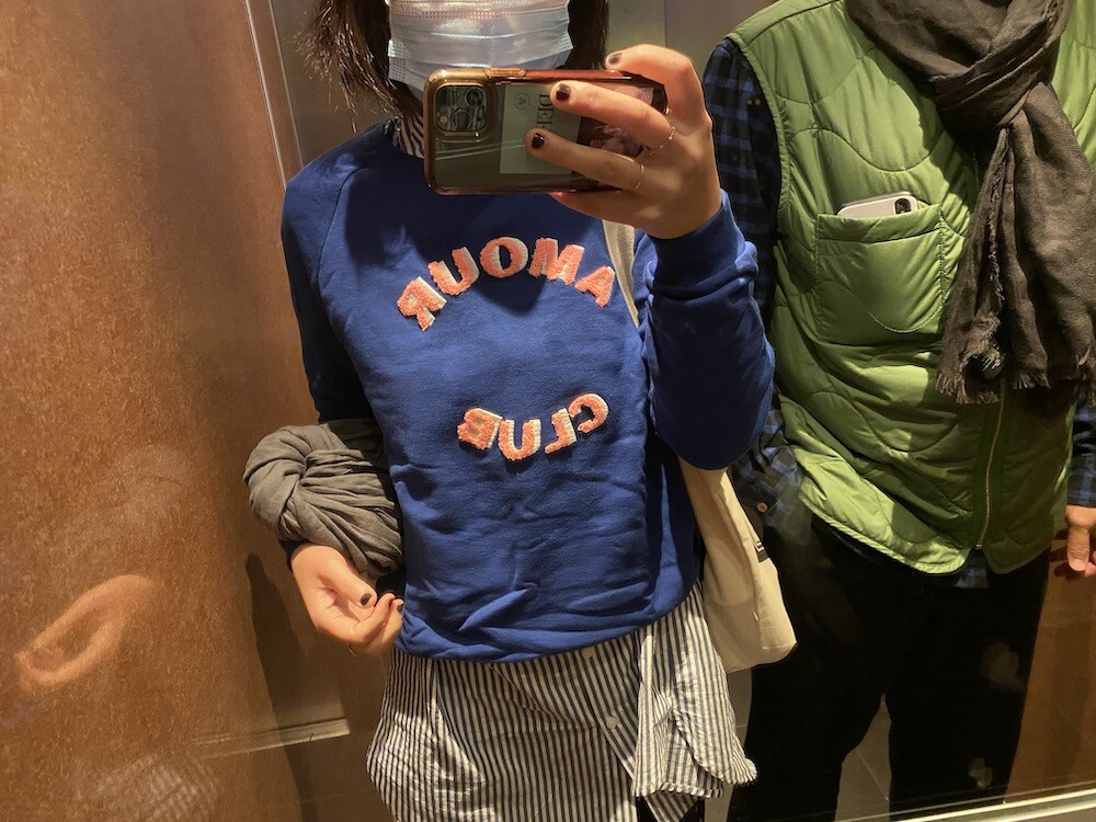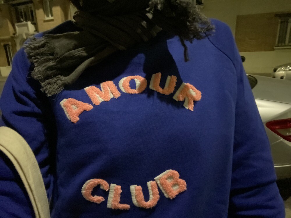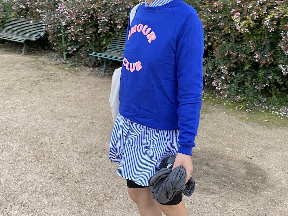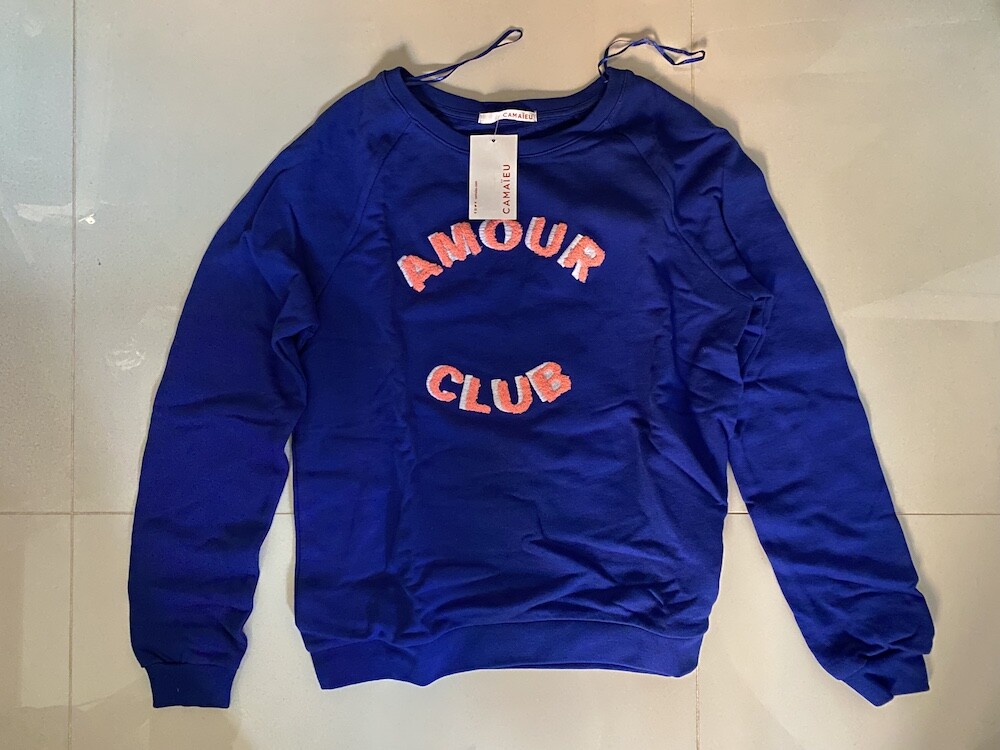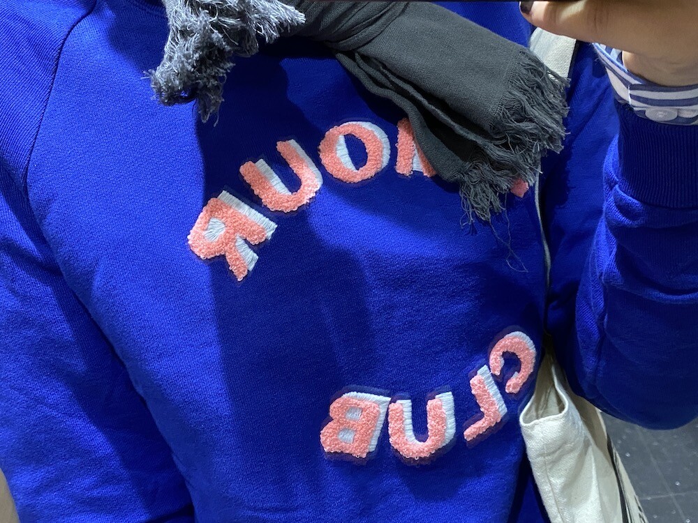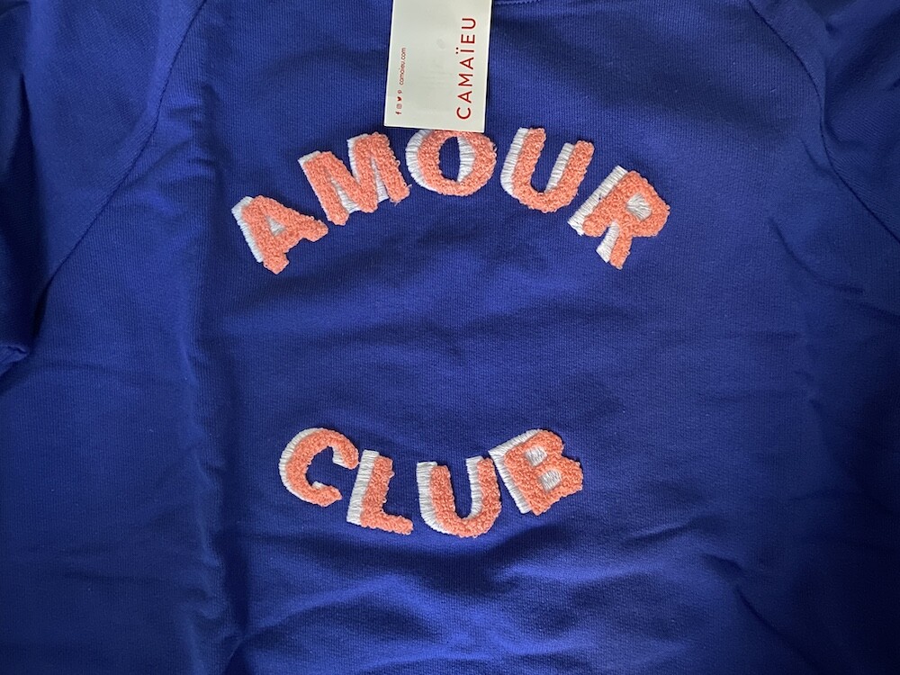 너무 두껍지 않은, 안쪽에 기모가 살짝 있는 파란색 원단에 아무흐 클럽 AMOUR CLUB이라고 글씨가 써져 있는데 이게 보글보글한 자수예요. 자수인 것도 예쁜데 분홍색은 또 얼마나 예쁜지! 딱 제가 좋아하는 파랑색과 분홍색의 조화로 귀여운 느낌을 잘 살린 스웻셔츠랍니다.