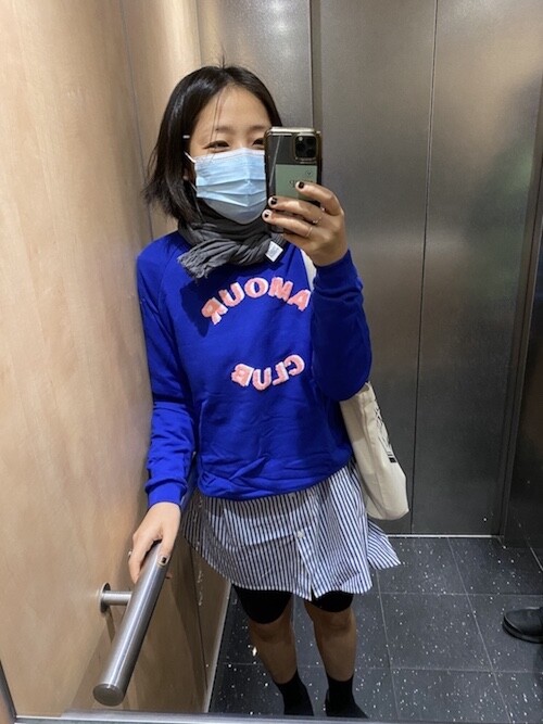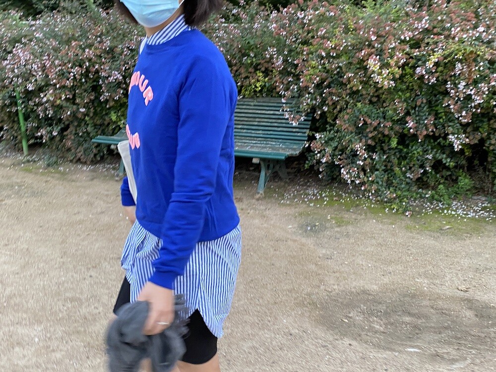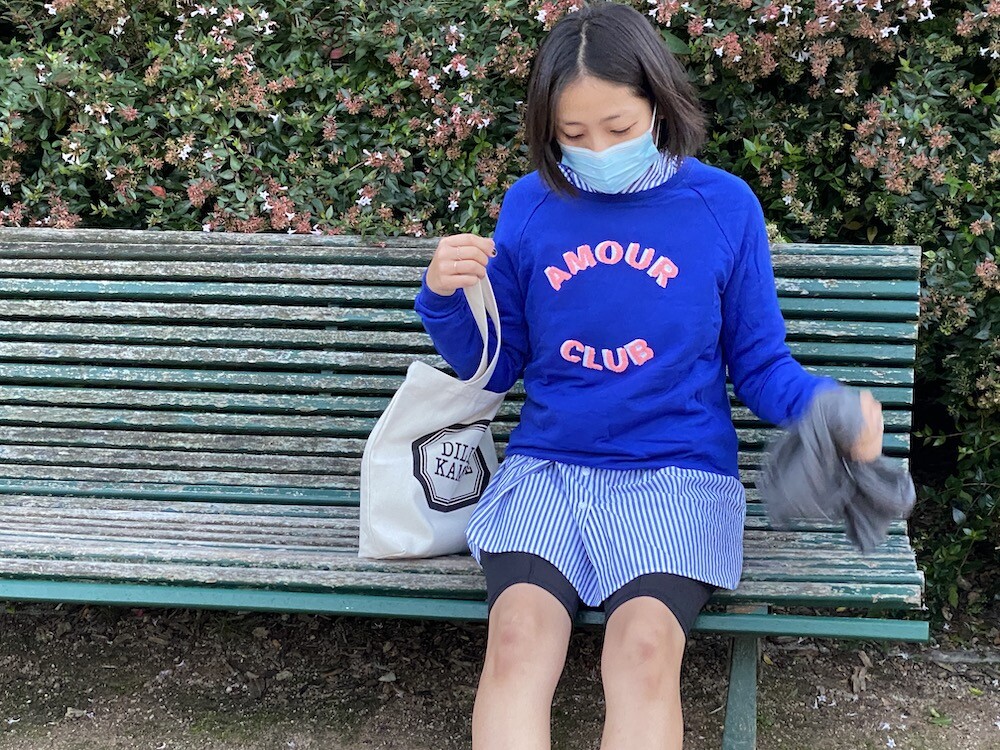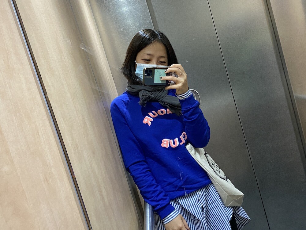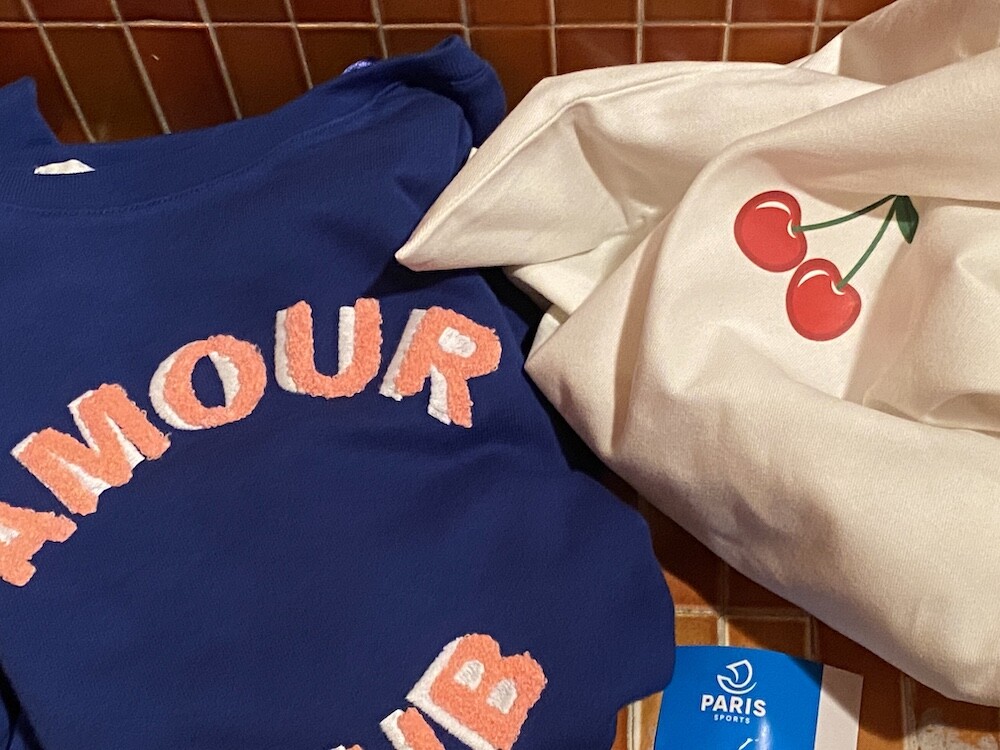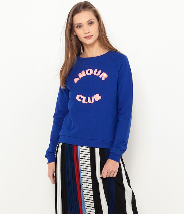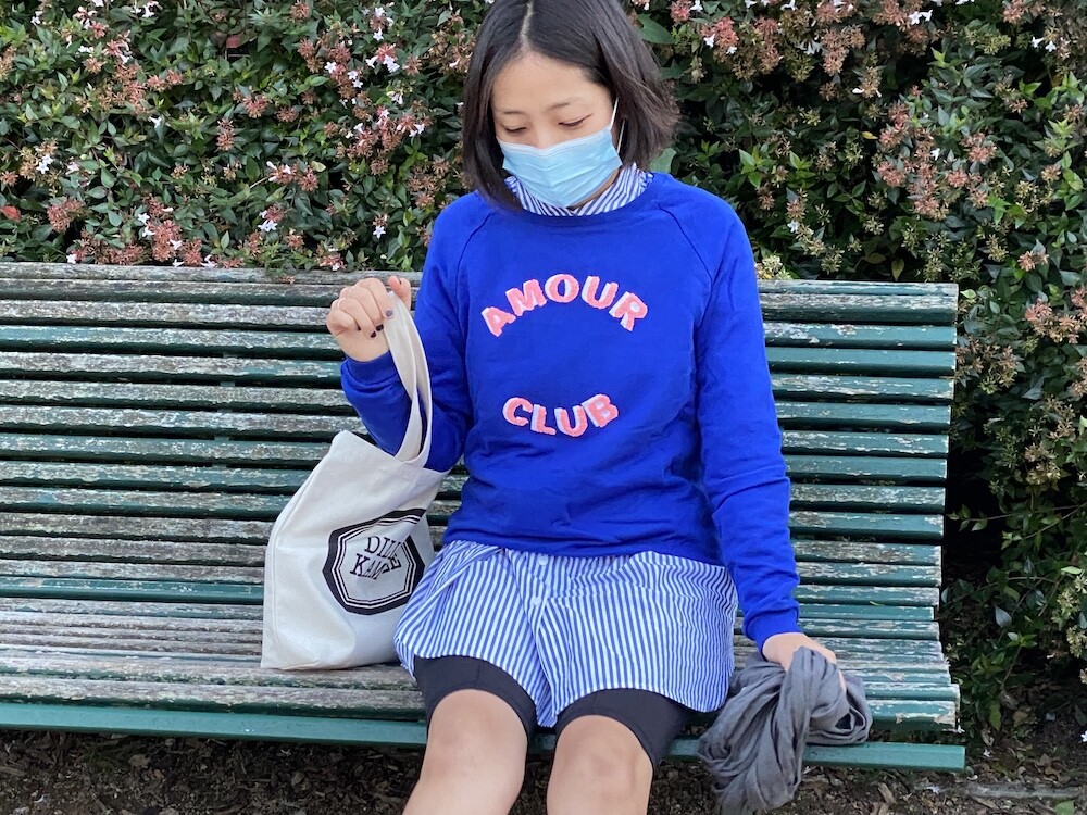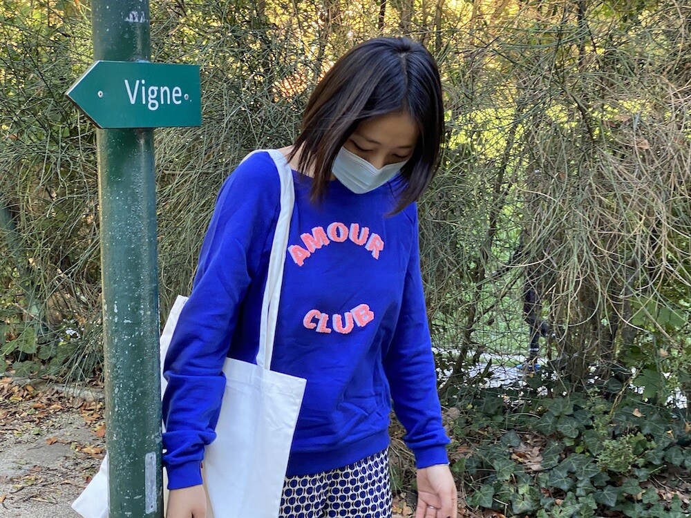 너무 두껍지 않은, 안쪽에 기모가 살짝 있는 파란색 원단에 아무흐 클럽 AMOUR CLUB이라고 글씨가 써져 있는데 이게 보글보글한 자수예요. 자수인 것도 예쁜데 분홍색은 또 얼마나 예쁜지! 딱 제가 좋아하는 파랑색과 분홍색의 조화로 귀여운 느낌을 잘 살린 스웻셔츠랍니다.