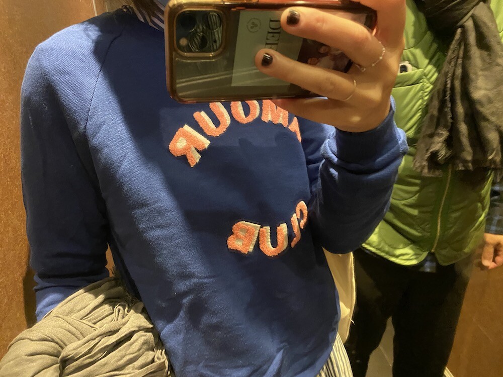 어깨 부분은 래글런으로 되어 있어서 어깨가 커 보이지 않아요. 셔츠 위에 입어도 떡대가 안 느껴져서 좋더라고요. '아무흐 AMOUR'는 프랑스어로 '사랑'이라는 뜻입니다. 단어도 예쁘지 않나요?