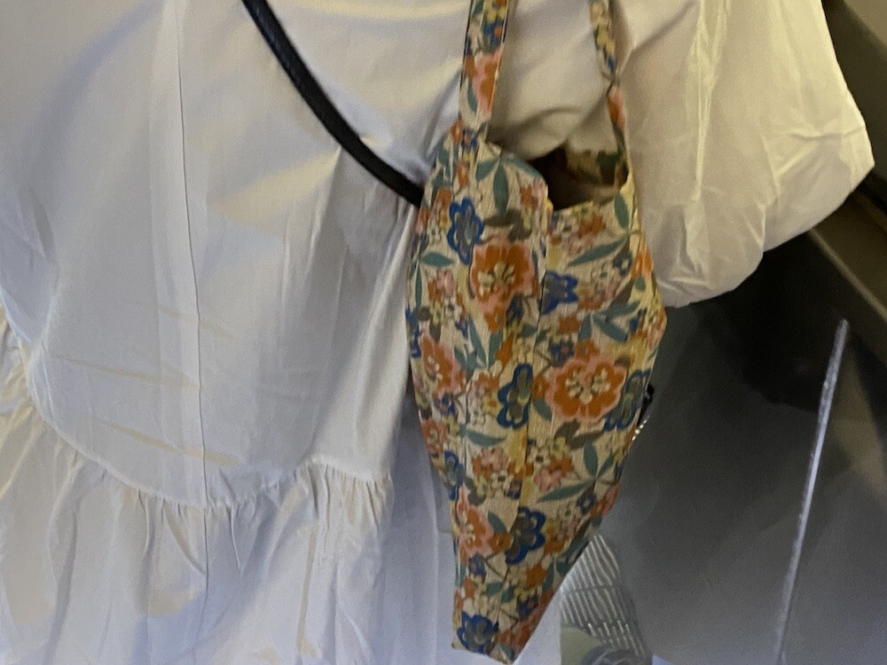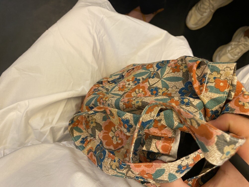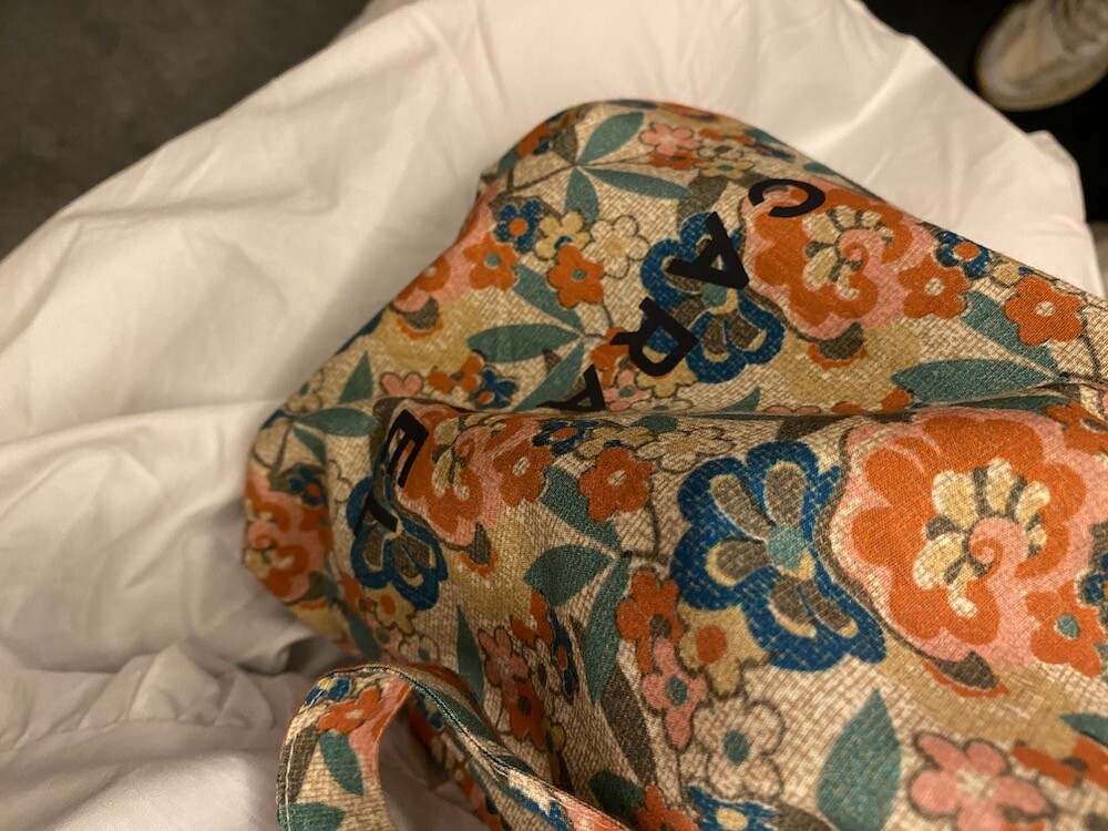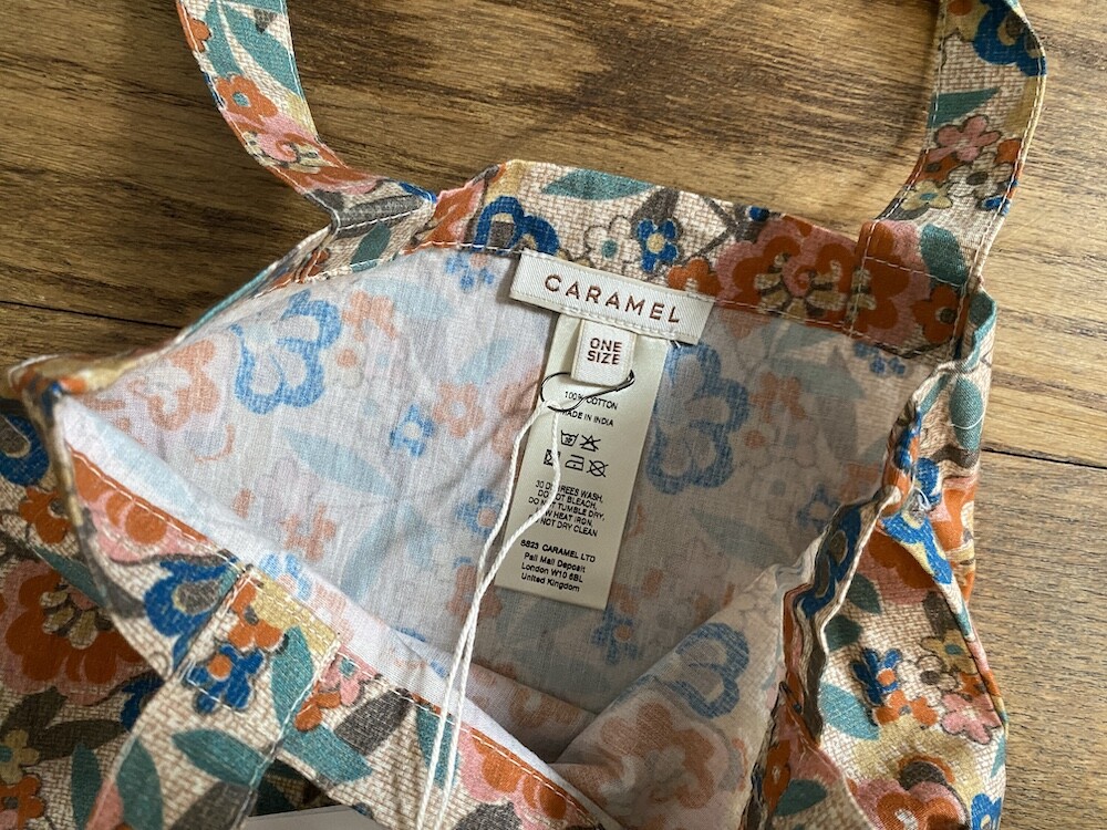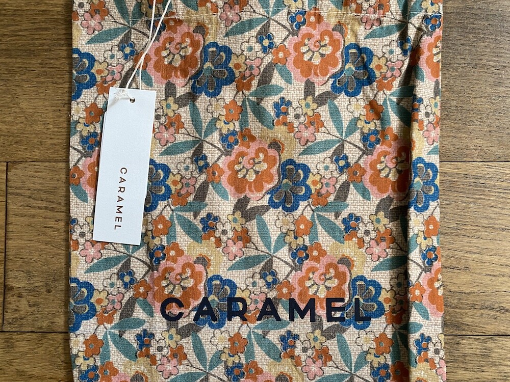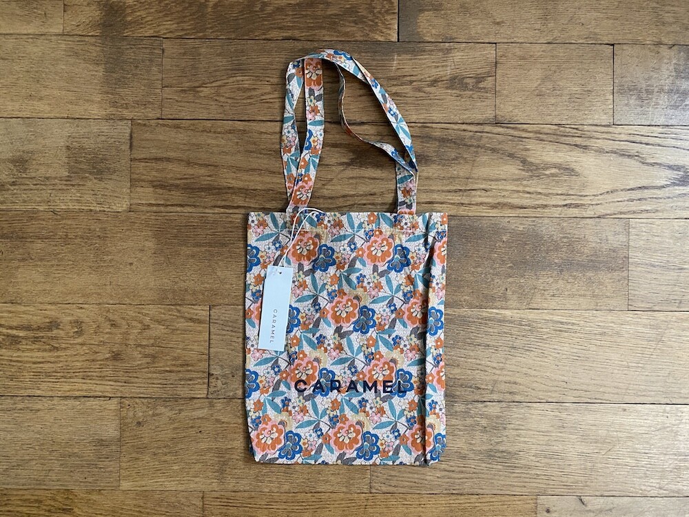 70년대에서 영감을 받은 빈티지 플로랄 프린트에 카라멜의 로고가 프린트된 에코백이에요. 한국 분들께서 좋아하시는 작은 사이즈의 에코백으로, 어깨에 딱 맞게 메고 다니기에도 예쁘고 두 번 정도 팔에 감아 들고 다녀도 예뻐요. 밑면 넓이가 살짝 있는 제품이라 도톰한 서류나 책을 넣고 다니시기에도 좋을 거예요.