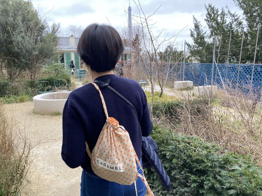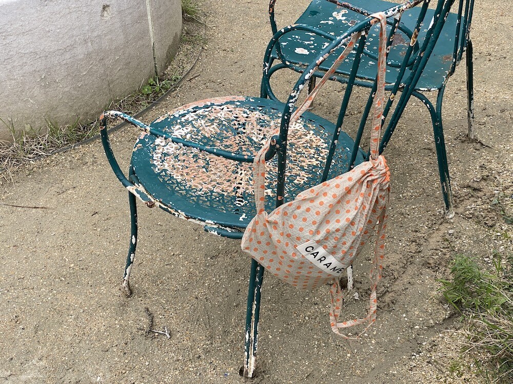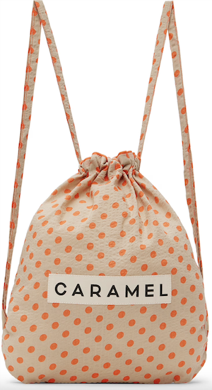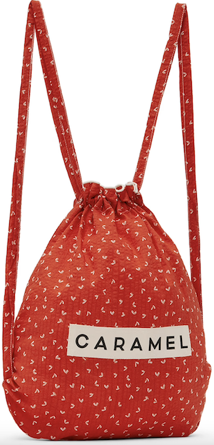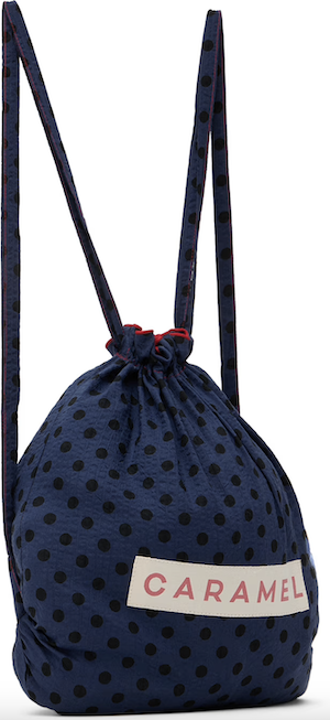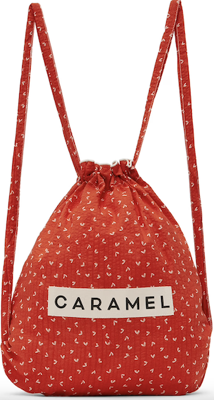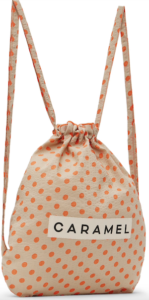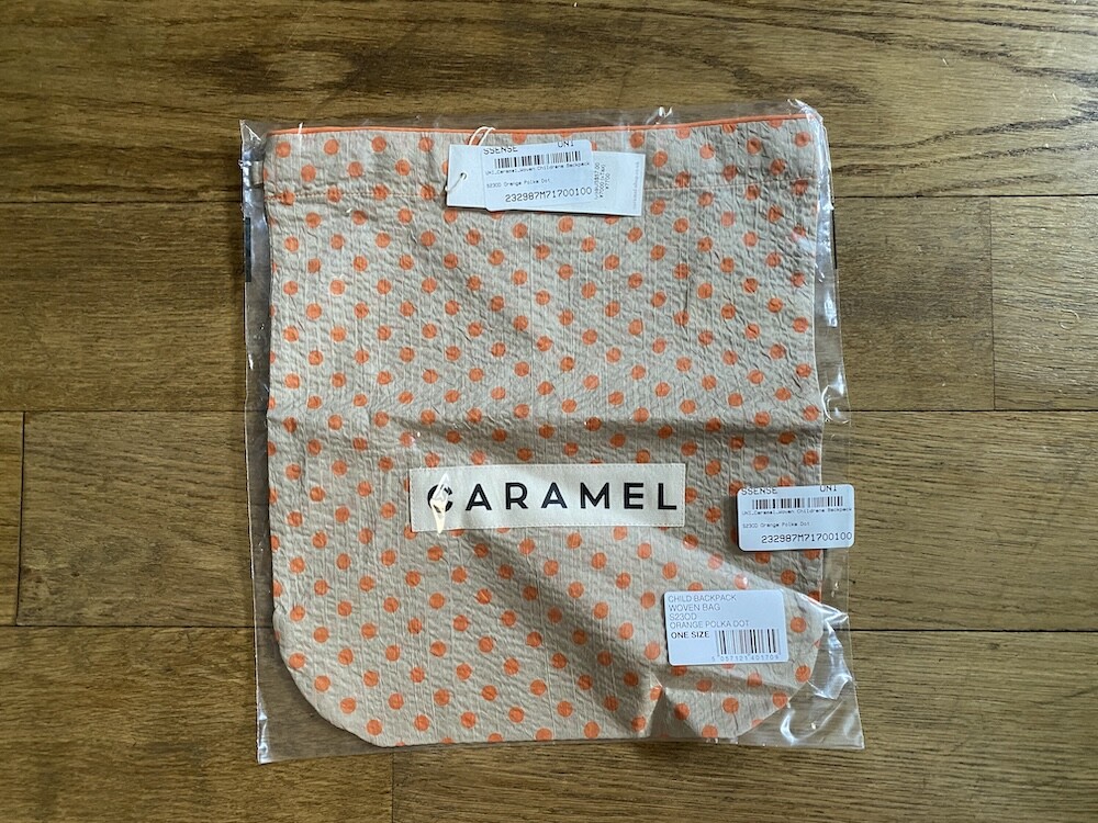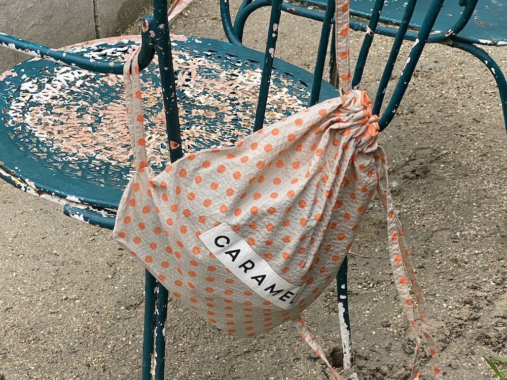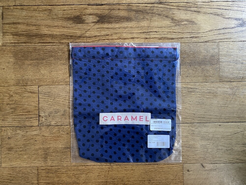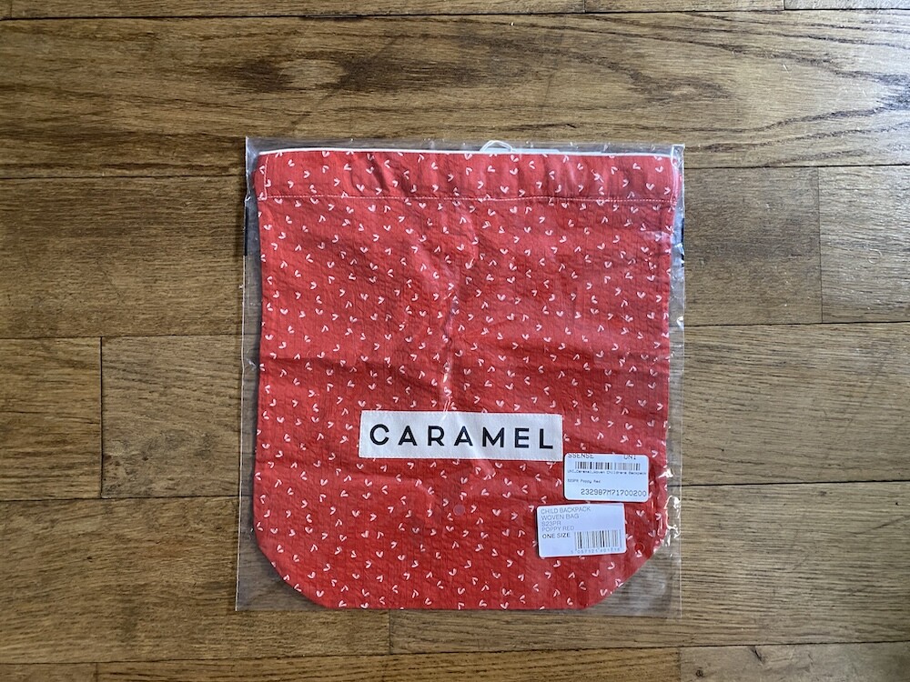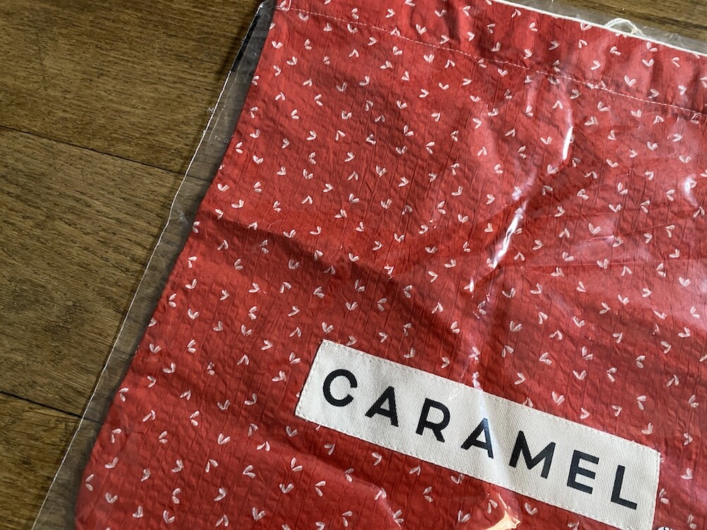 끈을 쭉 당겨 어깨에 메는 디자인으로, 울퉁불퉁한 소재감이 느껴지는 원단이라 마음에 드네요. 특히 앞 부분에 붙은 "카라멜 CARAMEL"이라고 써진 라벨도 귀여워요.