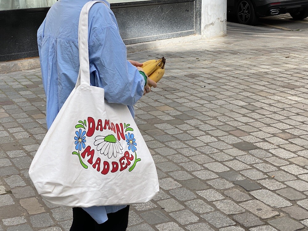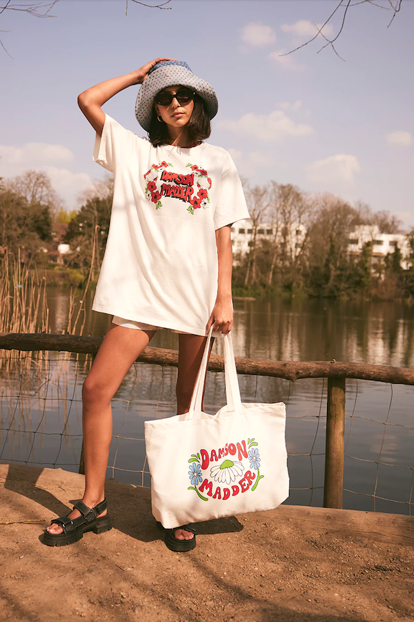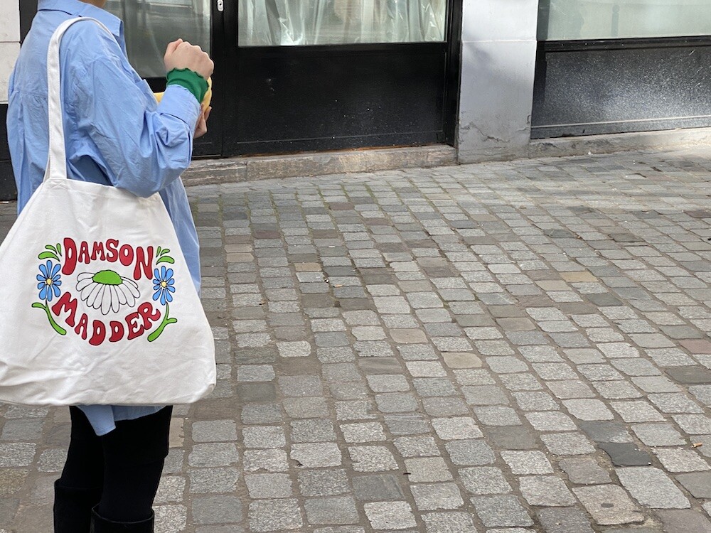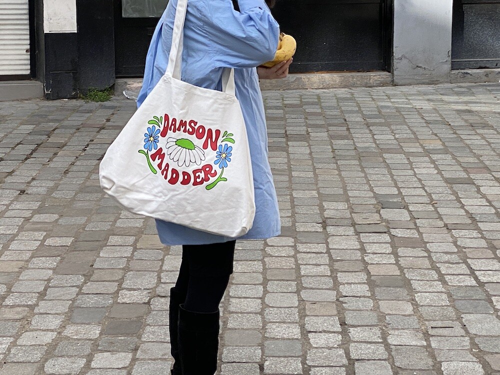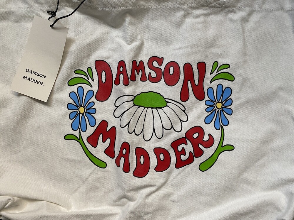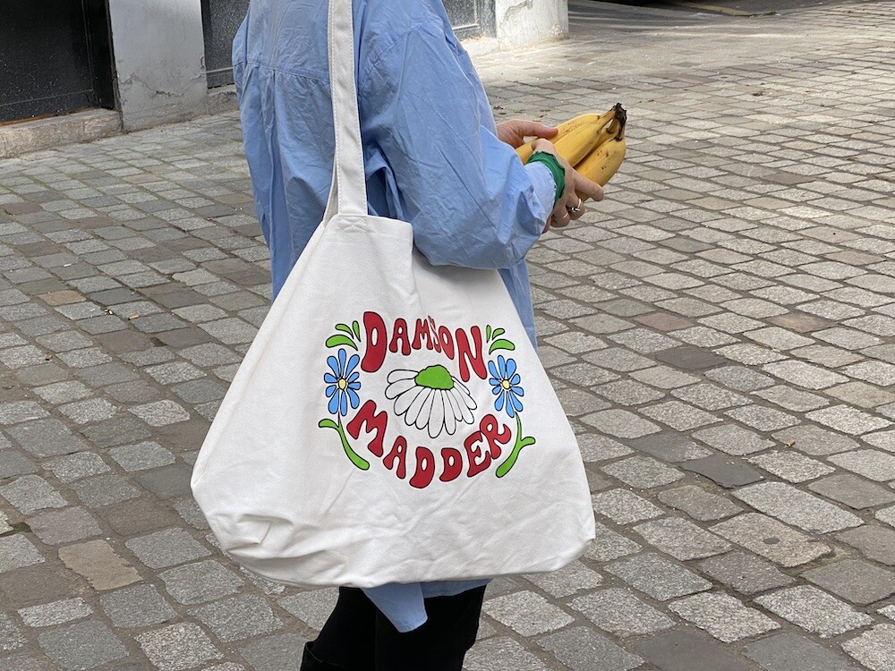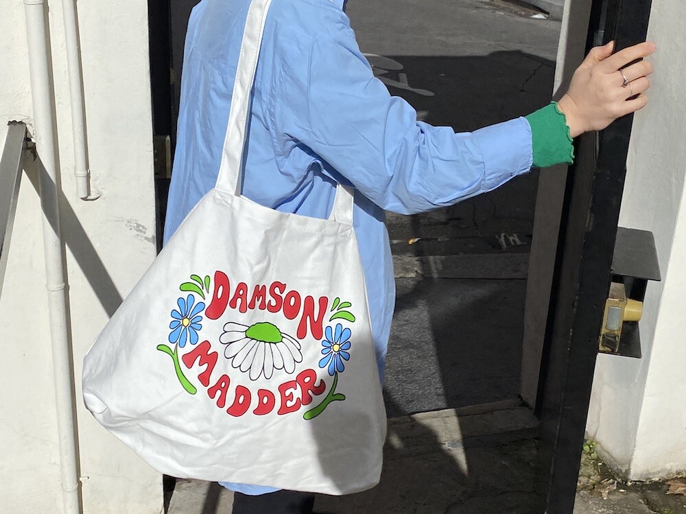 프린트가 귀여운 에코백이에요. 브랜드의 시그니처인 데이지꽃을 다양한 모양과 색으로 그린 그림에 DAMSON MADDER라는 브랜드 이름을 귀엽게 써넣은 가방으로, 사이즈가 넉넉해서 짐 많은 날 혹은 여름의 해변에서 잘 사용하시게 될 거예요.