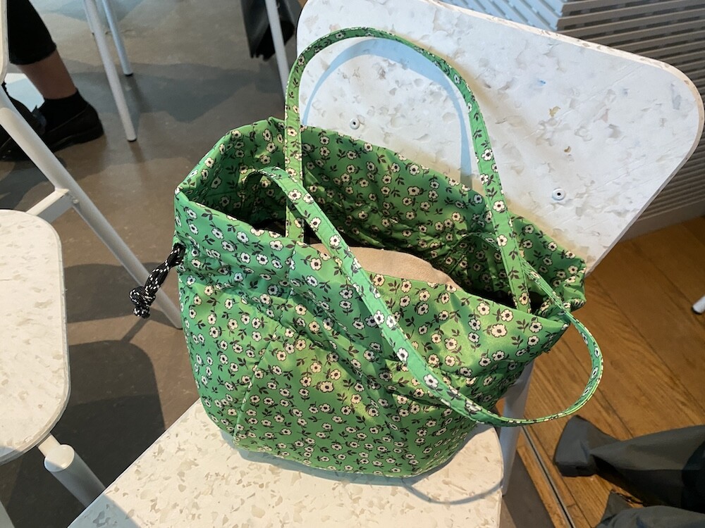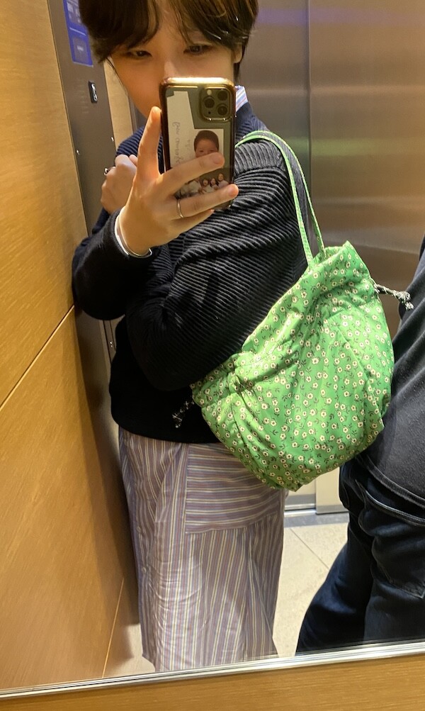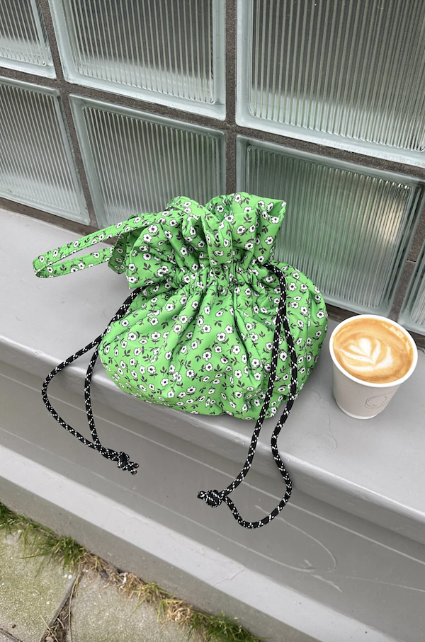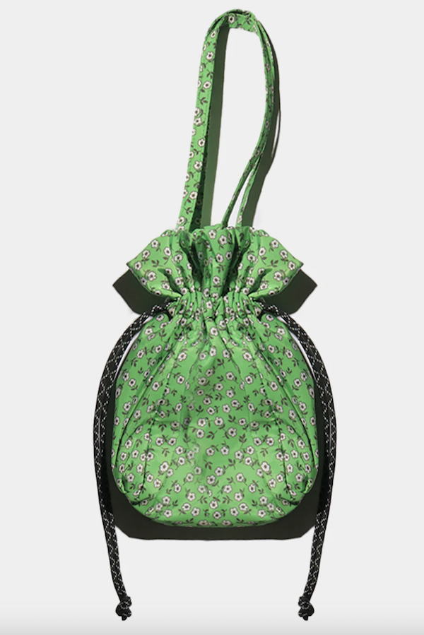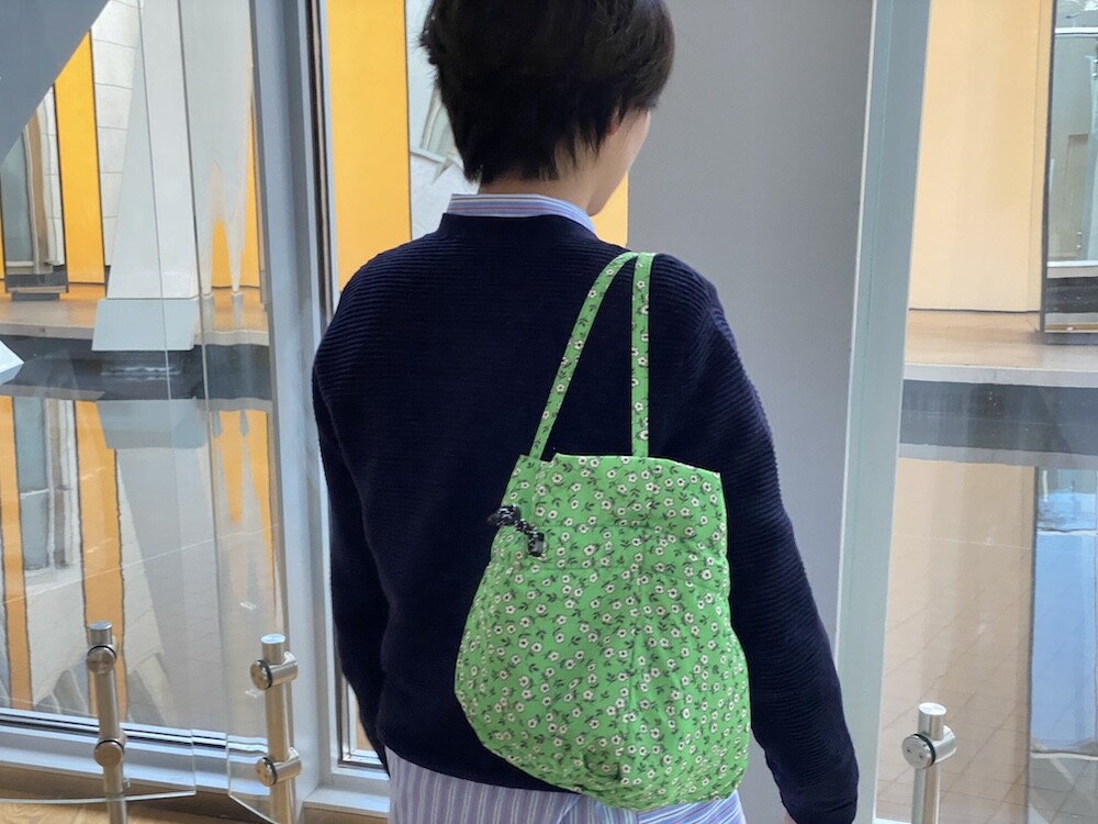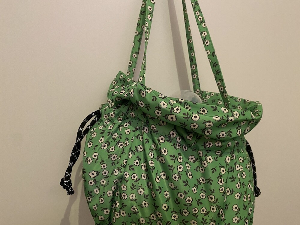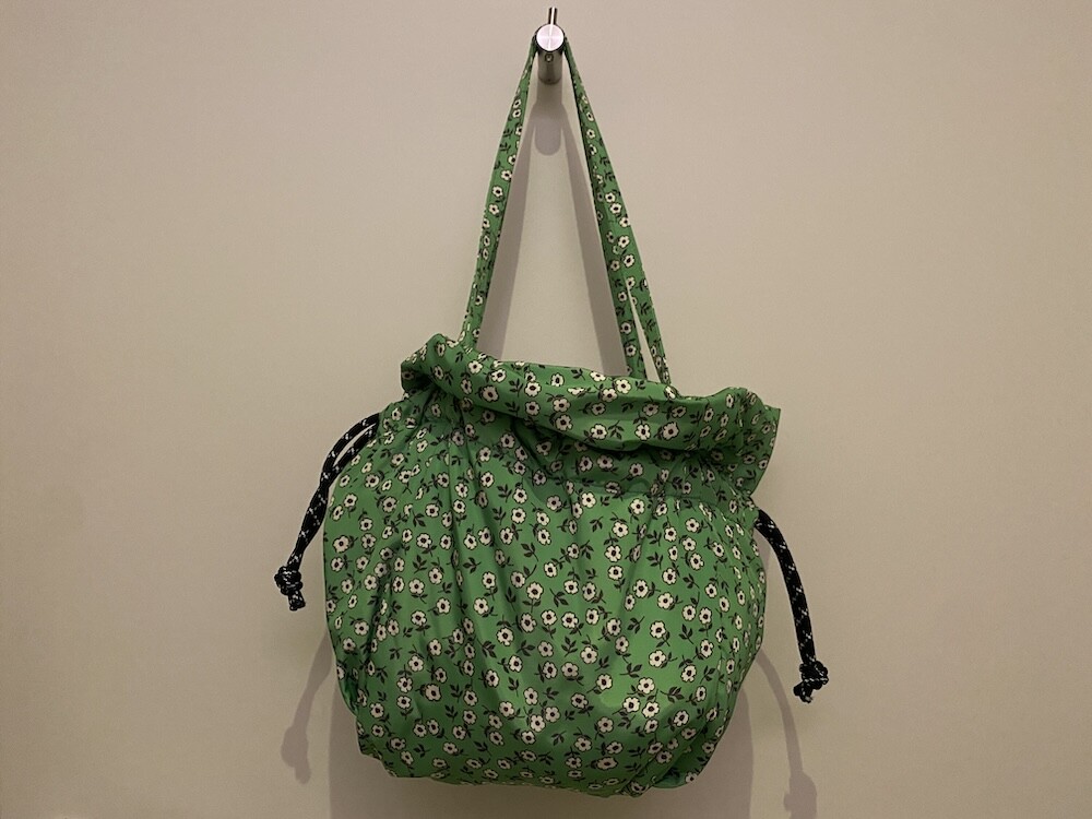 초록색의 바탕에 작은 꽃무늬가 있는 귀여운 가방이에요. 그냥 메면 일반 에코백 같지만 양옆에 달린 끈을 당기면 복주머니 같은 모양의 가방이 되기 때문에 두 가지 느낌으로 사용하실 수 있어요. 가장 마음에 들었던 건 가방 끈의 넓이인데요. 끈이 얇아서 디자인적으로 평범하지 않아서 예쁘더라고요. 재활용 폴리에스테르 소재라 환경을 생각한 제품이라는 것도 좋네요.