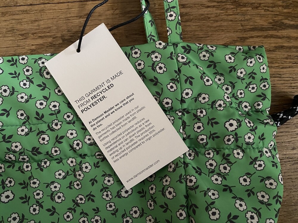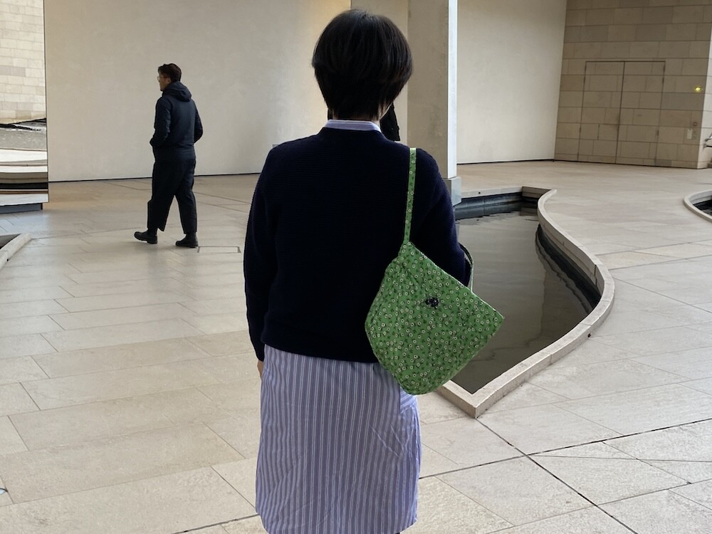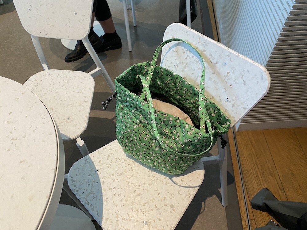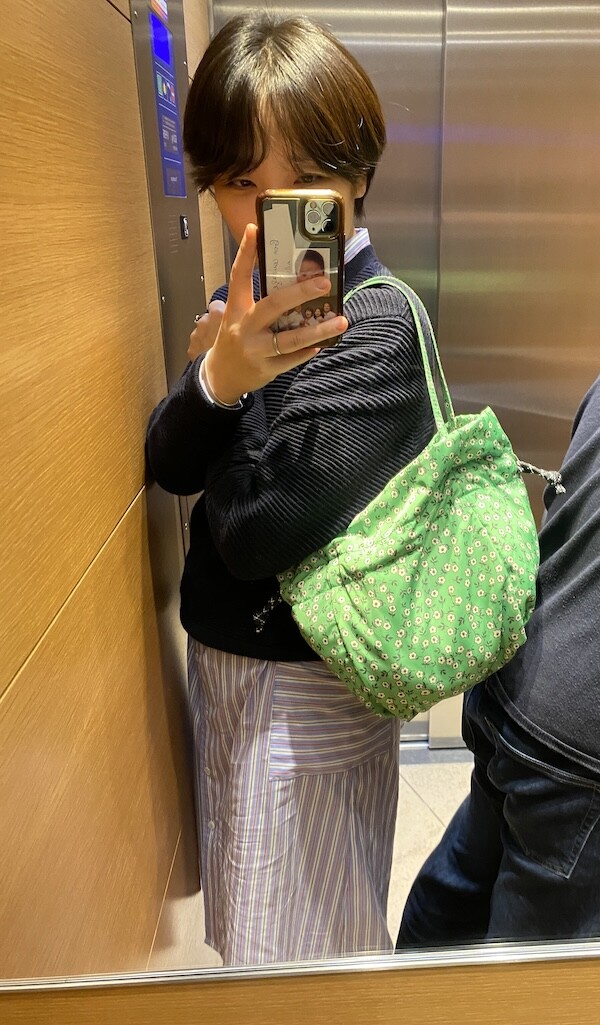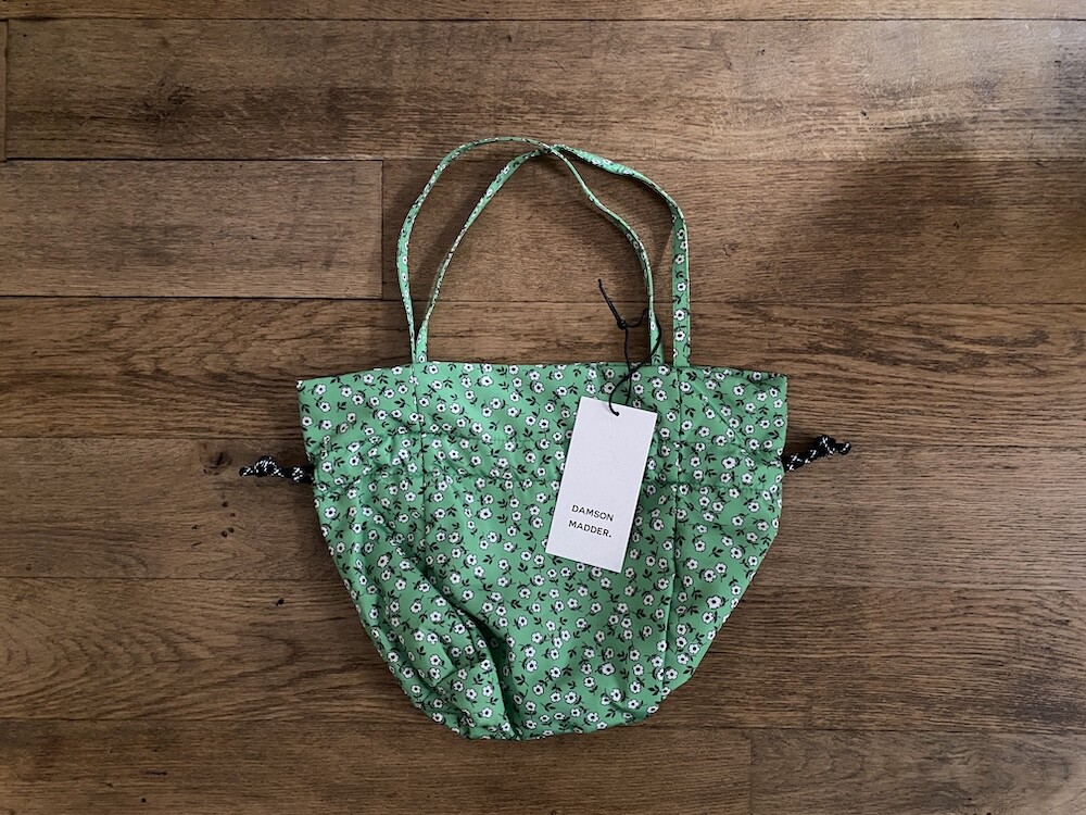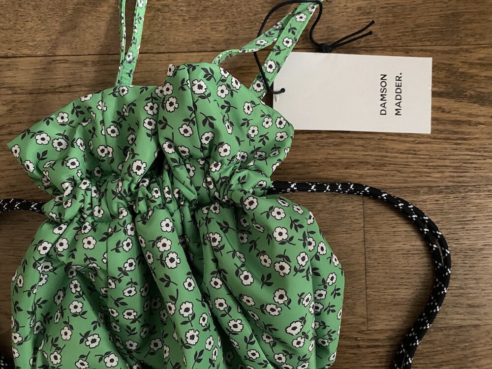초록색의 바탕에 작은 꽃무늬가 있는 귀여운 가방이에요. 그냥 메면 일반 에코백 같지만 양옆에 달린 끈을 당기면 복주머니 같은 모양의 가방이 되기 때문에 두 가지 느낌으로 사용하실 수 있어요. 가장 마음에 들었던 건 가방 끈의 넓이인데요. 끈이 얇아서 디자인적으로 평범하지 않아서 예쁘더라고요. 재활용 폴리에스테르 소재라 환경을 생각한 제품이라는 것도 좋네요.