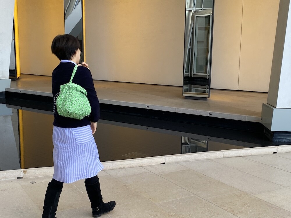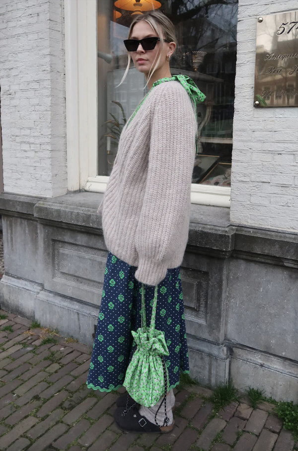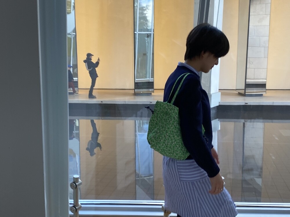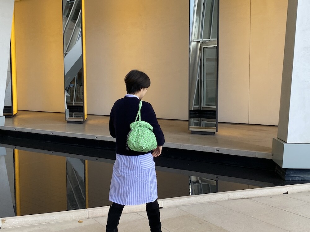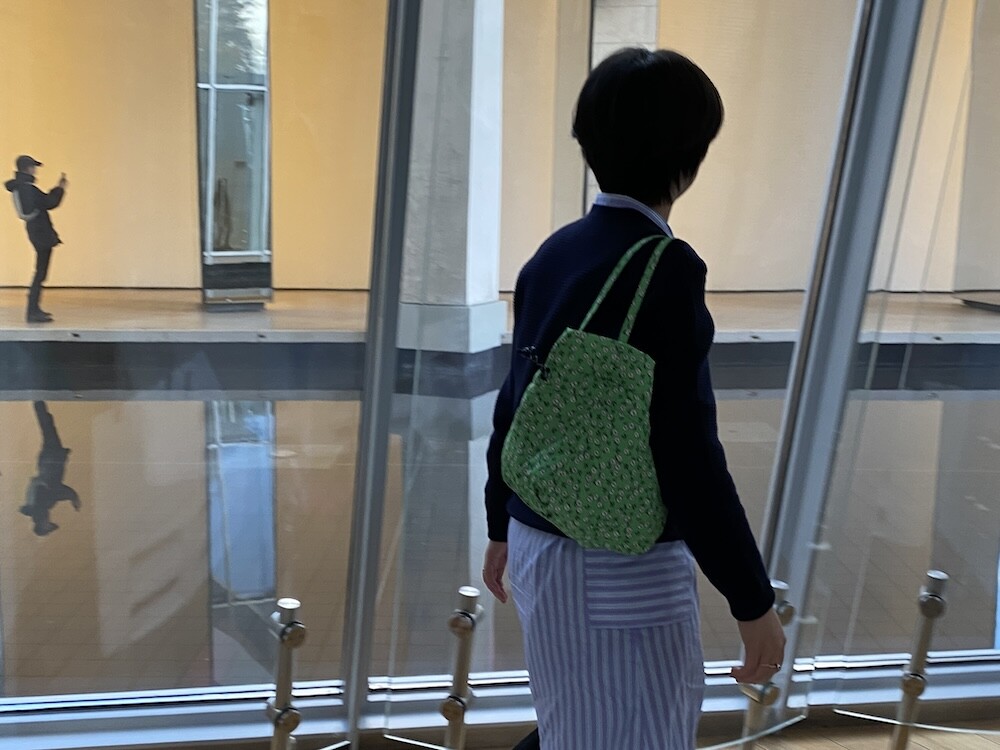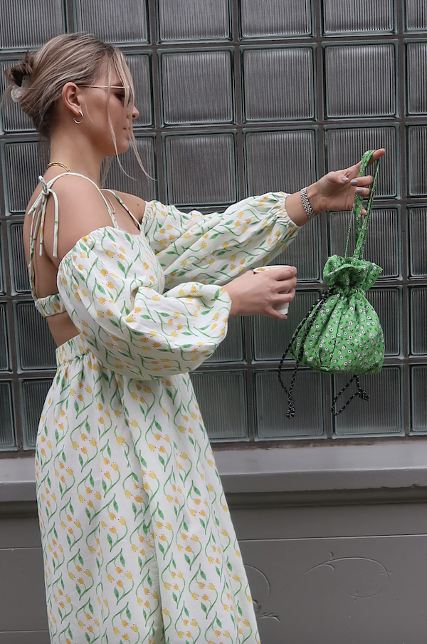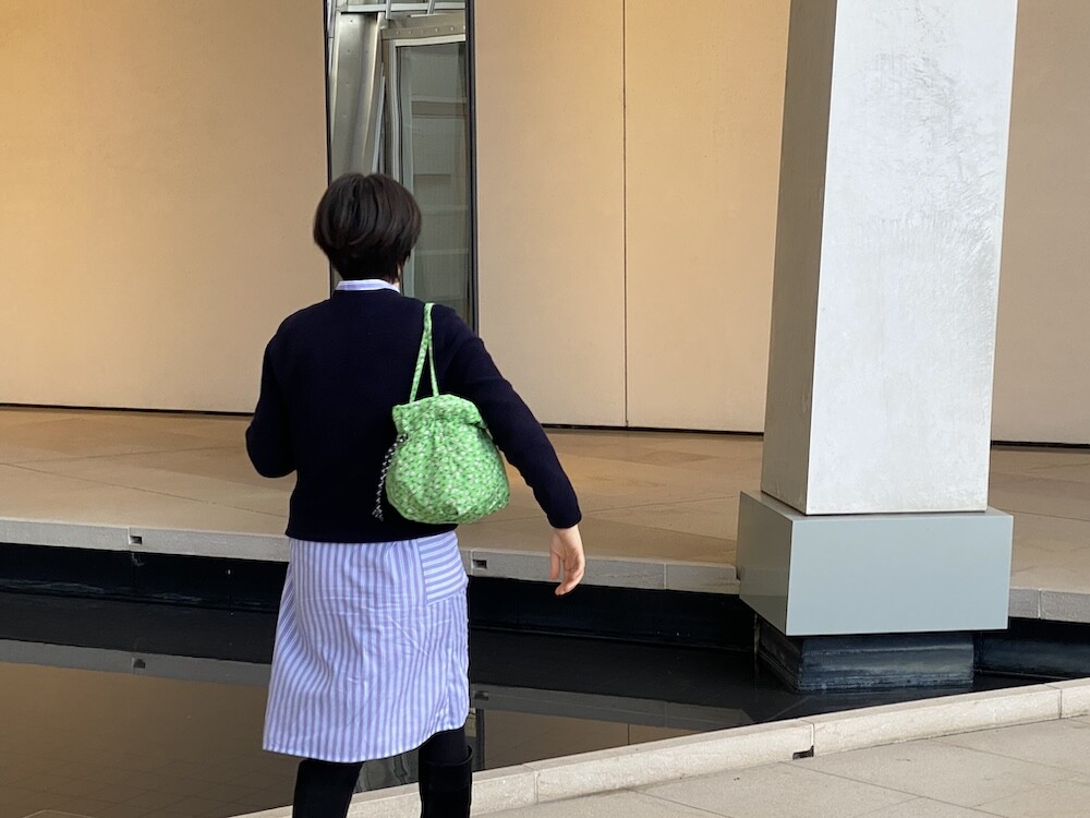 초록색의 바탕에 작은 꽃무늬가 있는 귀여운 가방이에요. 그냥 메면 일반 에코백 같지만 양옆에 달린 끈을 당기면 복주머니 같은 모양의 가방이 되기 때문에 두 가지 느낌으로 사용하실 수 있어요. 가장 마음에 들었던 건 가방 끈의 넓이인데요. 끈이 얇아서 디자인적으로 평범하지 않아서 예쁘더라고요. 재활용 폴리에스테르 소재라 환경을 생각한 제품이라는 것도 좋네요.
