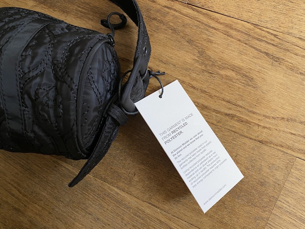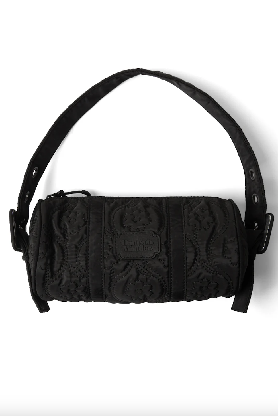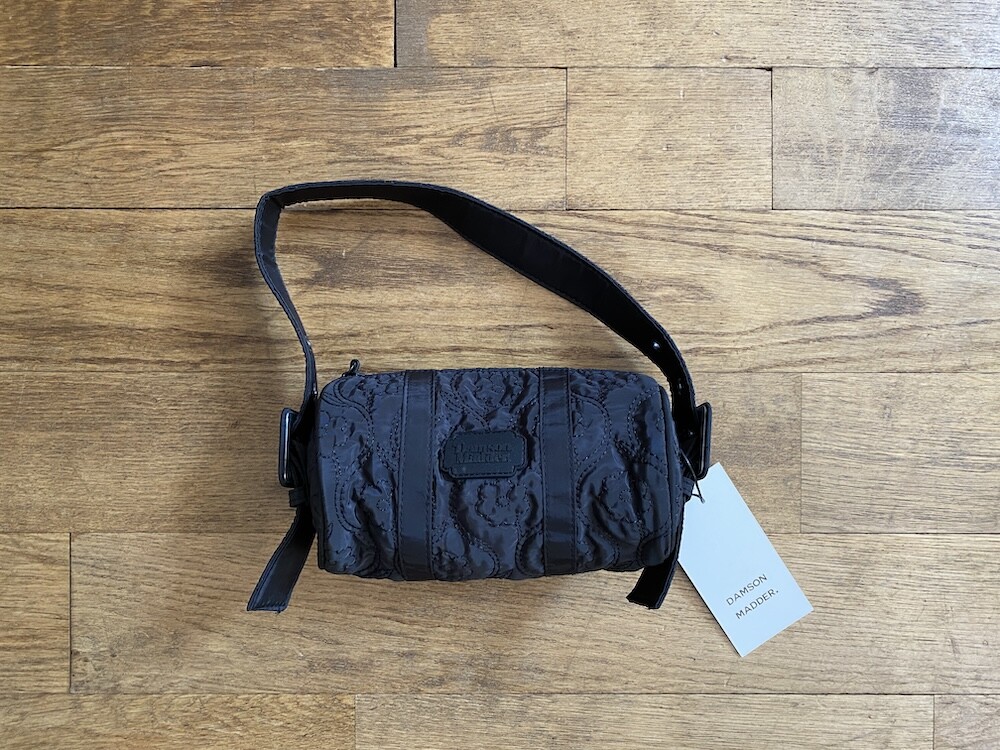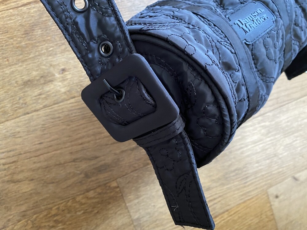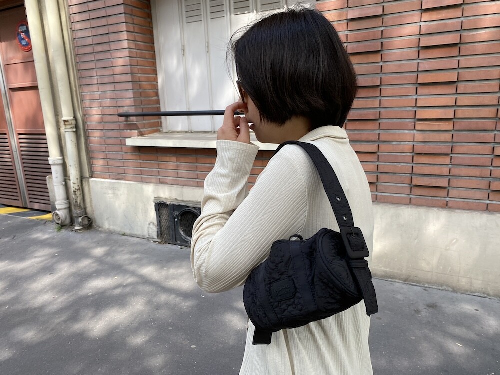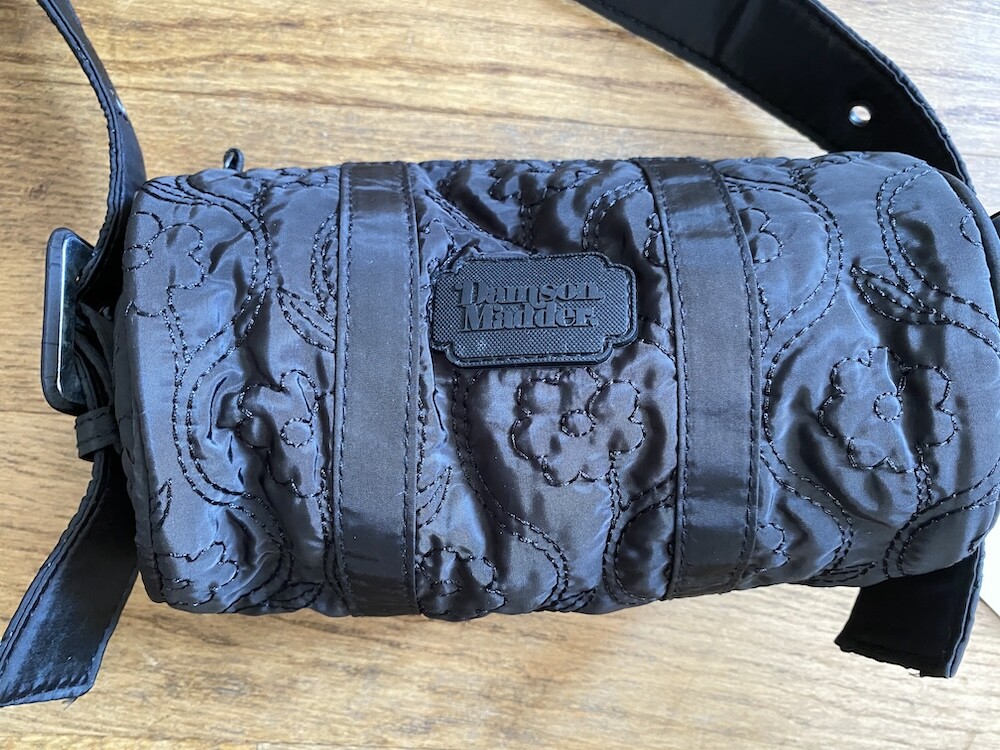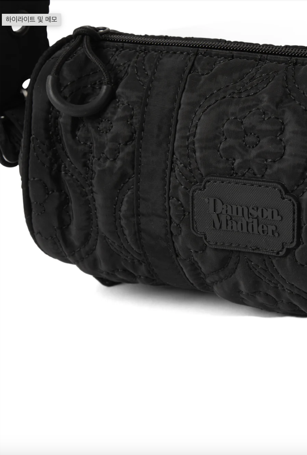 플로랄 스티치가 놓여진 검정색 원단으로 만들어진 원통형 가방이에요. 패딩 감이 들어 있지 않은 퀼티드 원단이라 사계절 내내 사용하시기 좋을 거예요. 사이즈가 작아서 어깨에 멨을 때 귀엽고, 끈 길이 조절이 돼서 좋아요. 가방 앞 부분에 브랜드 이름이 써진 고무 라벨이 붙어 있는 것도 예쁘네요.