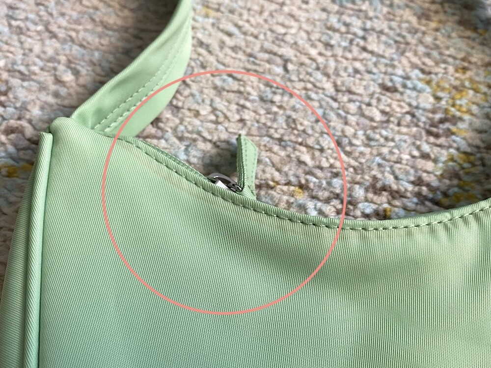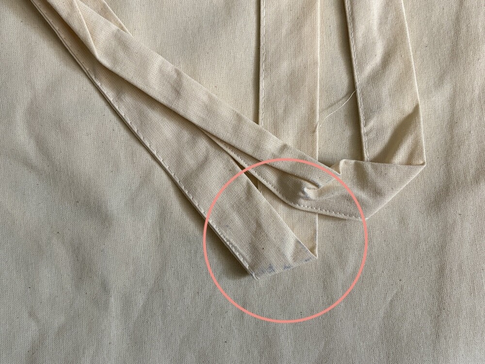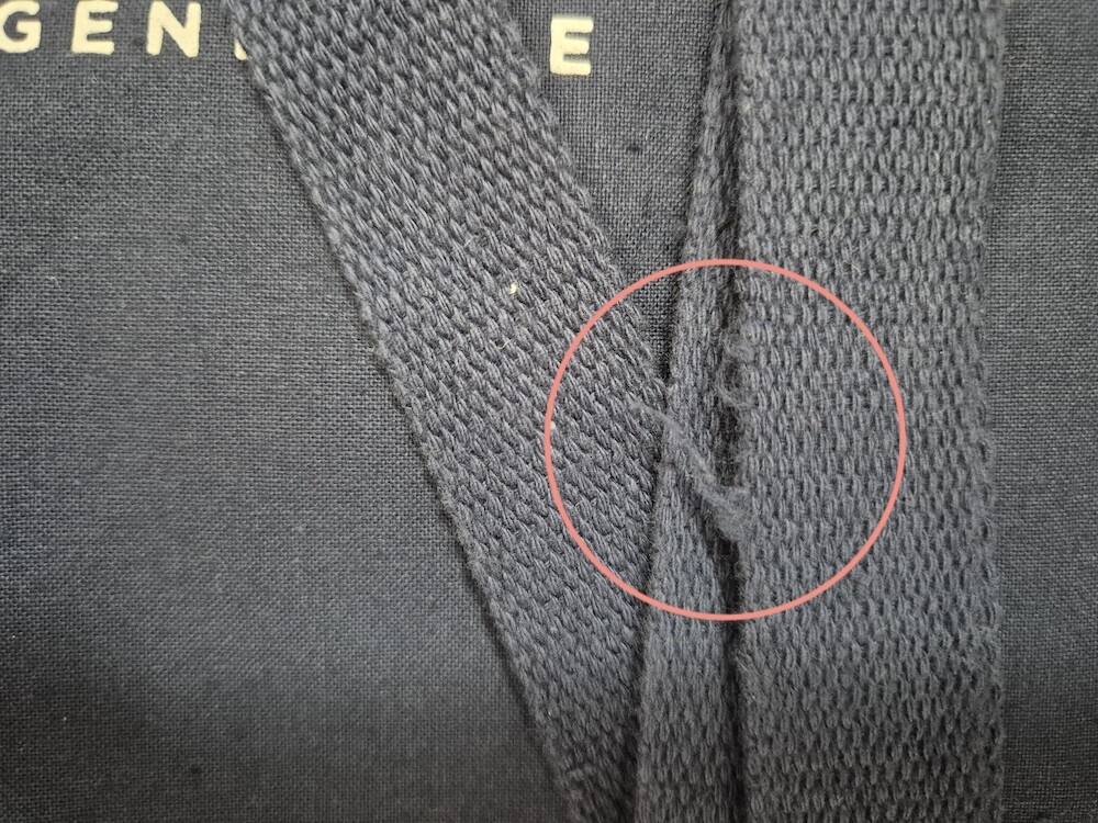 어깨끈 부분에 박음질 불량이 있으나 사용하시는 데에는 문제가 없습니다.