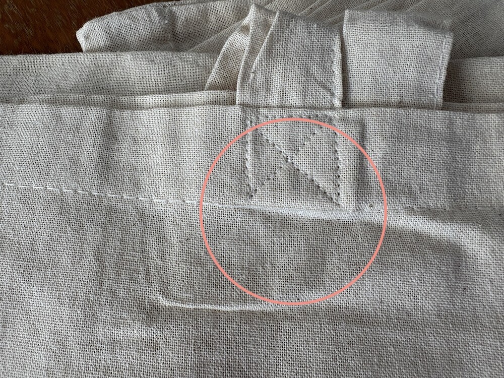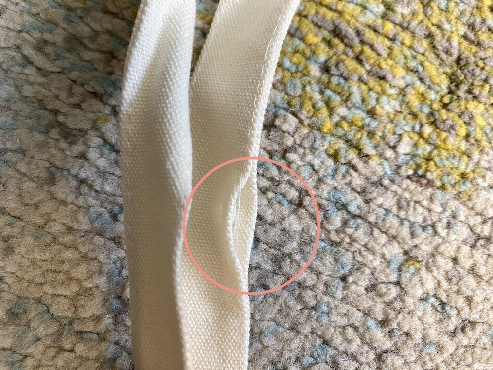 끈 부분에 박음질 불량이 있으나 사용하시는 데에는 문제가 없습니다.