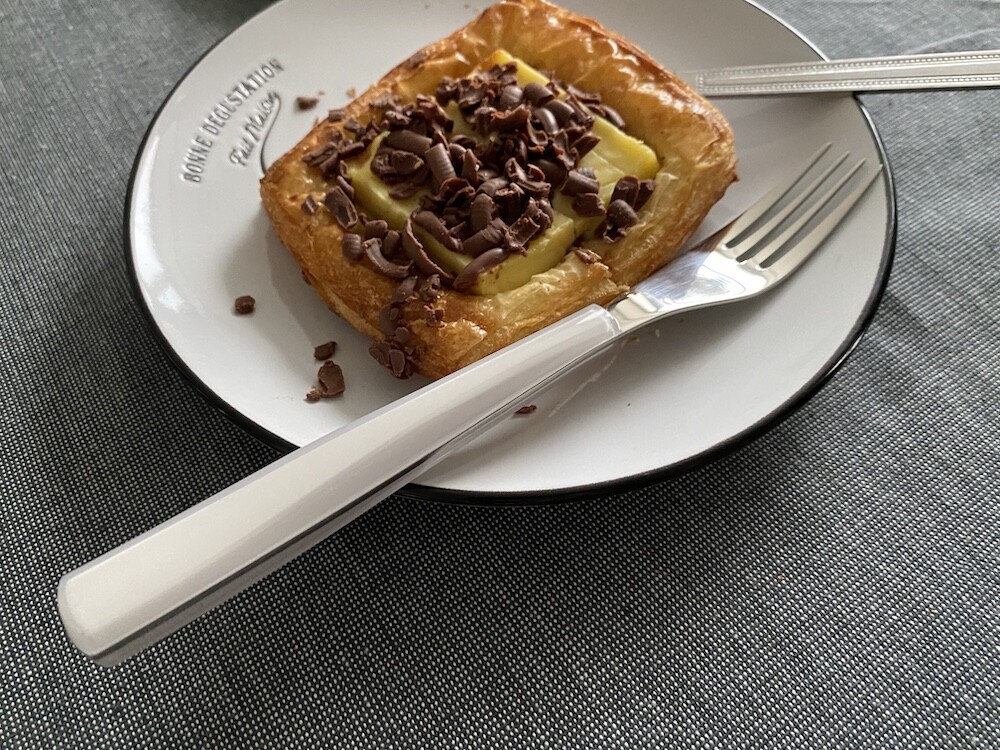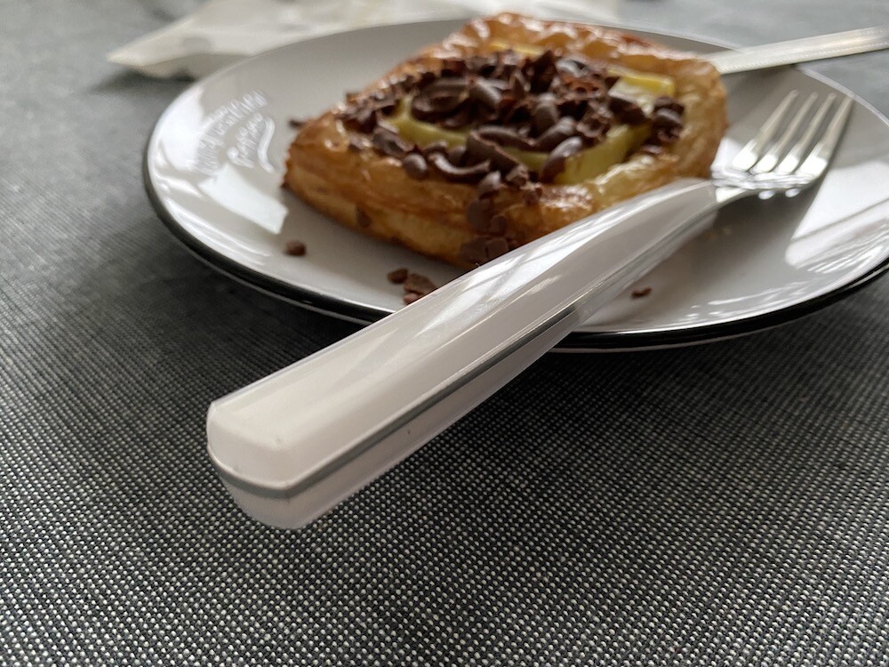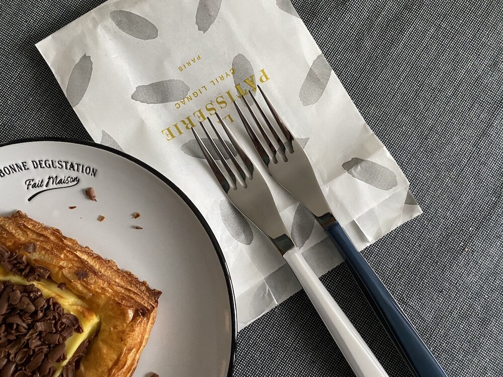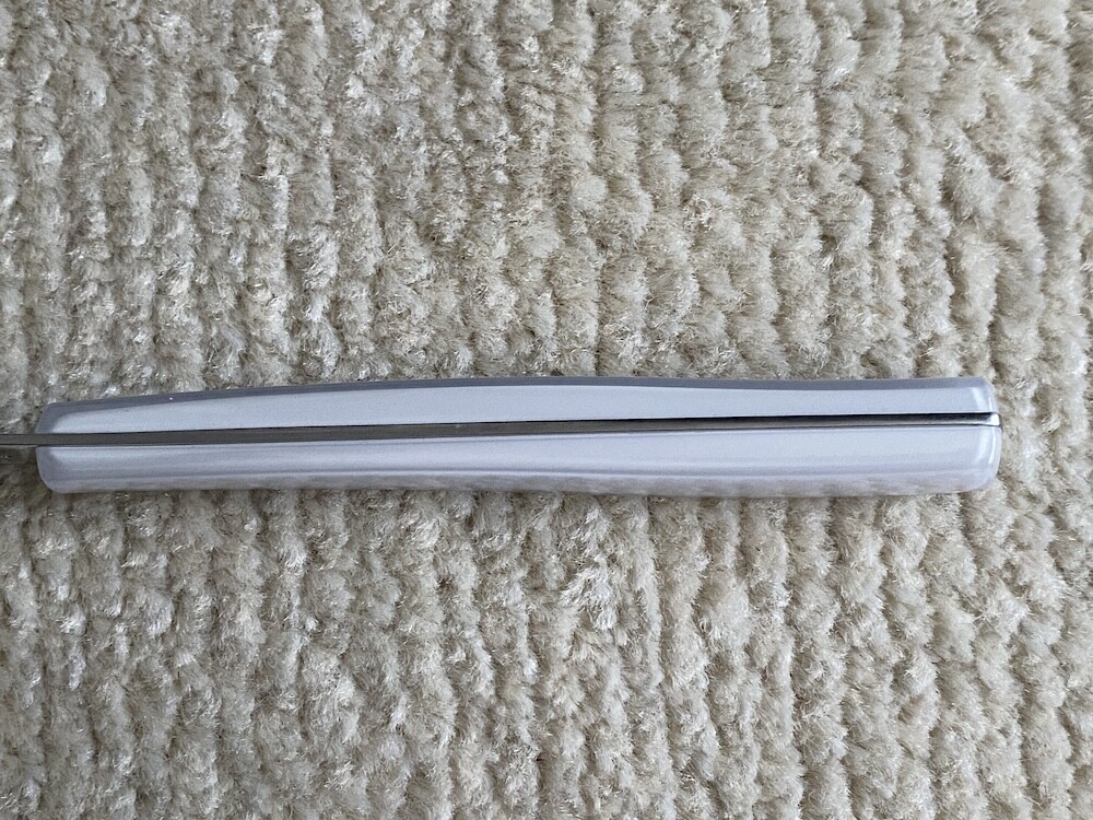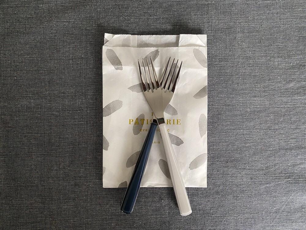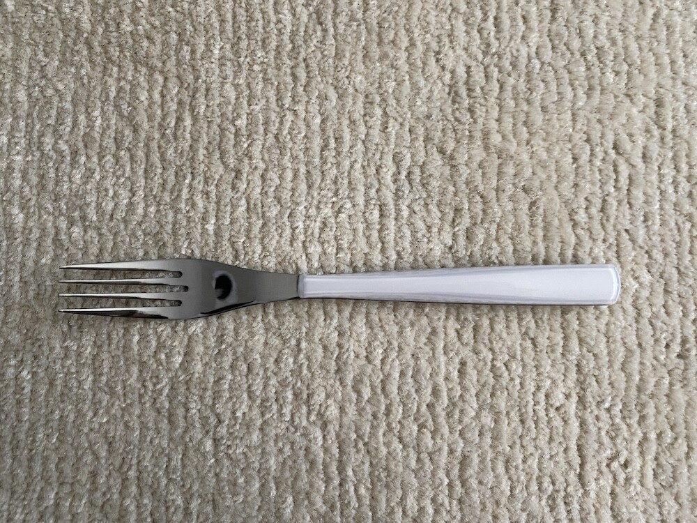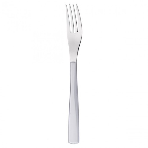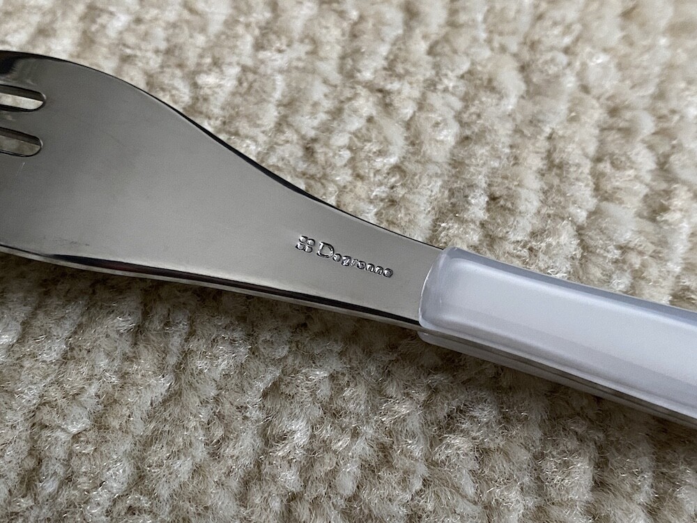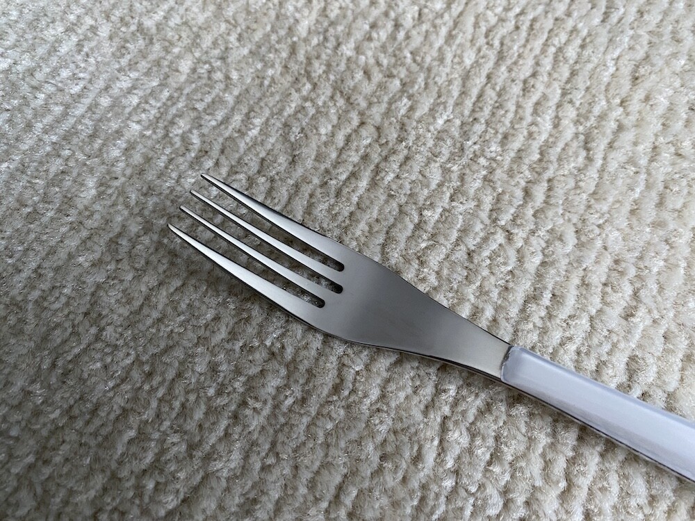 튼튼한 스테인리스 스틸의 포크에 곡선미가 있는 손잡이가 부착된 포크예요. 스테인리스 부분에는 폴리 미로와 Poli-miroir라는 경면 광택 처리가 되어 있어서 난연성 및 파손 방지 기능이 있다고 해요. 무엇보다 반투명한 느낌의 손잡이가 정말 예쁘고 손잡이 부분에 곡선이 있어서 잡았을 때 그립감이 좋아요. 묵직한 무게감도 고급스럽게 느껴지네요.