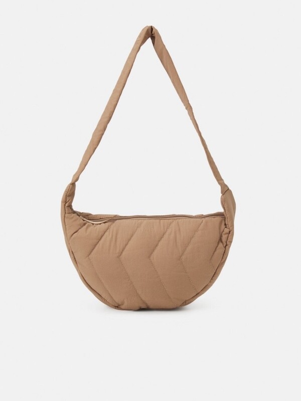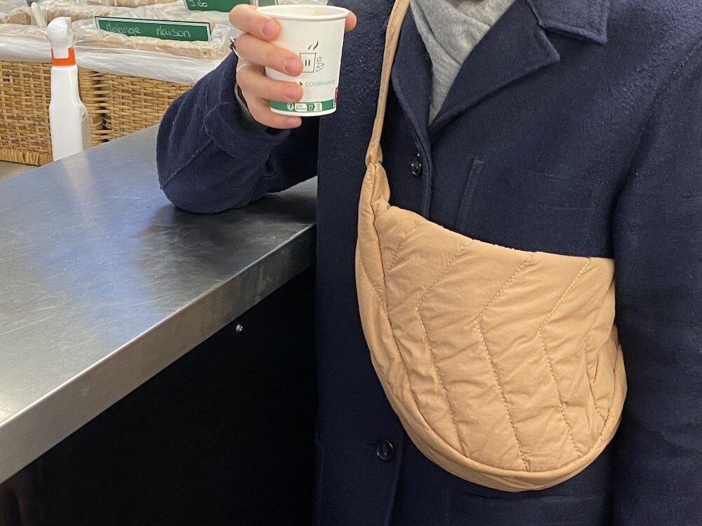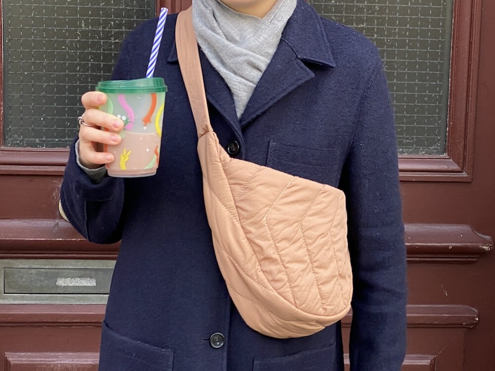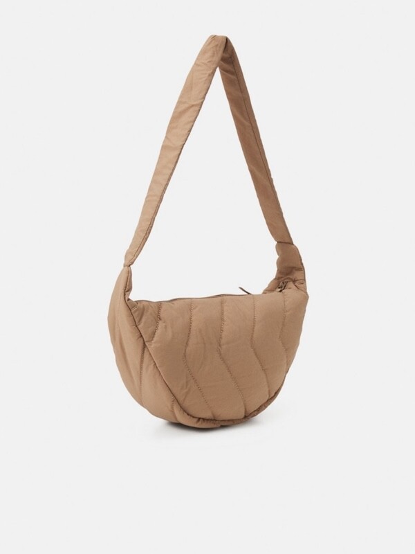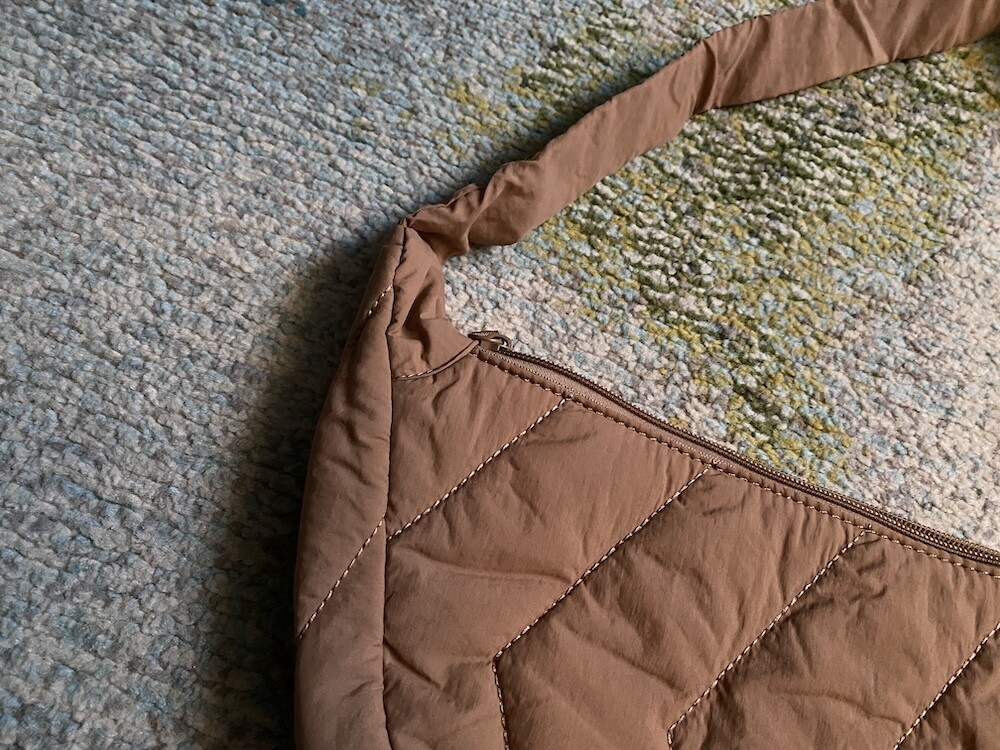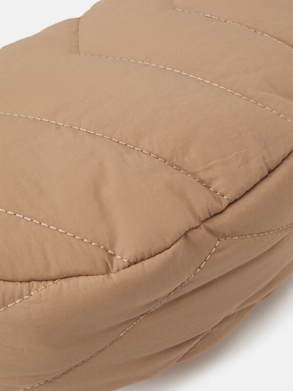 크로스로 멜 수 있는 범백(bumbag)이에요. 퀼팅된 소재로 만들어져 심심하지 않고 색깔이 튀지 않아 어떤 옷에나 잘 어울려요. 안쪽에 얇은 패딩 처리가 되어 있는데 이게 두툼하지 않고 가벼워서 사계절 내내 잘 사용하시게 될 거예요. 특히 원단의 원래 색깔은 연한 코코아 같은데 빛에 따라 연어색 같기도 하고 갈색 같기도 해서 예쁘더라고요. 저처럼 크로스로 메셔도 예쁘고 어깨에 토트백처럼 메셔도 예쁩니다.