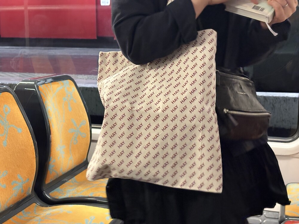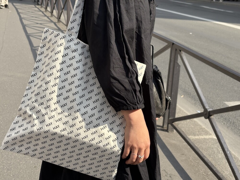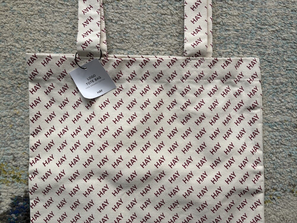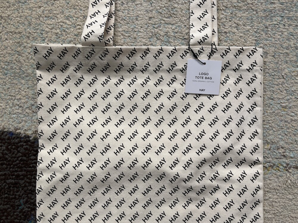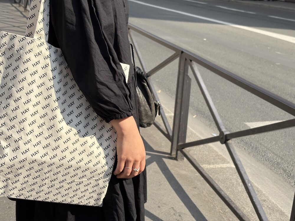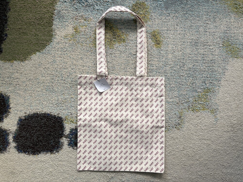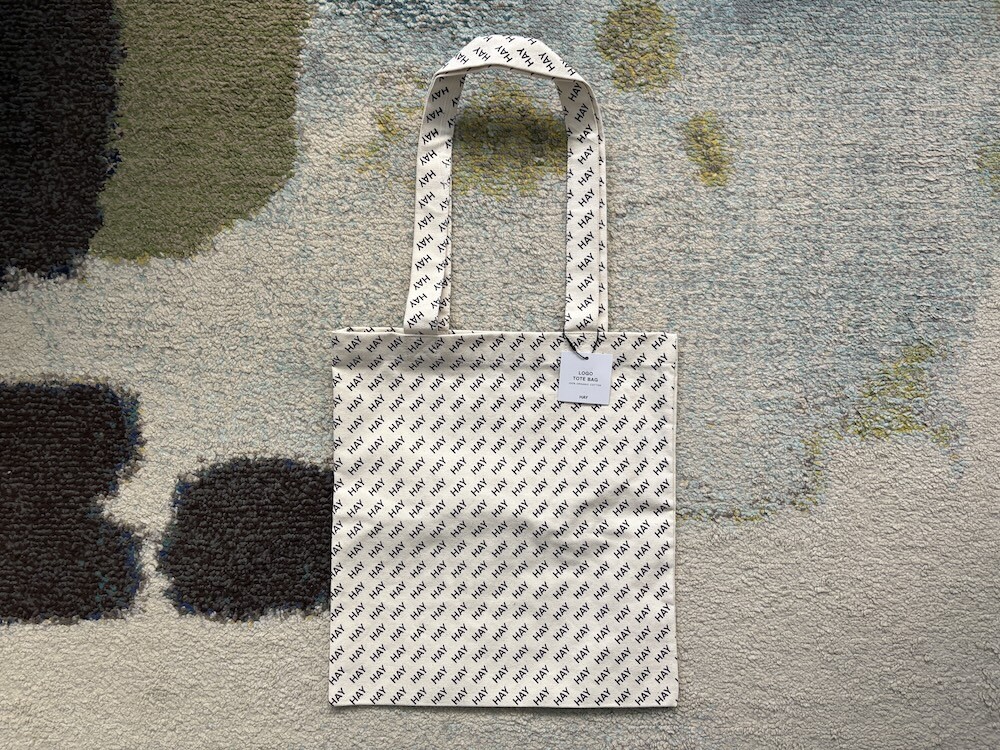 탄탄한 오가닉 면 원단에 헤이 HAY 로고가 사선으로 프린트된 제품이에요. 글씨가 작아서 멀리서 보면 패턴처럼 보이는 게 예뻐요. 어깨끈이 두꺼워서 무거운 물건들을 많이 넣어도 안정감 있게 어깨에 멜 수 있으니 무거운 짐을 많이 넣으셔야 할 때 사용하시기 좋을 거예요.
