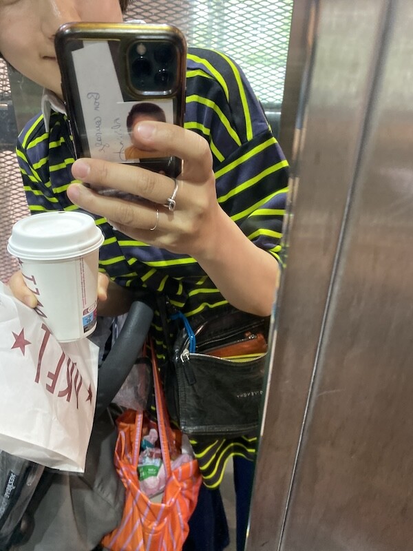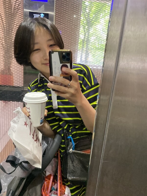 키는 161 cm 정도, 몸무게는 55 이상 60 미만인데(몸무게가 왔다갔다해서 정확한 무게가 몇인지 모르겠어요.) 출산 후 몸이 퍼져서 덩치가 커져 M사이즈가 꼭 맞아요.