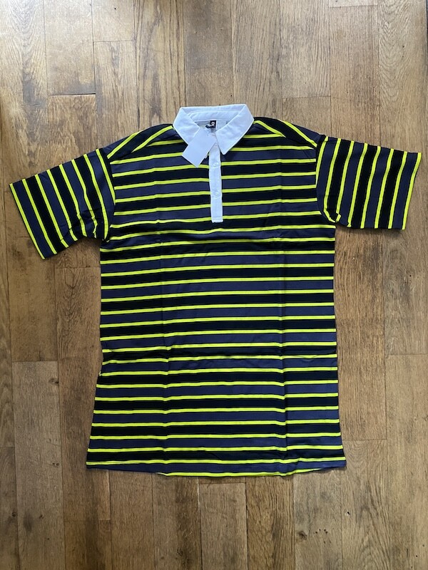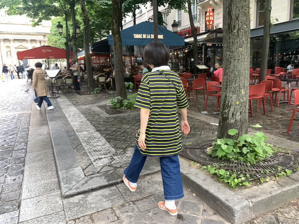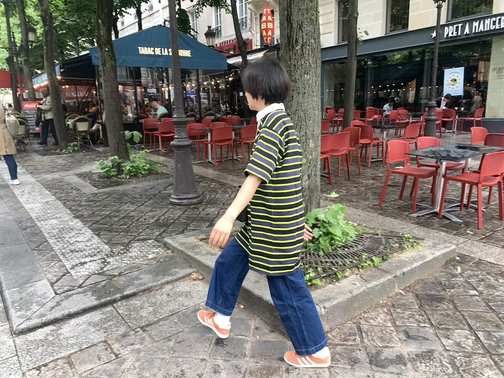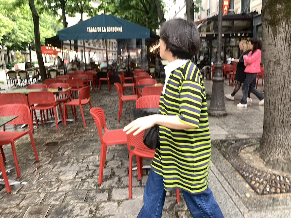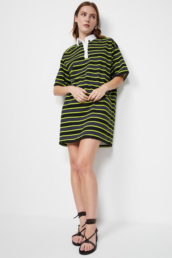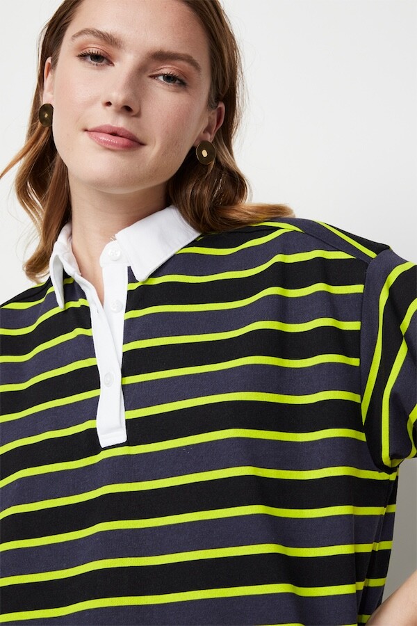 검정색과 진한 회색 줄무늬 사이사이에 레몬색(형광 노란색) 줄무늬가 들어간 오버사이즈 티셔츠입니다. 원래 원피스로 나온 제품이라 그런지 길이가 넉넉해서 원피스로 입어도 예쁘고 바지와 함께 입어도 예뻐요. 흰색 칼라가 달려 있어서 디자인이 심심하지 않고, 소재감이 톡톡해서 몸에 들러붙지 않아서 좋더라고요.