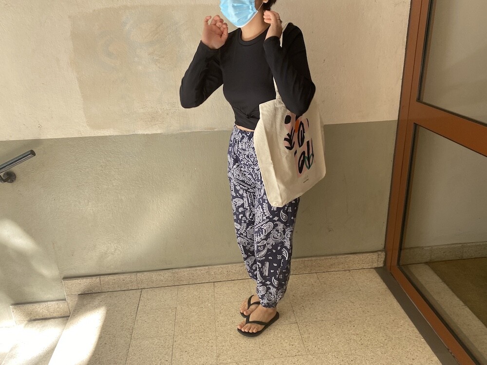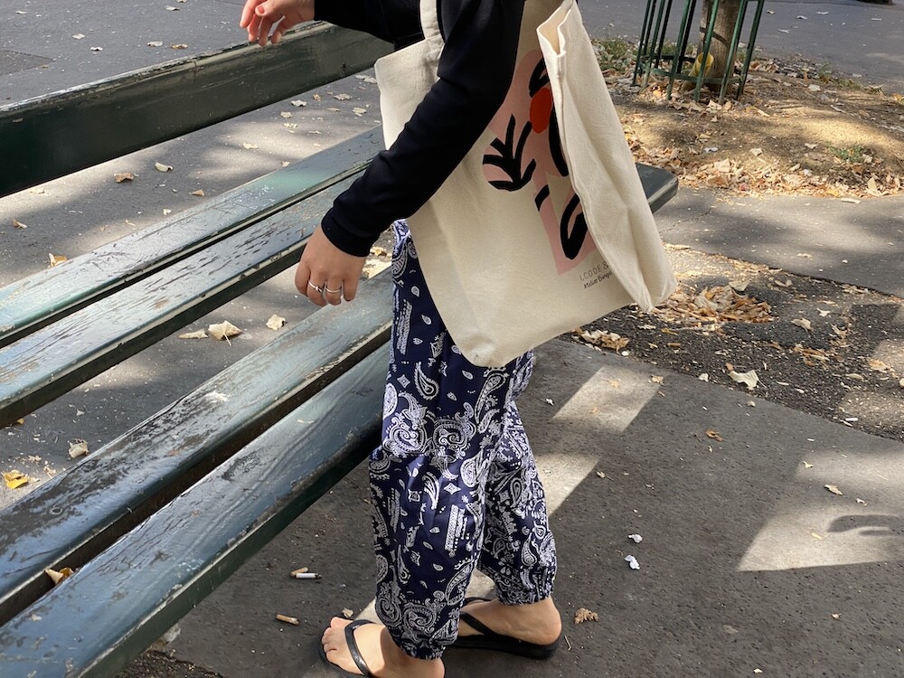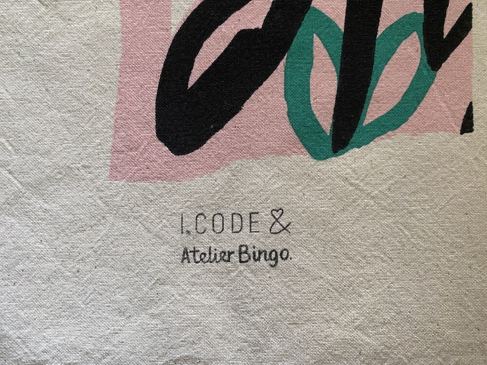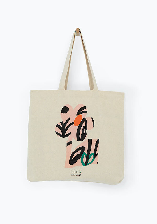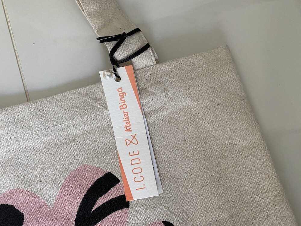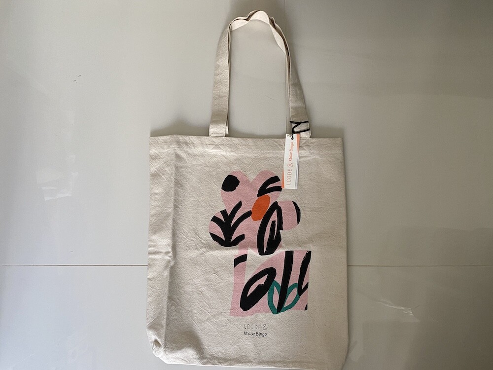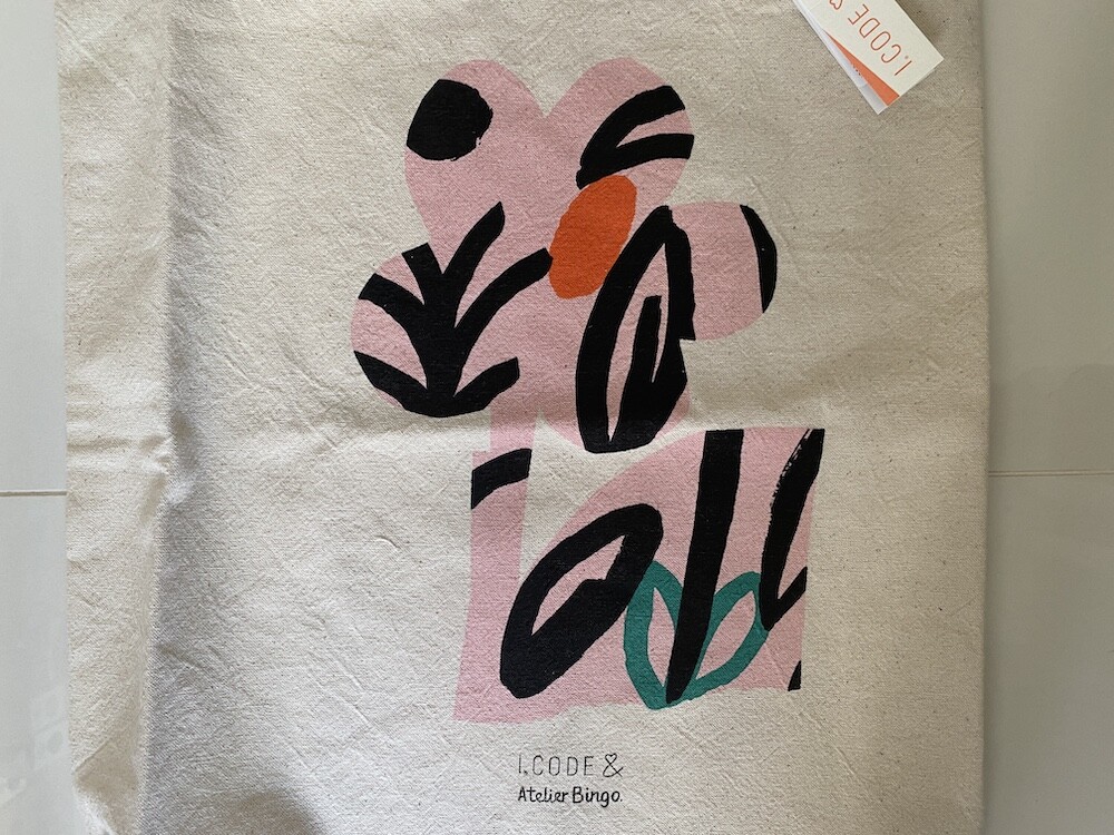 아이코드(I.CODE)는 익스의 여성복 라인으로, 이 에코백은 아이코드와 아뜰리에 빙고의 콜라보로 만들어진 제품입니다. 아뜰리에 빙고의 귀여운 꽃 일러스트가 프린트된 가방으로, 그림에서 느껴지는 색감과 형태감이 귀엽고도 예뻐요. 원단에서 느껴지는 조직감도 가방을 심심해보이지 않게 해주어 좋네요.
