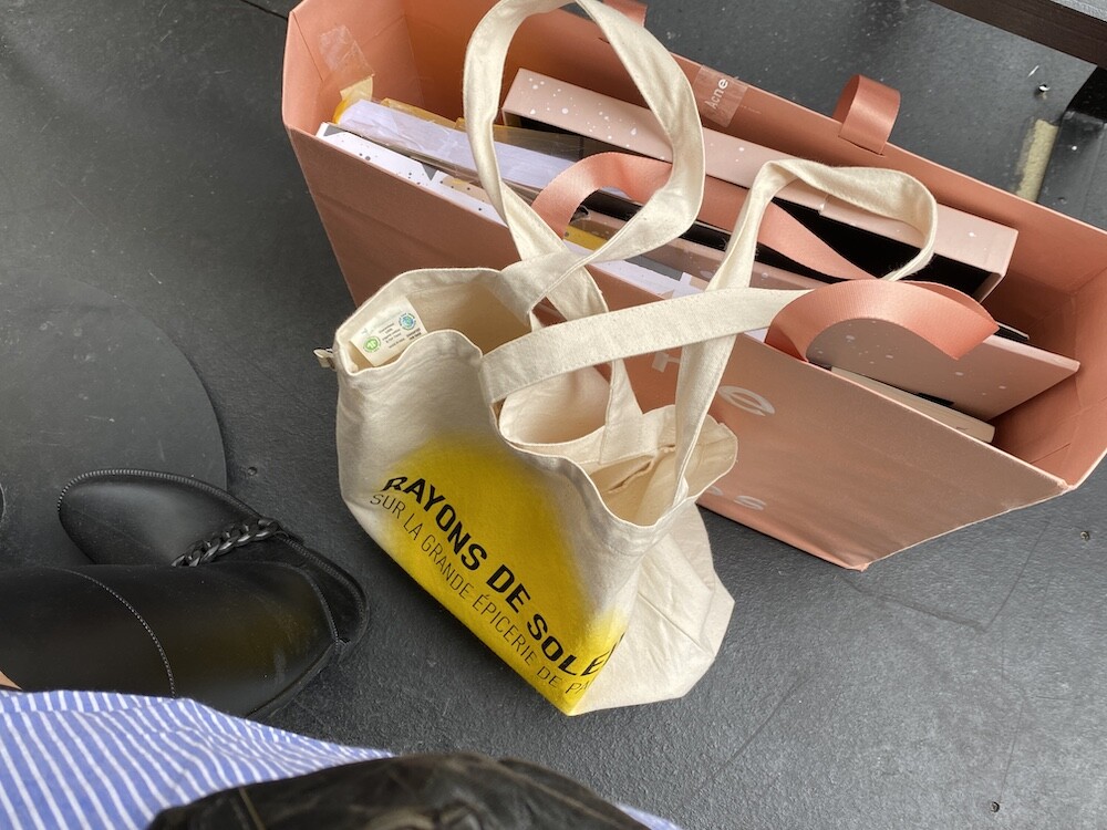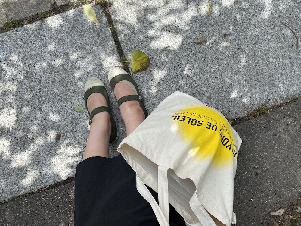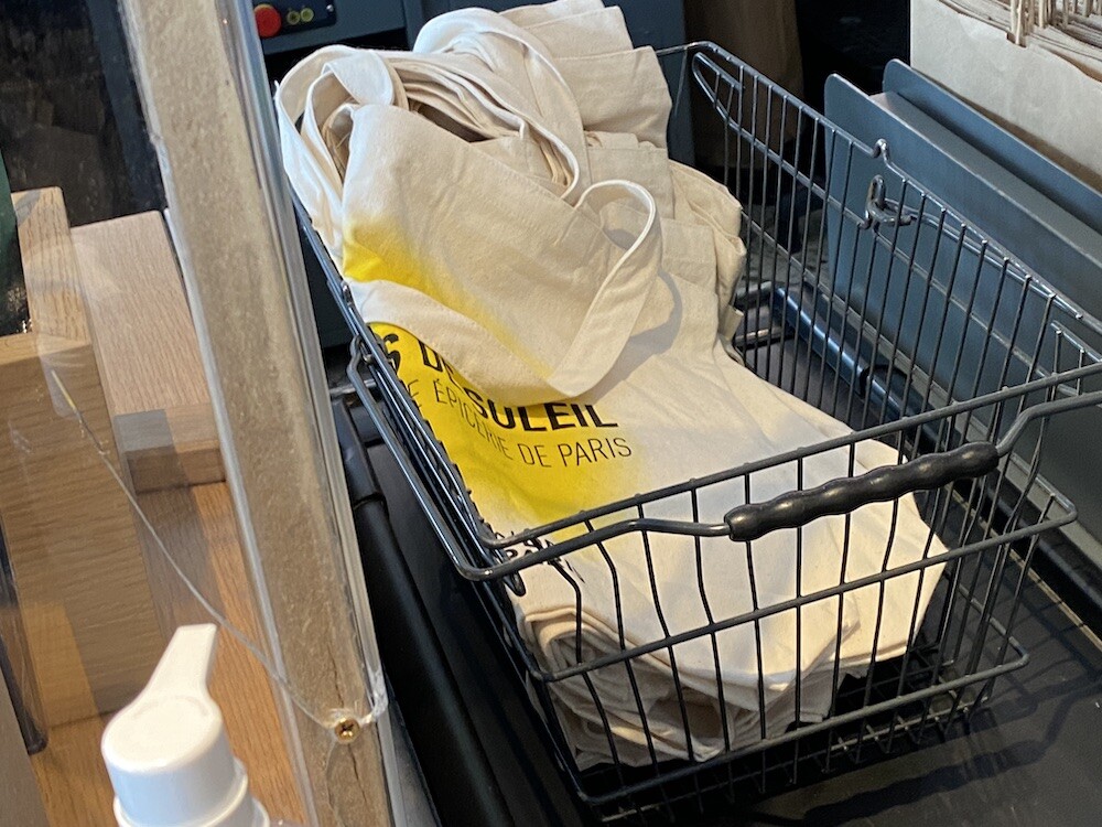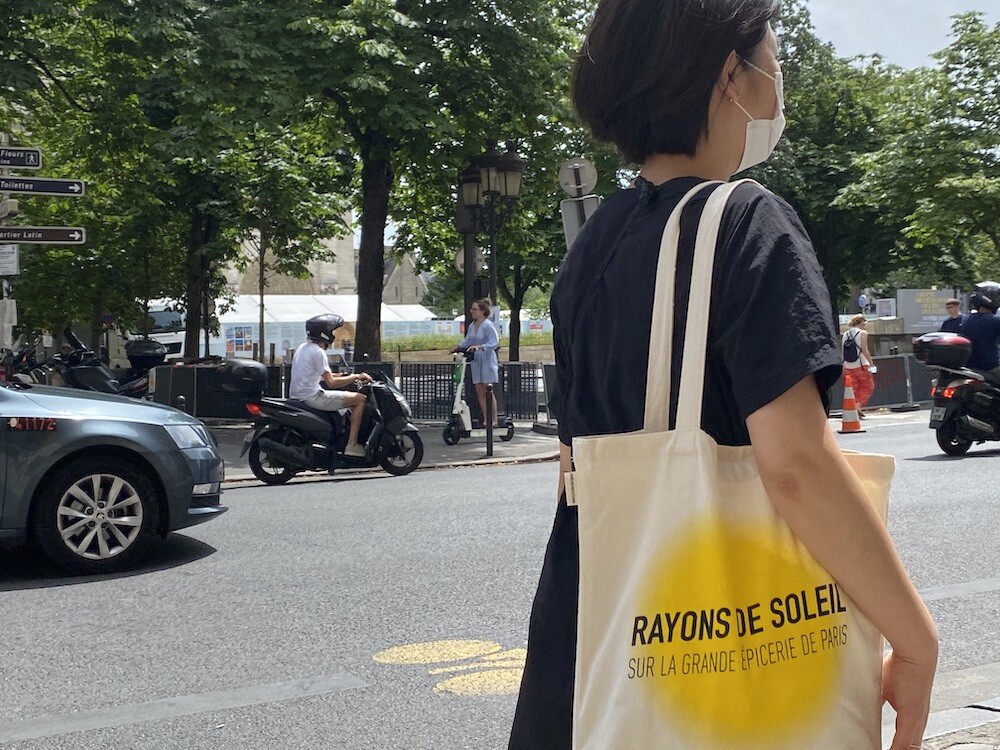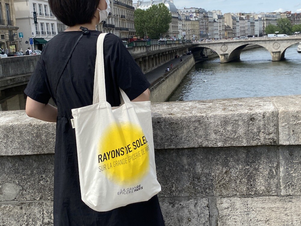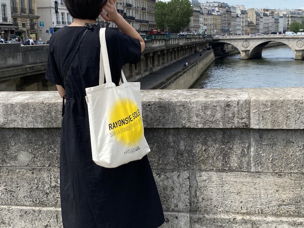 가방에 씌여 있는 RAYONS DE SOLEIL는 '햇살, 햇빛'이라는 뜻인데요. 코로나로 인한 오랜 봉쇄를 끝낸 후 봉막쉐 백화점이 처음으로 준비한, 이번 시즌의 컨셉의 이름이기도 해요. 현재 봉막쉐 매장은 노란색의 햇살 모양으로 장식되어 있답니다.