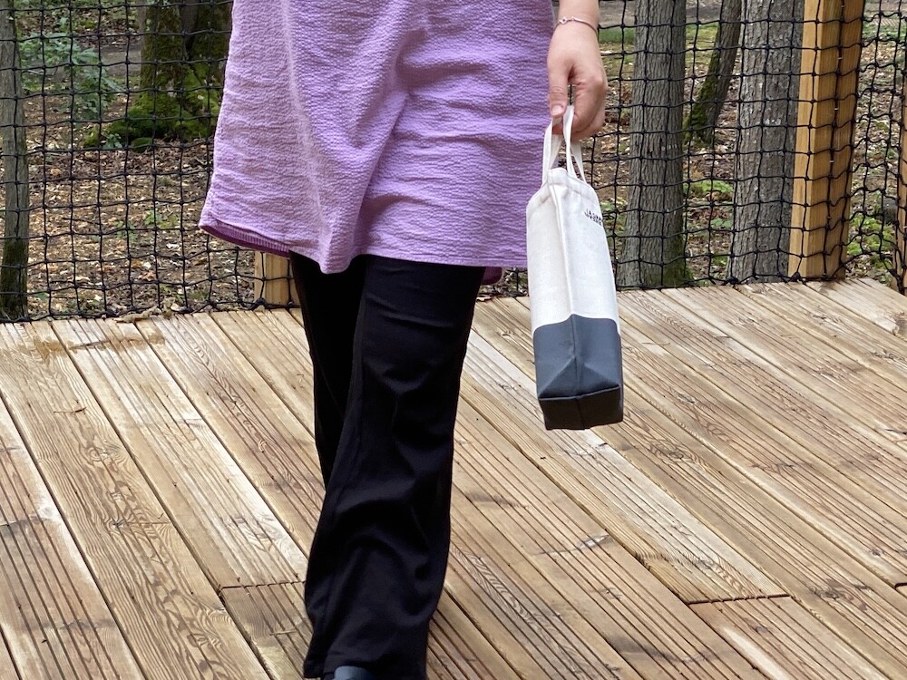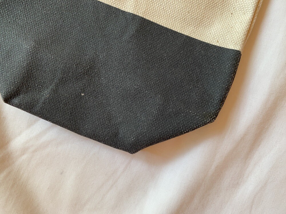 와인이나 음료를 담아 들고 다닐 수 있는 와인 백이에요. 튼튼한 면소재에 밑부분엔 진회색 프린트, 윗부분엔 자수가 놓여 있는데 아랫 부분의 프린트 덕분에 가방 모서리가 덜 닳아서 오래 사용할 수 있어요. 또 색깔이 너무 튀지 않아서 어떤 옷과도 잘 어울려요.
