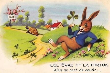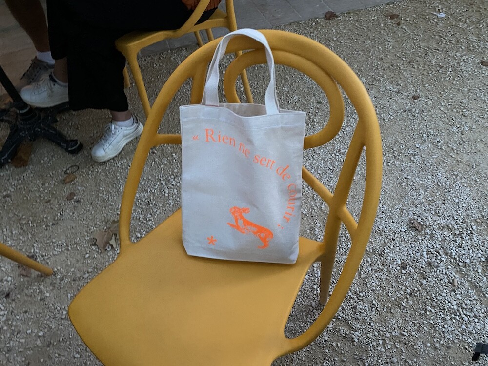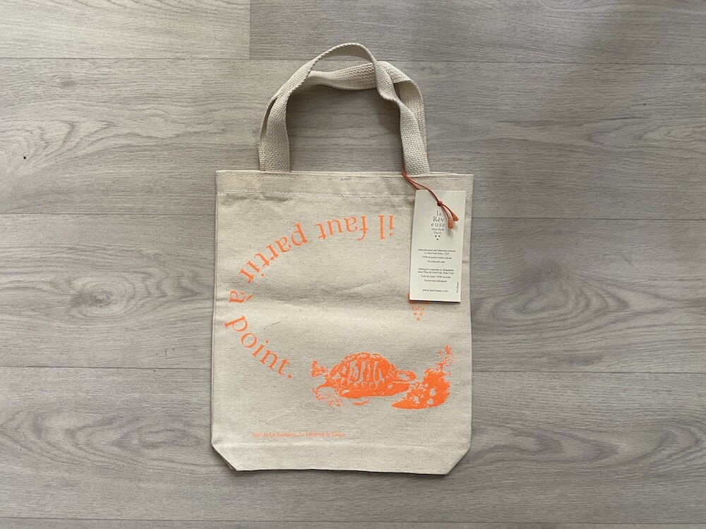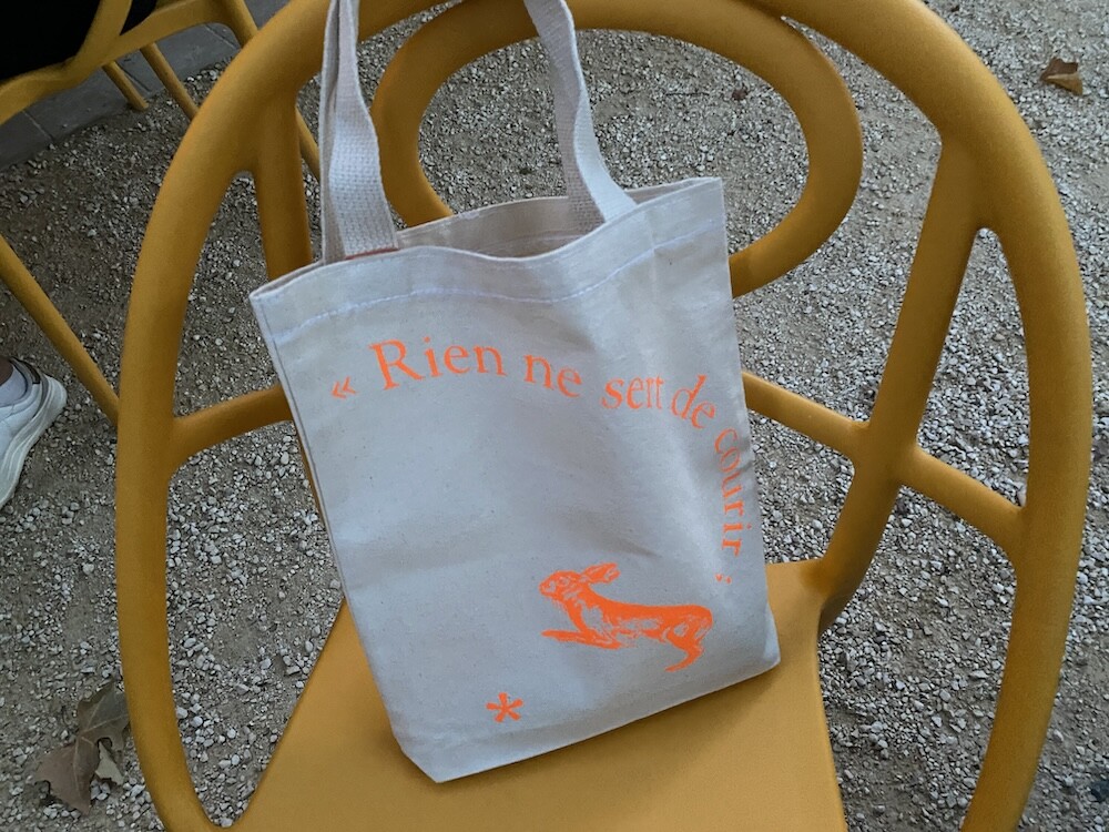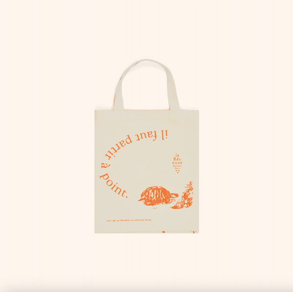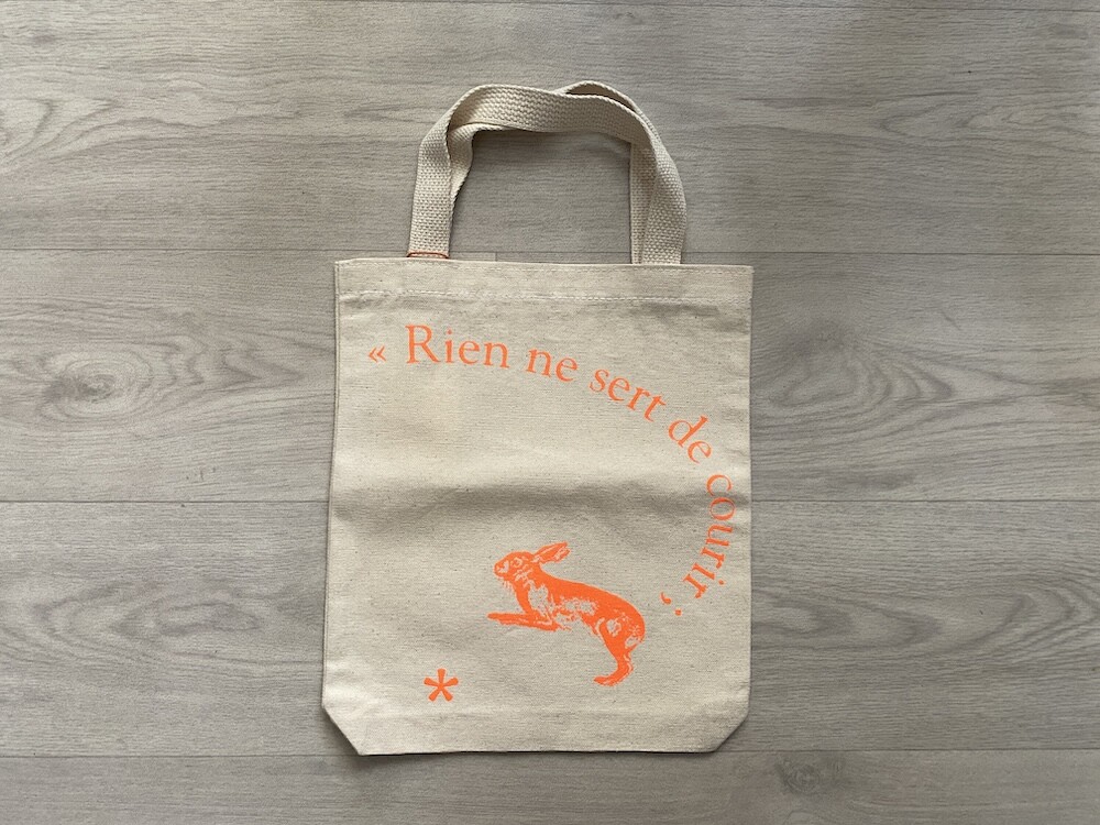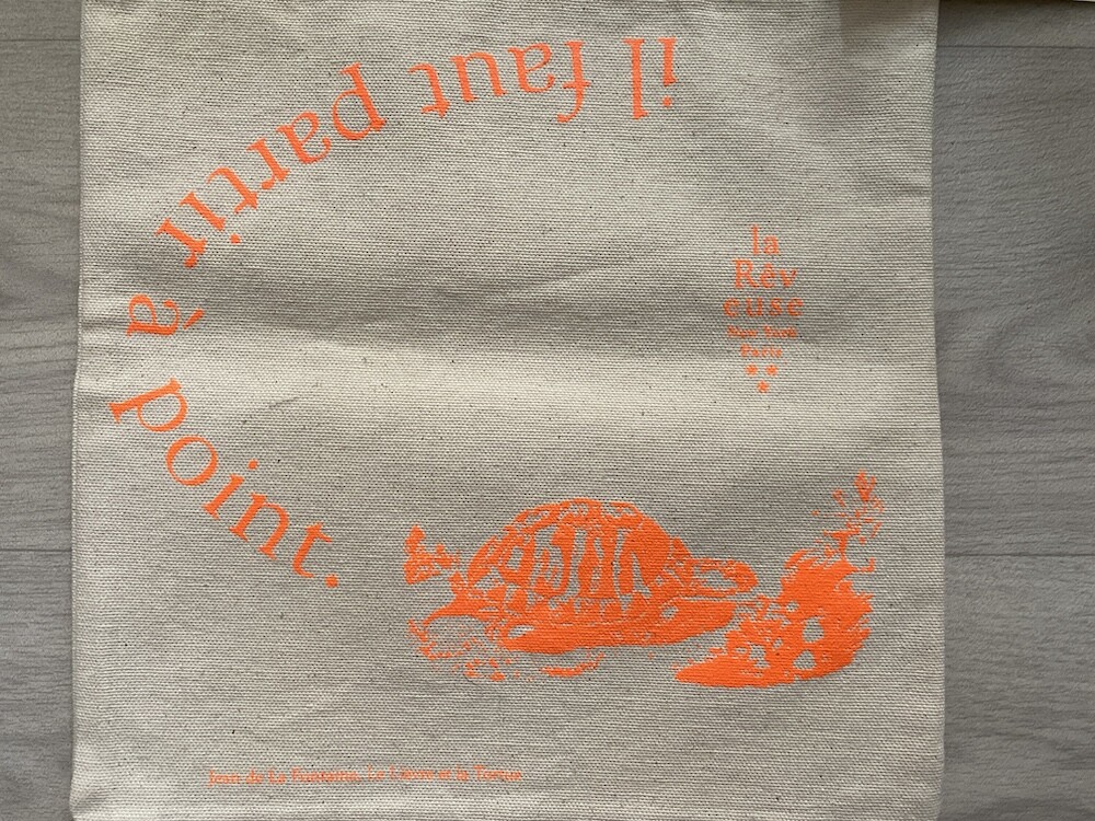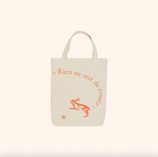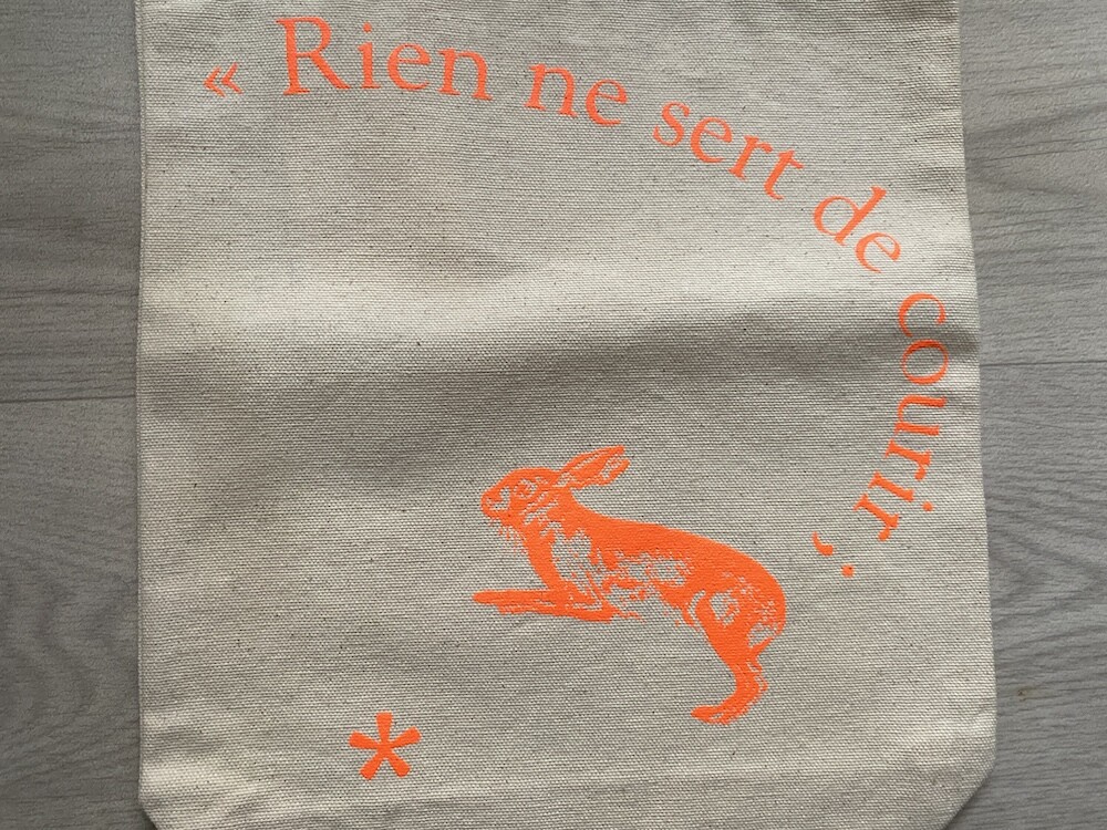 토끼와 거북이 이야기의 한 장면이 형광빛의 주황색으로 프린트된 제품이에요. 귀여운 건 그림에 씌여진 글씨인데요. 토끼가 있는 면에 써진 건 "Rien ne sert de courir 뛸 필요 없어"이고, 거북이가 있는 면에 써진 건 "il faut partir à point 시간에 맞춰 떠나야 해"예요. 동화책 속 토끼와 거북이의 성격을 잘 보여 주는 문장이네요.