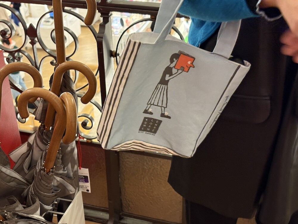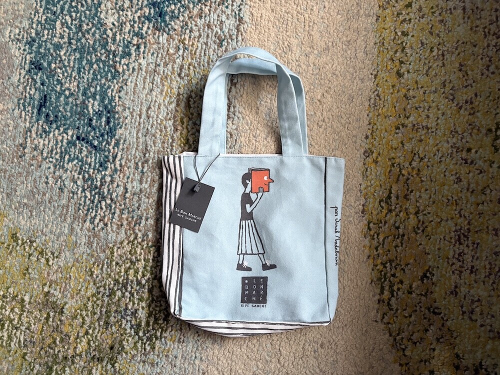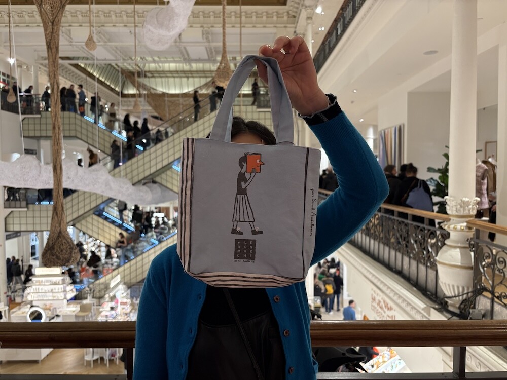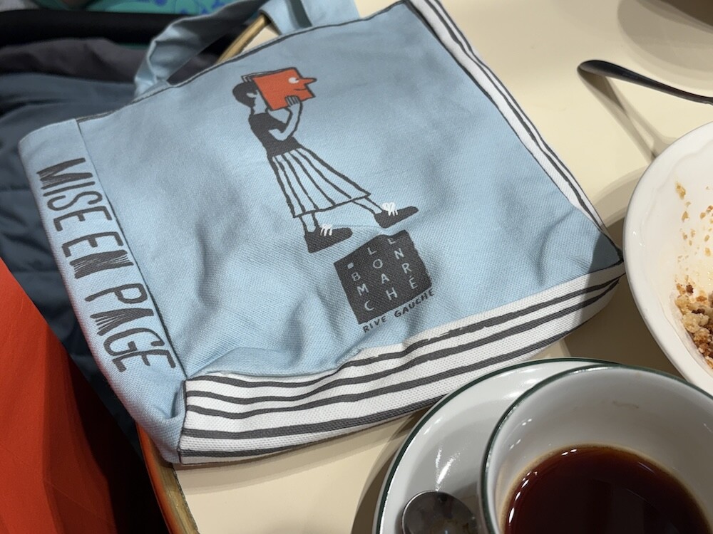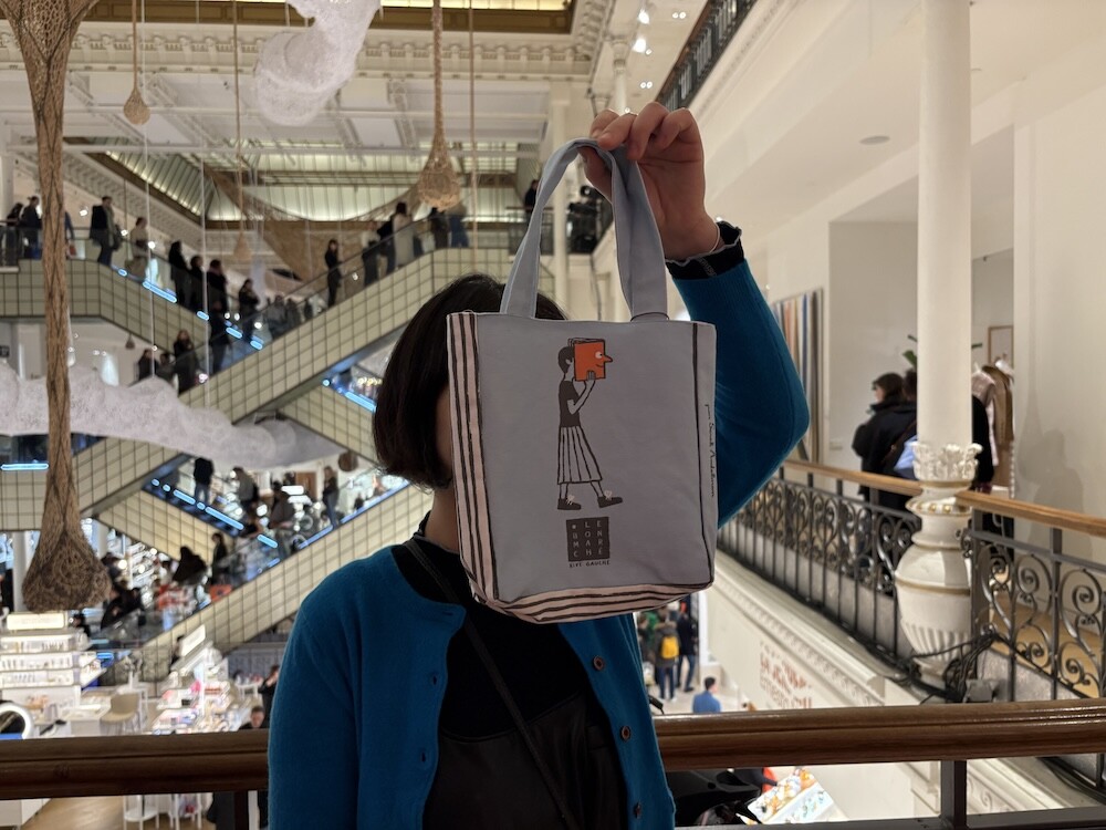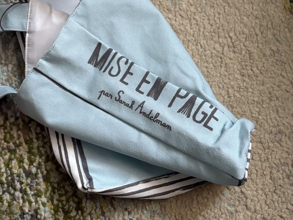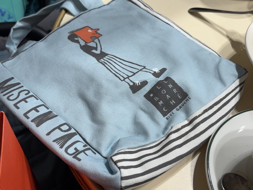봉막쉐에서 열렸던 장 줄리앙(Jean Jullien)의 전시, 미정빠쥬 Mise En Page 팝업에서 한정으로 나온 미니 에코백입니다. 가방의 모양 자체가 책처럼 생겨서 귀여운데요. 손으로 들고 있으면 꼭 책을 들고 있는 것처럼 책의 종이 같은 느낌을 옆면에 그려 놓아서 재치있어요. 책을 좋아하시는 분들께서 좋아하시는 책 두세 권 넣어 들고 다니시기 딱 좋은 사이즈예요.