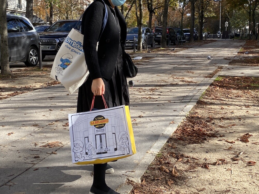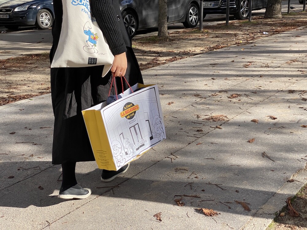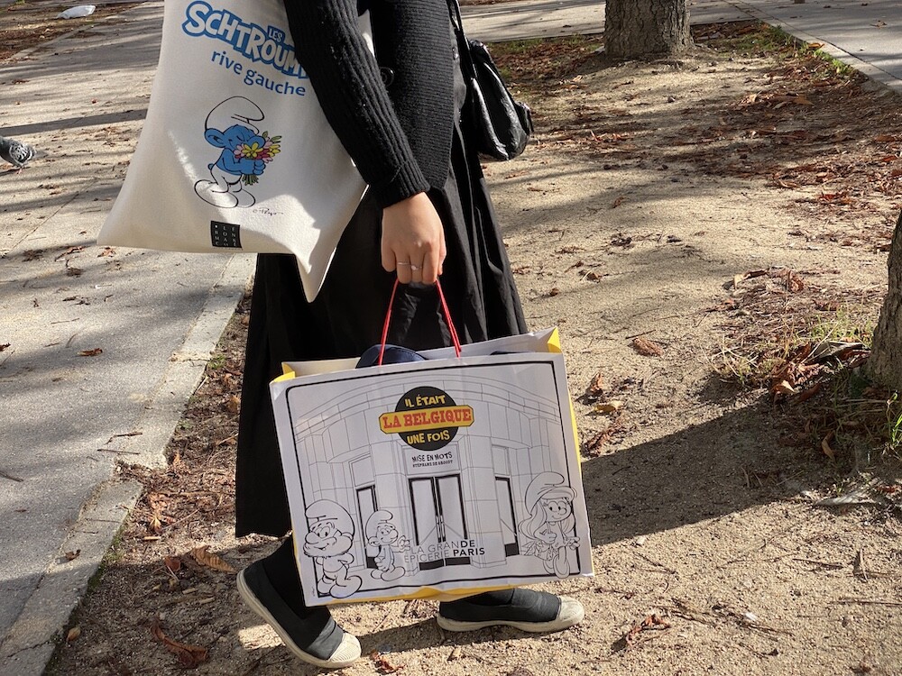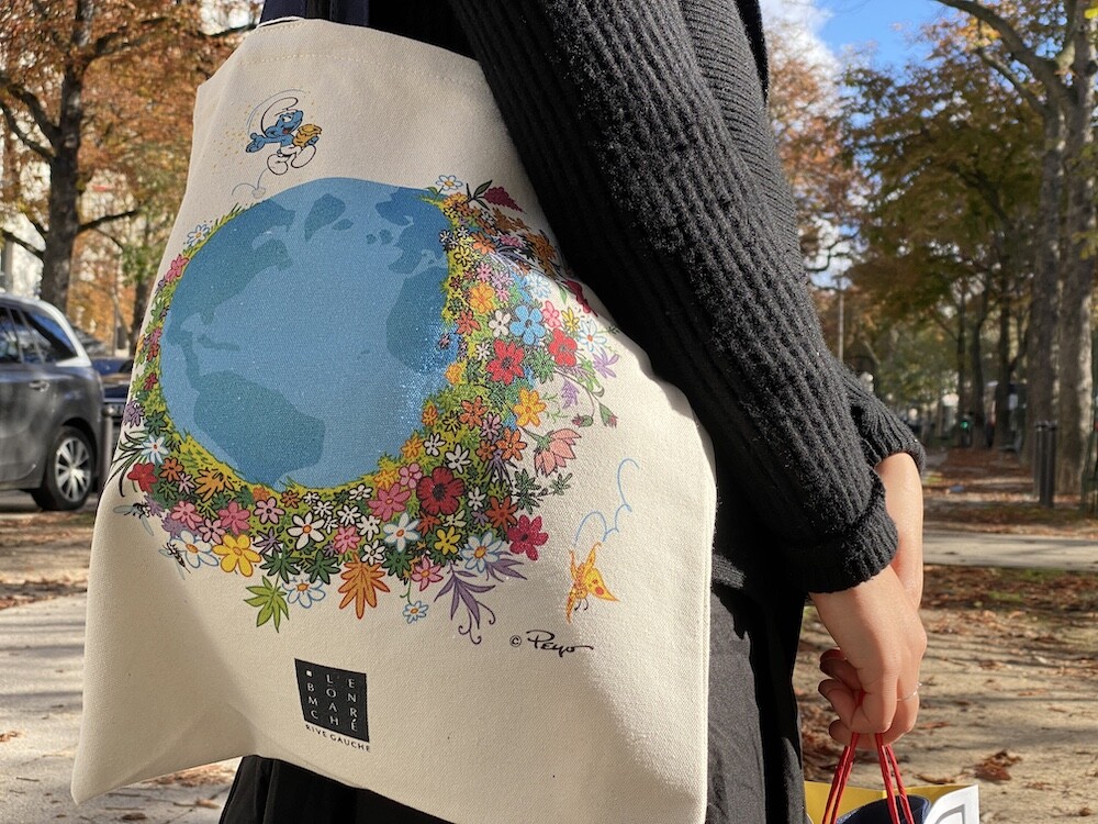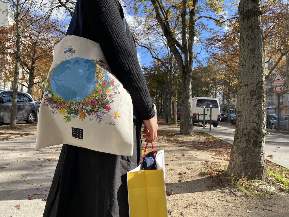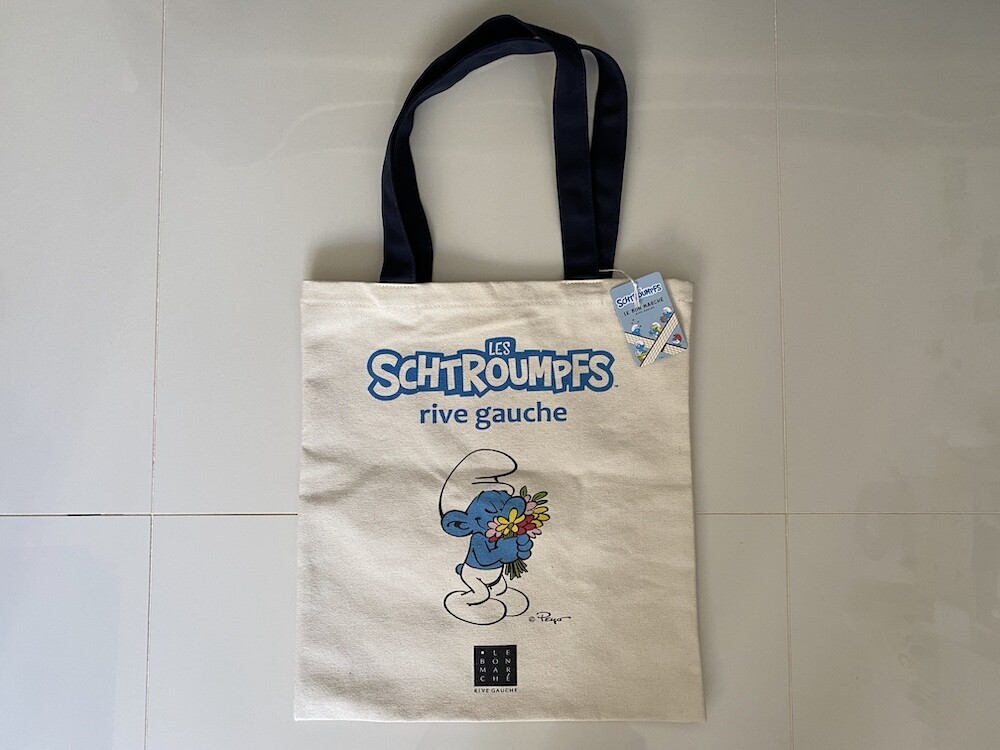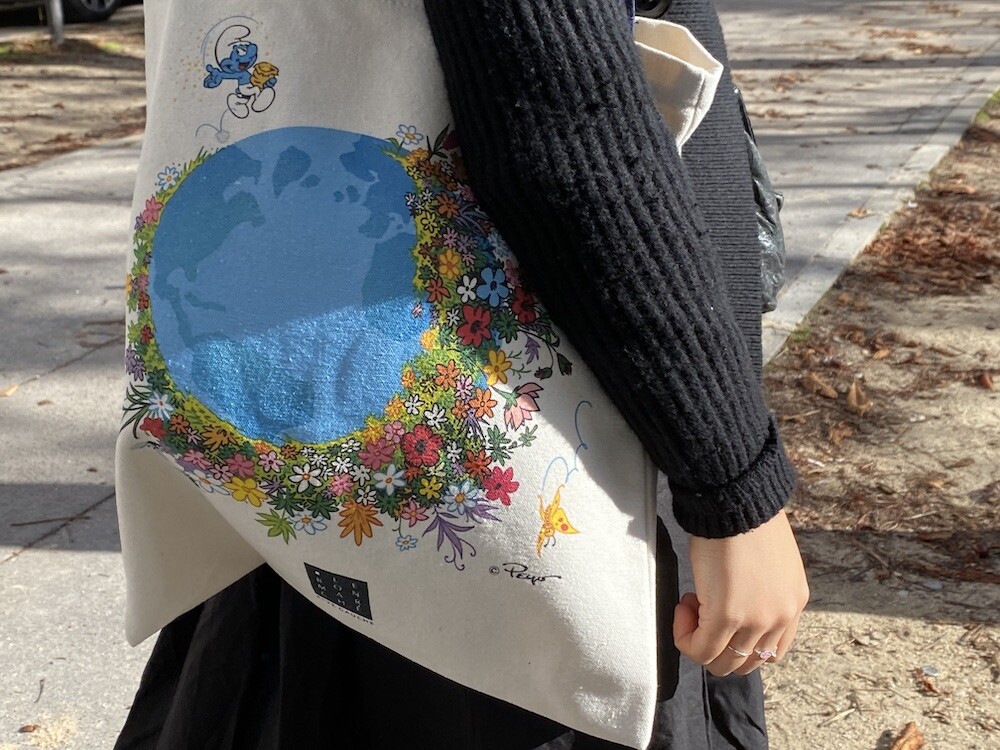 이 에코백은 벨기에 이벤트를 위해 한정판으로 나온 제품이에요. 앞뒷면 그림이 달라서 두가지 디자인으로 활용할 수 있어서 너무 좋고, 원단이 튼튼해서 무거운 물건을 넣어 다니기에도 좋아요. 꽃을 들고 있는 스머프의 행복한 표정도, 그 꽃으로 둘러싸인 지구의 모습도 너무 예쁘게 표현되어 있어, 그림을 보고 있으면 기분까지 좋아지는 것 같아요. 각 그림엔 스머프를 그린 작가의 싸인까지 있네요.