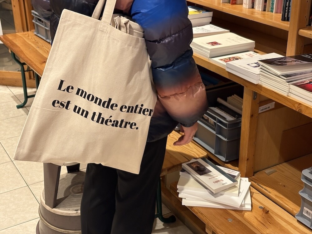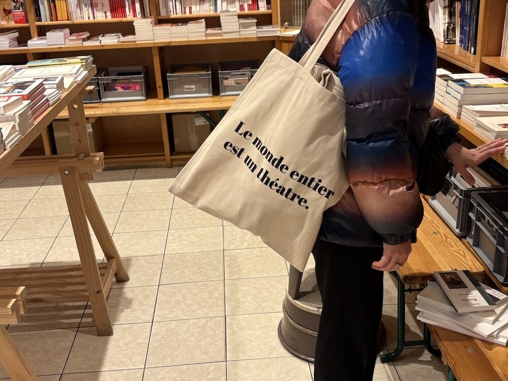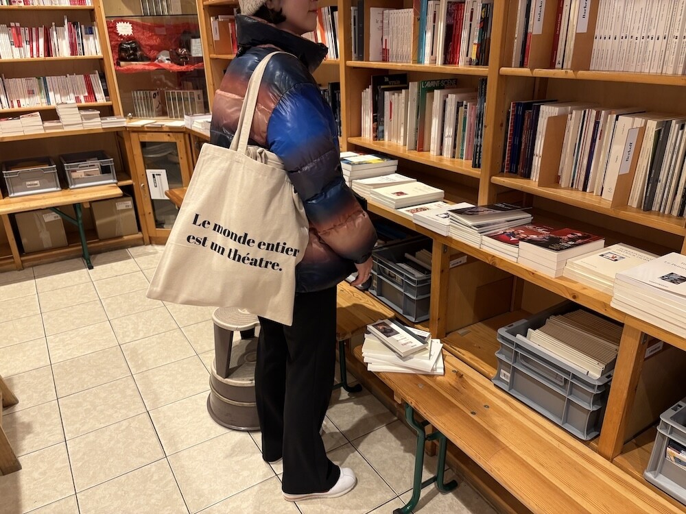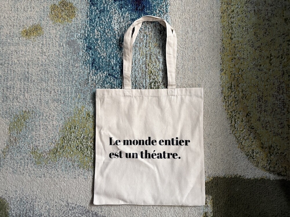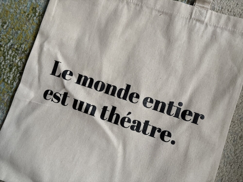 탄탄한 면 캔버스 원단에 글씨 프린트가 예쁘게 된 에코백입니다. 한쪽 면에는 서점의 이름과 주소가 써져 있고 다른 쪽 면에는 글씨가 써져 있는데, 여기에 써져 있는 'Le monde entier est un théatre.'는 '온 세상이 극장이다.'라는 뜻이에요. 이 글을 본 순간, 연극을 전공하거나 연극에 몸담고 있는 사람들 뿐 아니라 우리 모두에게 설레는 말이 아닐까 싶은 생각이 들었어요. 우리는 온 세상을 극장이라 생각하고 내 방식대로 아름답게 살아갈 수 있잖아요! 뭔가 꿈을 담은 말 같아서 설레더라고요.