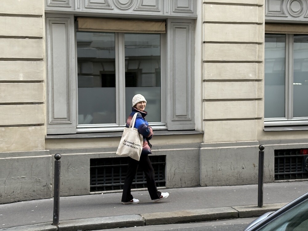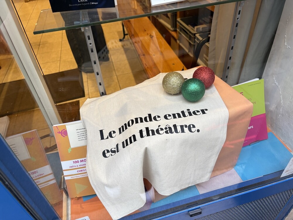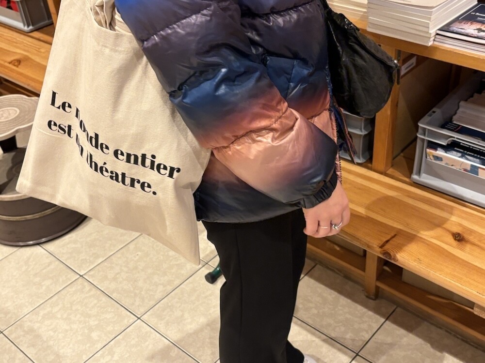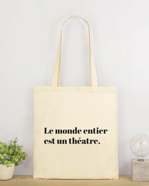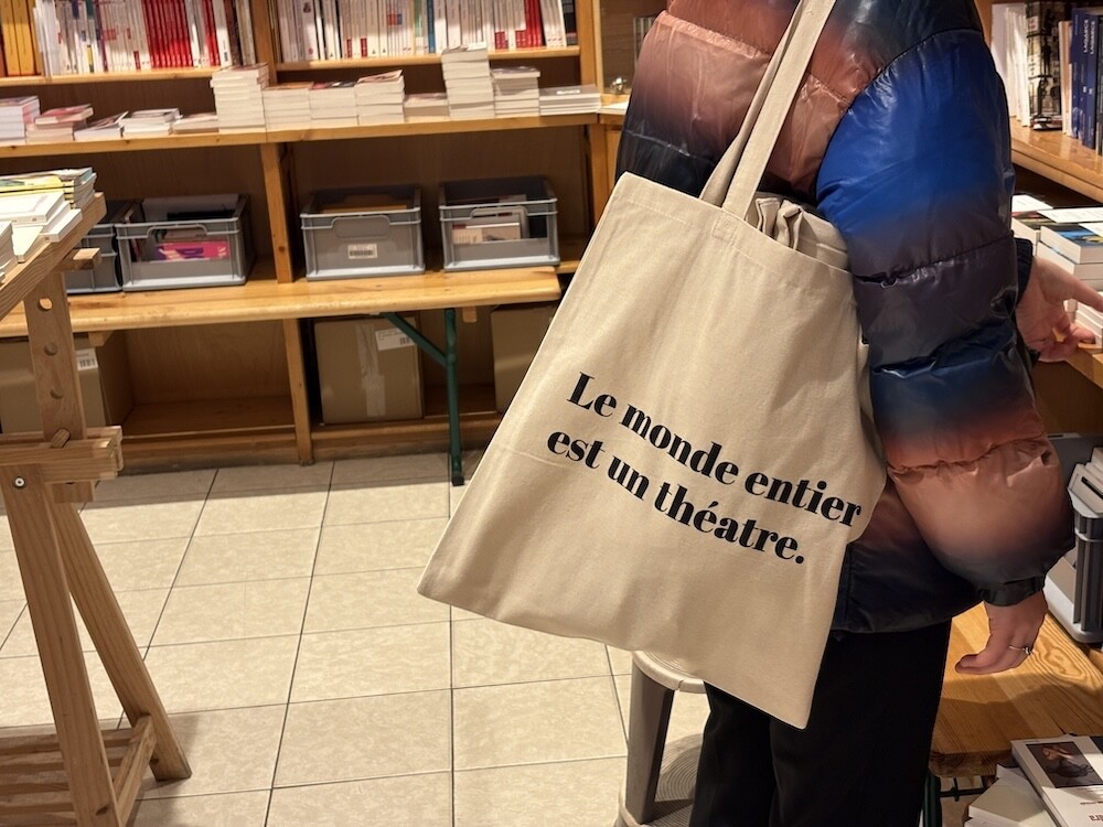 탄탄한 면 캔버스 원단에 글씨 프린트가 예쁘게 된 에코백입니다. 한쪽 면에는 서점의 이름과 주소가 써져 있고 다른 쪽 면에는 글씨가 써져 있는데, 여기에 써져 있는 'Le monde entier est un théatre.'는 '온 세상이 극장이다.'라는 뜻이에요. 이 글을 본 순간, 연극을 전공하거나 연극에 몸담고 있는 사람들 뿐 아니라 우리 모두에게 설레는 말이 아닐까 싶은 생각이 들었어요. 우리는 온 세상을 극장이라 생각하고 내 방식대로 아름답게 살아갈 수 있잖아요! 뭔가 꿈을 담은 말 같아서 설레더라고요.