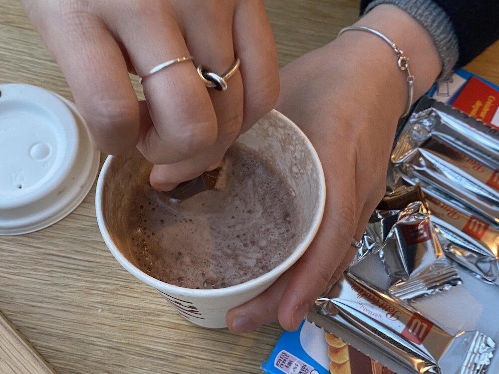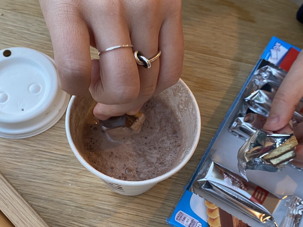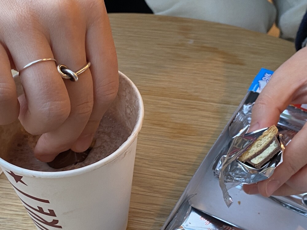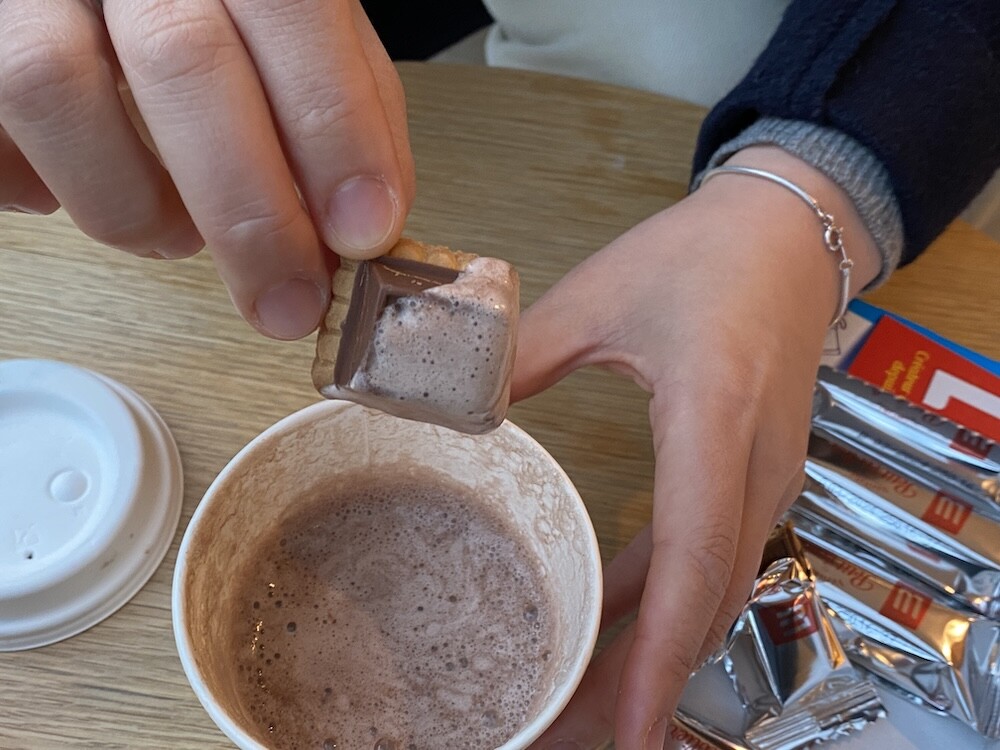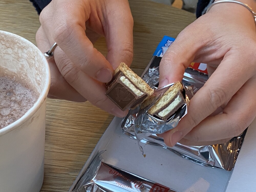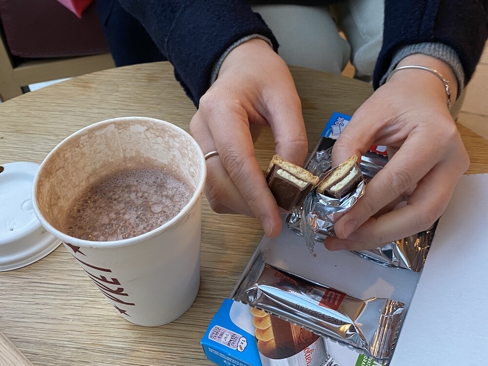위에 올라간 게 이미 밀크초콜릿인데 그 밑에 우유크림이 들어 있어서 씹으면 입 안에서 진한 밀크초콜릿이 완성돼요. 그래서 이 제품은 냉장고에 넣었다가 먹는 것도 맛있지만 개인적으로 초콜릿과 크림이 잘 섞일 수 있는, 조금 녹은 상태의 온도에서 먹는 게 더 조화롭게 느껴지더라고요. 참, 냉장고에 차갑게 넣었다가 따뜻한 우유에 찍어서도 꼭 드셔 보세요!