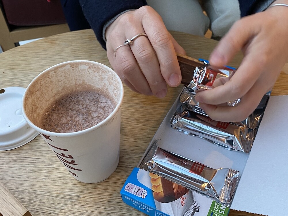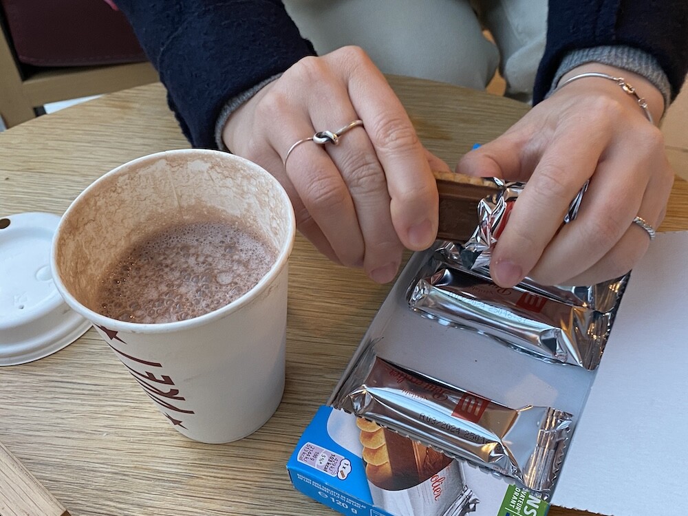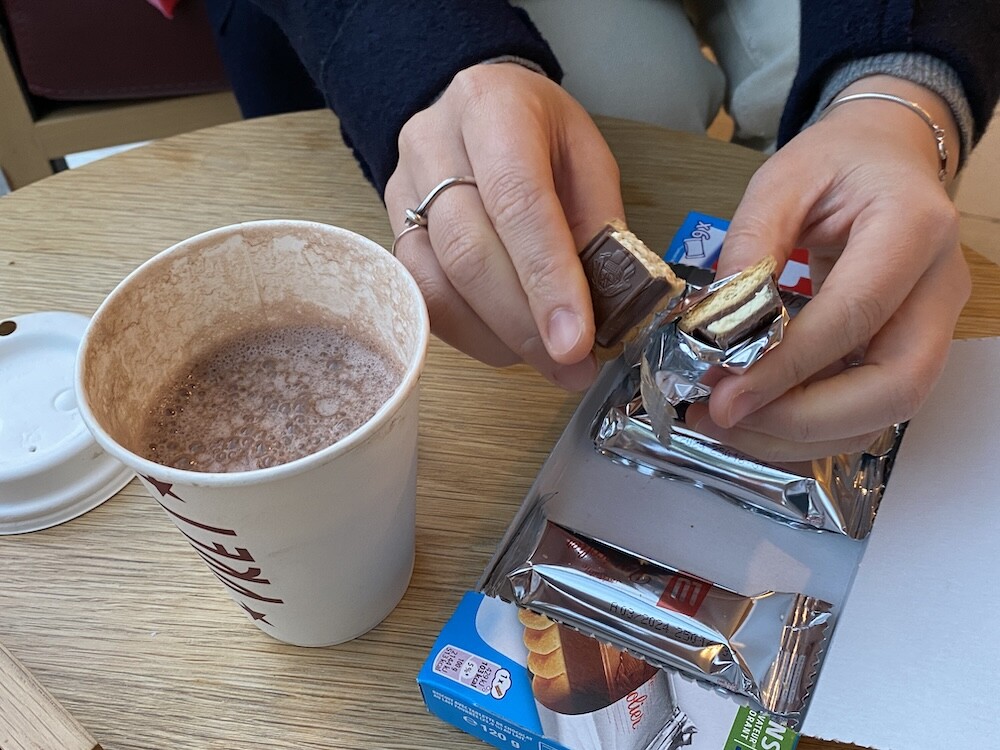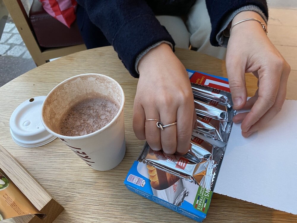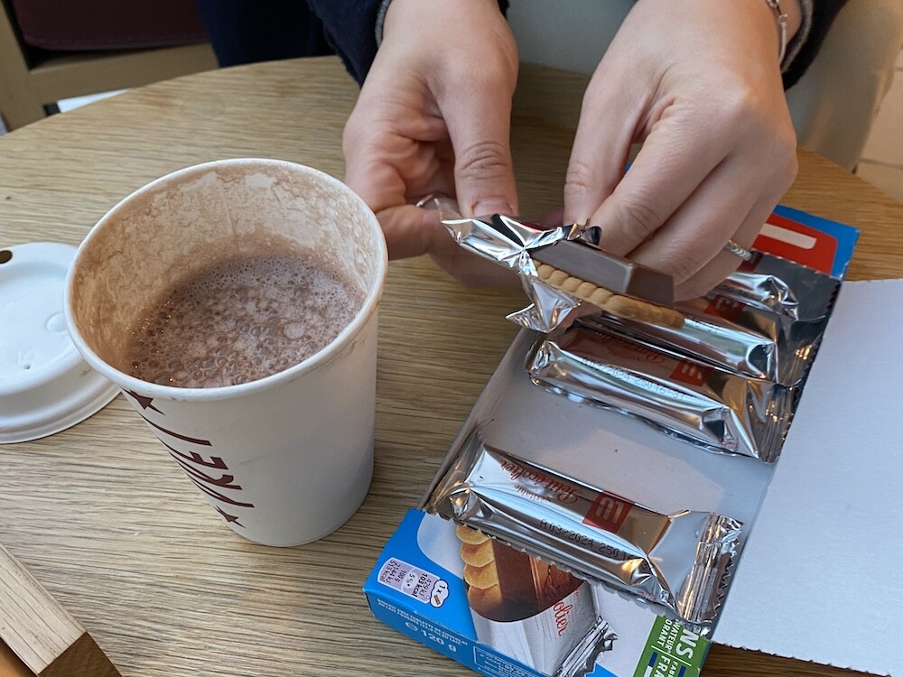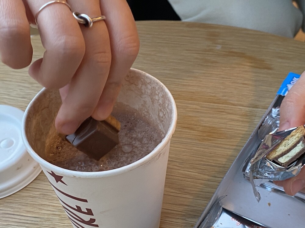 위에 올라간 게 이미 밀크초콜릿인데 그 밑에 우유크림이 들어 있어서 씹으면 입 안에서 진한 밀크초콜릿이 완성돼요. 그래서 이 제품은 냉장고에 넣었다가 먹는 것도 맛있지만 개인적으로 초콜릿과 크림이 잘 섞일 수 있는, 조금 녹은 상태의 온도에서 먹는 게 더 조화롭게 느껴지더라고요. 참, 냉장고에 차갑게 넣었다가 따뜻한 우유에 찍어서도 꼭 드셔 보세요!