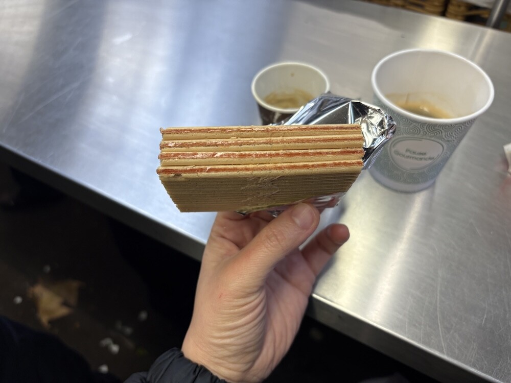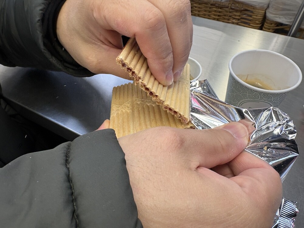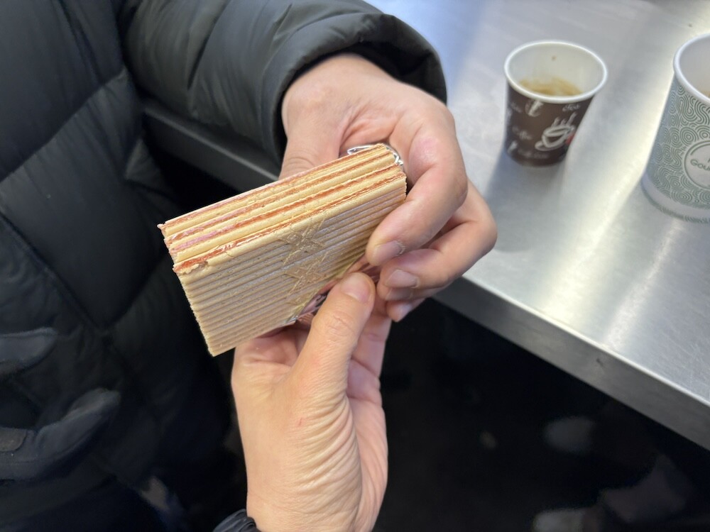 쫀득한 산딸기잼이 매력적인 과자예요. 겉의 과자 식감은 한국의 초코하임과 비슷한데 그 안에 아주 쫀득한 산딸기잼이 들어 있어서 씹는 맛도 재미있고 맛도 좋은 과자예요. 이런 식감의 과자는 한국에서는 먹어 본 적이 없을 정도로 잼이 쫀쫀하답니다. 사각사각 쫀득한 맛이 좋아서 먹다 보면 한 봉지 뚝딱이에요. 드실 때는 한 판을 통째로 드시지 마시고, 선을 따라 잘라서 하나씩 드시면 독특한 식감이 더 잘 느껴집니다.