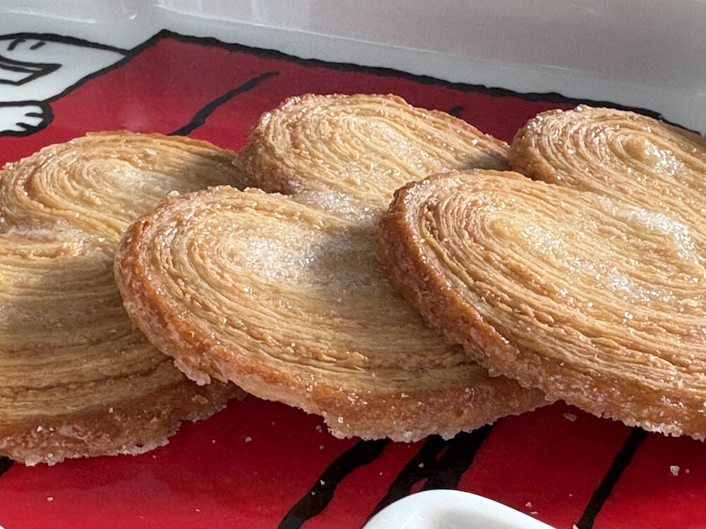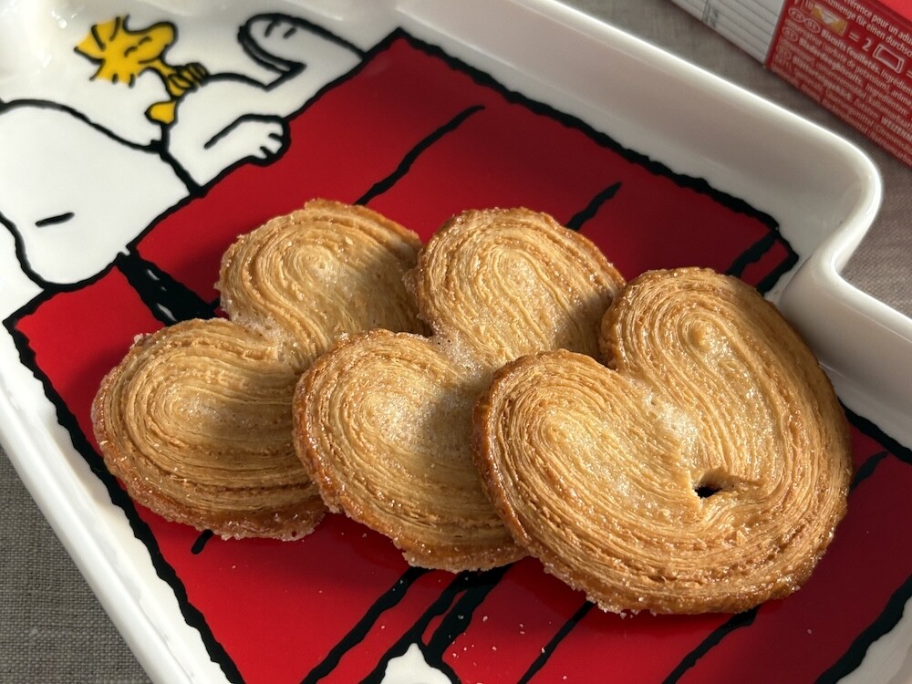 파삭한 식감의 과자입니다. 겹겹이 쌓인 느낌의 패스트리 과자 위에 설탕을 녹여 단단하게 만든 비스킷으로 단단하면서도 자잘하게 부서지는 식감이 매력적인 제품이에요. 커피나 차, 우유 등 어떤 음료와 함께 먹어도 맛있고, 샐러드와 같이 먹어도 맛있다고 과자 상자에 추천되어 있더라고요.