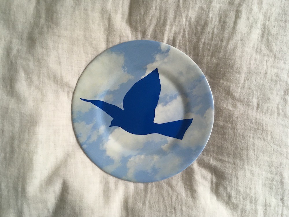 초현실주의 화가 르네 마그리트(René Magritte)의 대표작이 그려진 접시 시리즈 중 "OISEAU INVERSÉ 반전 새" 입니다.