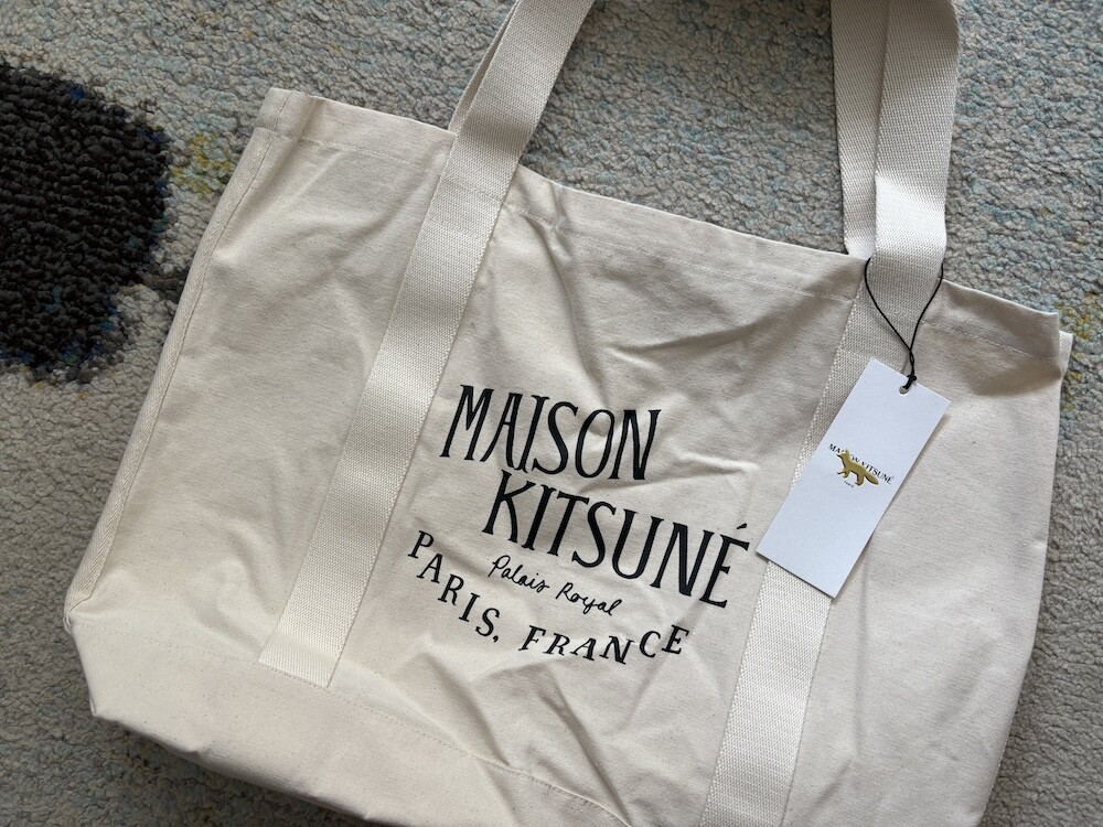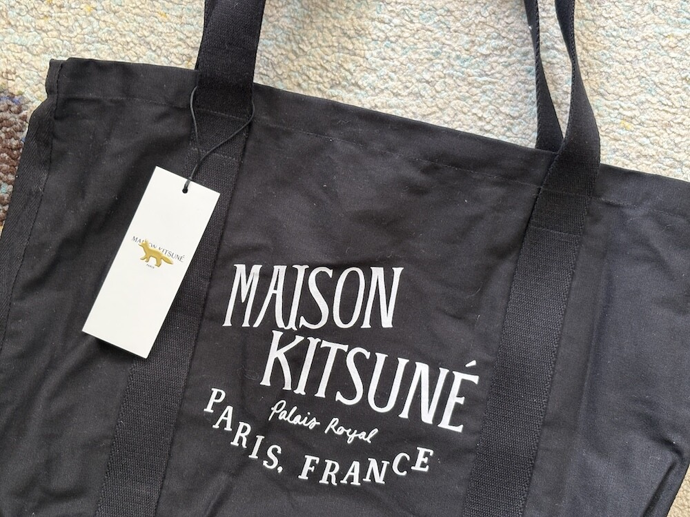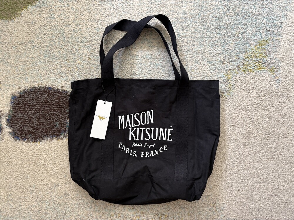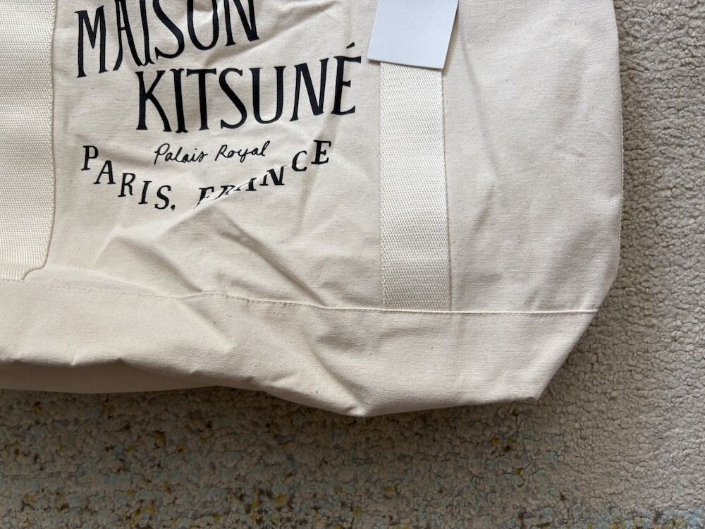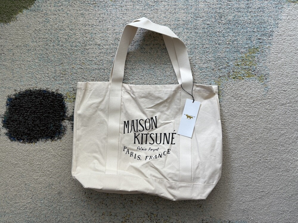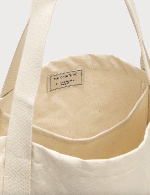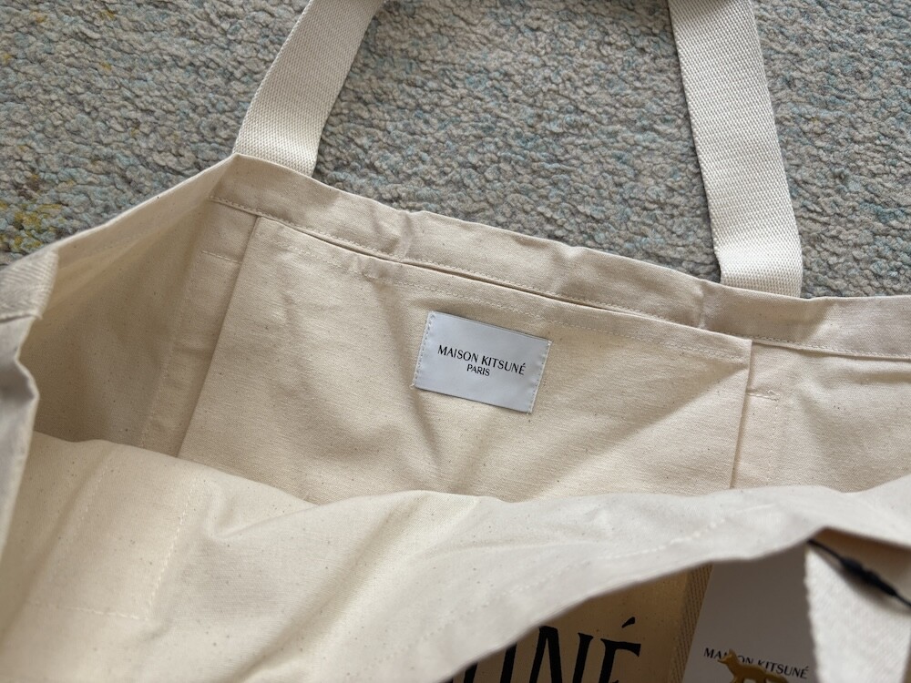 탄탄한 면 소재의 에코백입니다. '메종 키츠네 MAISON KITSUNÉ, 팔레 후아얄 Palais Royal, 파리 프랑스 PARIS,, FRANCE '라는 글씨만으로 키츠네 브랜드를 잘 보여준 디자인으로, 아마 메종 키츠네에서 가장 유명한 디자인이면서 스테디 셀러인 가방이 아닐까 싶어요. 안쪽에는 작은 주머니가 달려 있어 물건들을 나눠 넣을 수 있어서 좋아요.