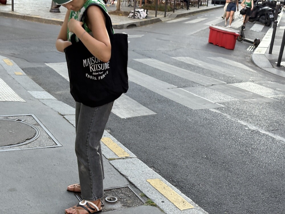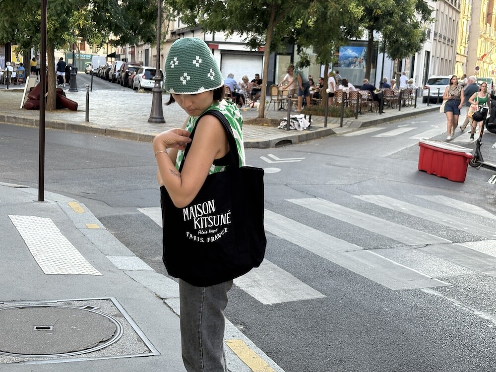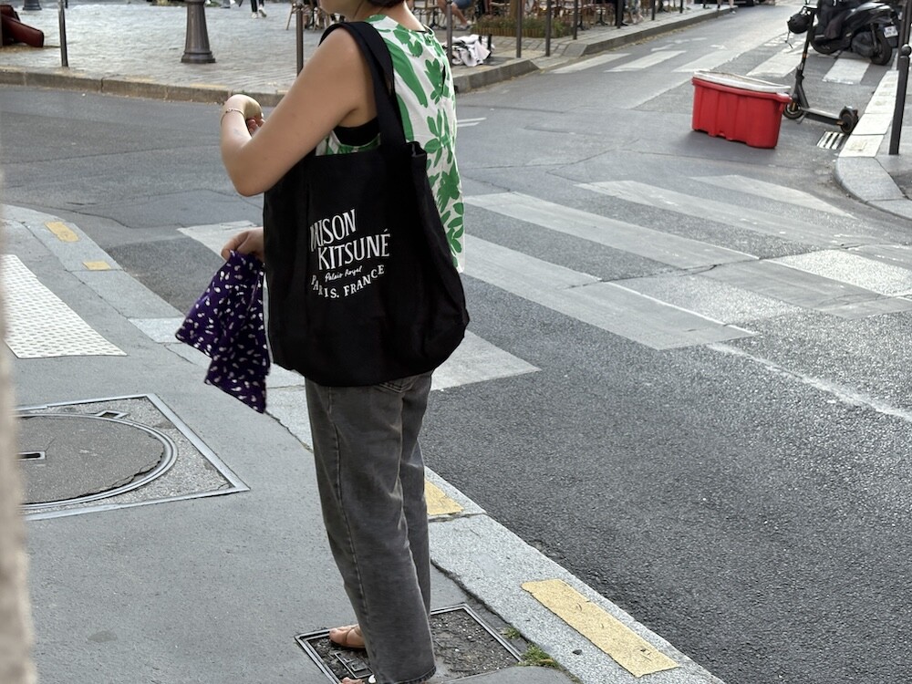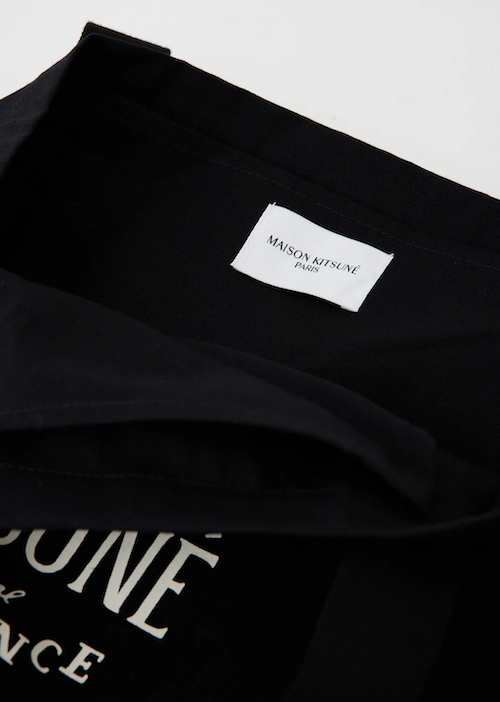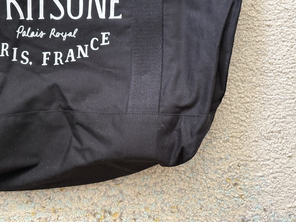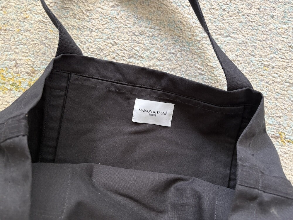 탄탄한 면 소재의 에코백입니다. '메종 키츠네 MAISON KITSUNÉ, 팔레 후아얄 Palais Royal, 파리 프랑스 PARIS,, FRANCE '라는 글씨만으로 키츠네 브랜드를 잘 보여준 디자인으로, 아마 메종 키츠네에서 가장 유명한 디자인이면서 스테디 셀러인 가방이 아닐까 싶어요. 안쪽에는 작은 주머니가 달려 있어 물건들을 나눠 넣을 수 있어서 좋아요.